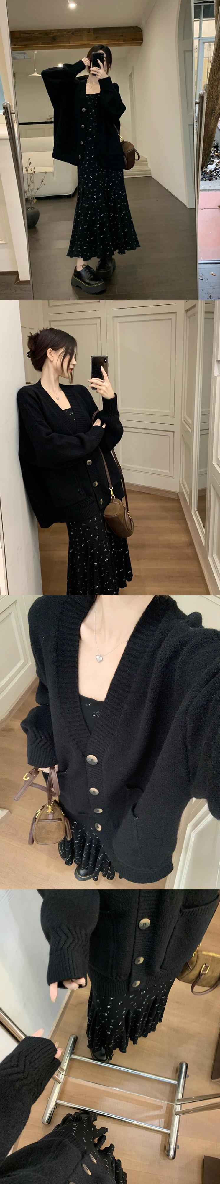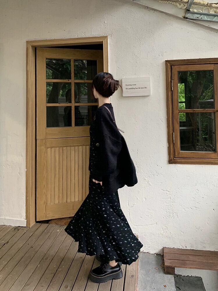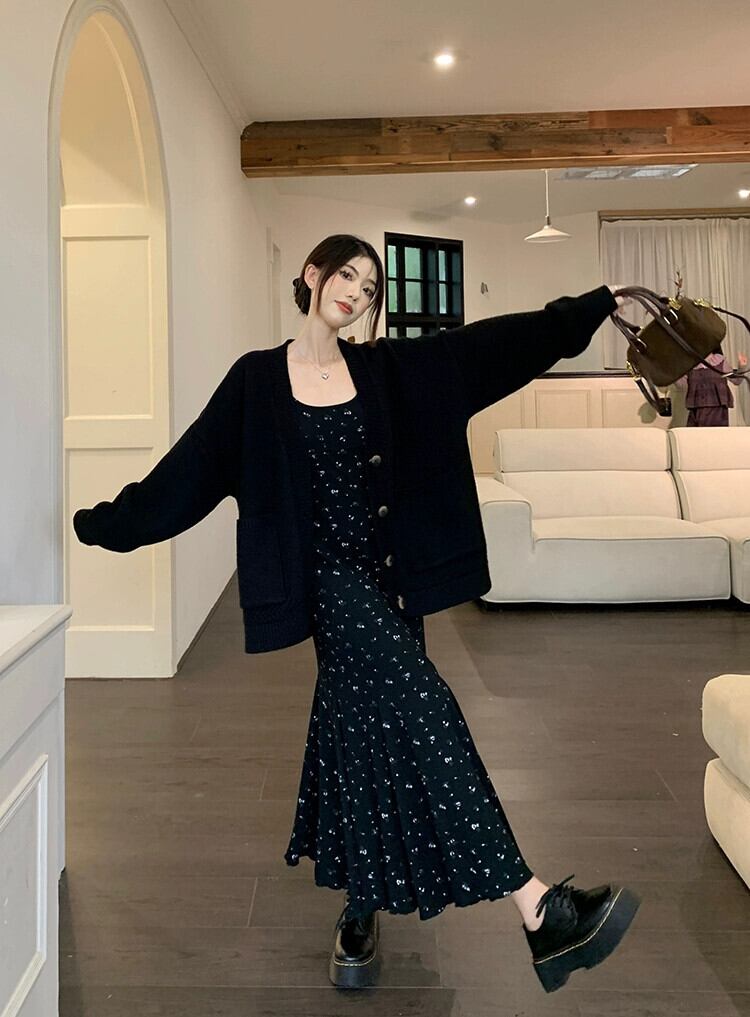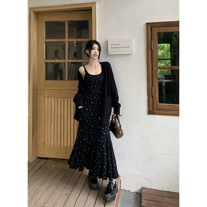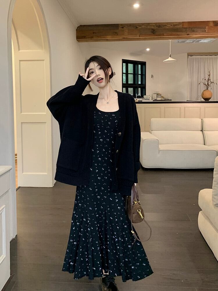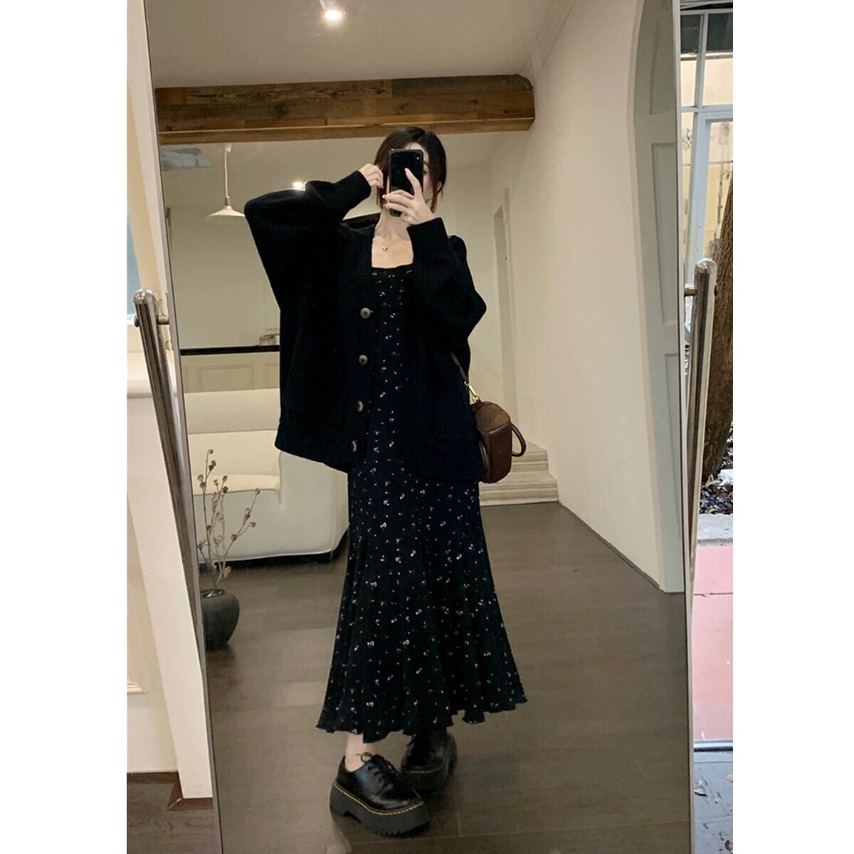 ヘップバーンスタイルミッドレングス花サスペンダードレス長袖セータージャケット女性秋 2023 新しいファッションスーツ ロング オータム 秋物 花柄 missk23027138177