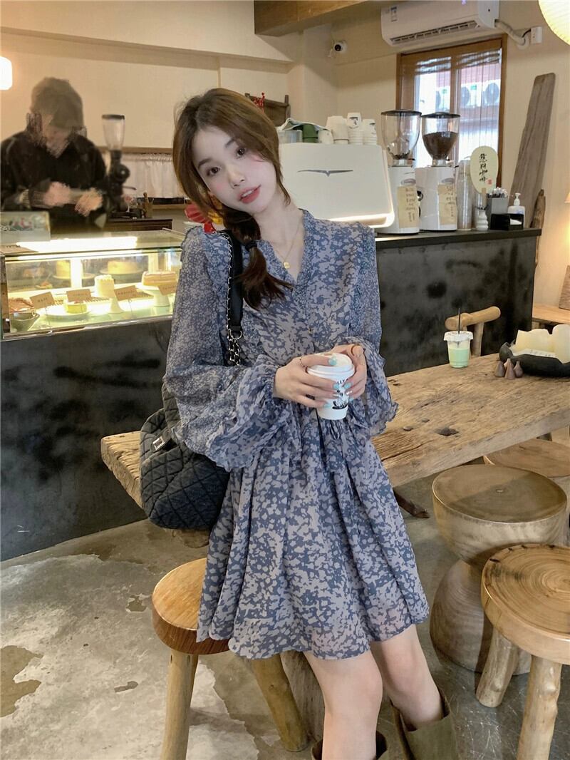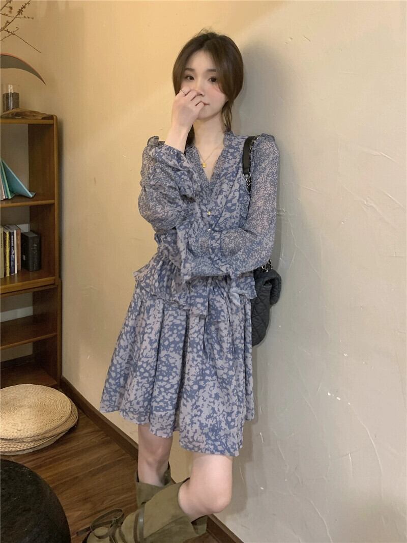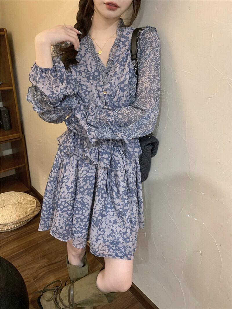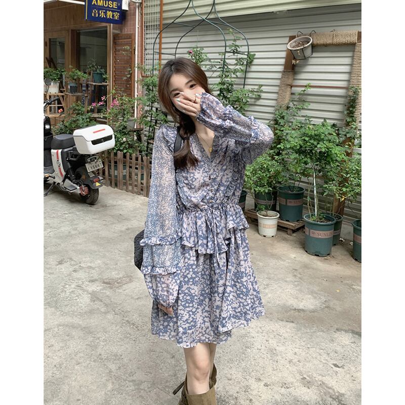 フレンチヘイズブルー花柄 V ネックドレス秋 2023 新デザインウエスト痩身ティーブレイクショートスカート女性 オータム 秋物 Vネック missk49518152761