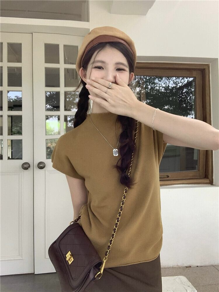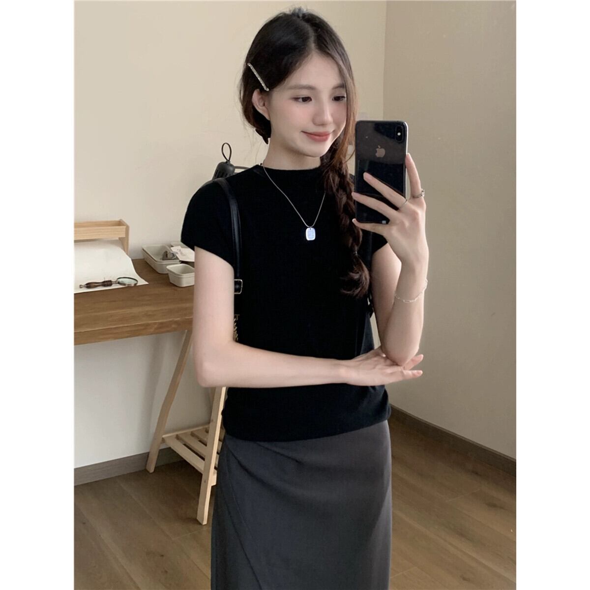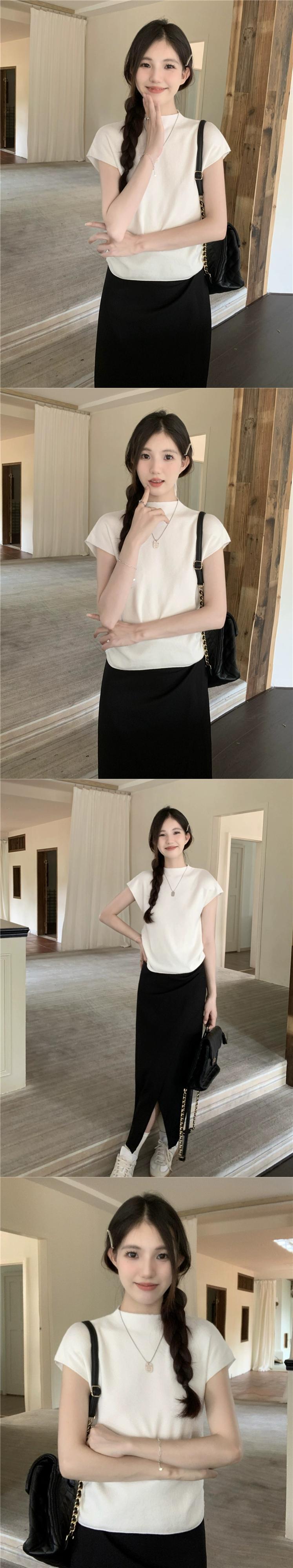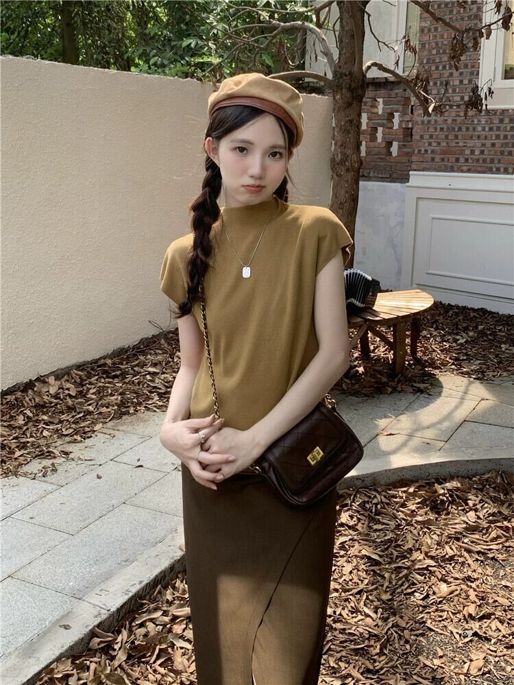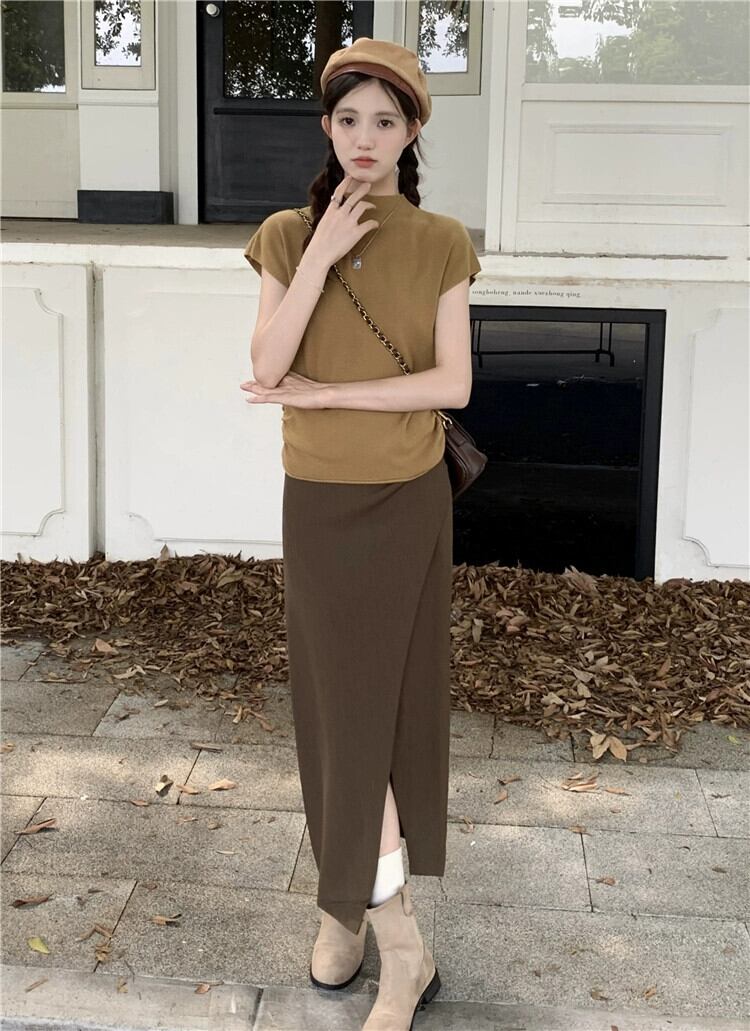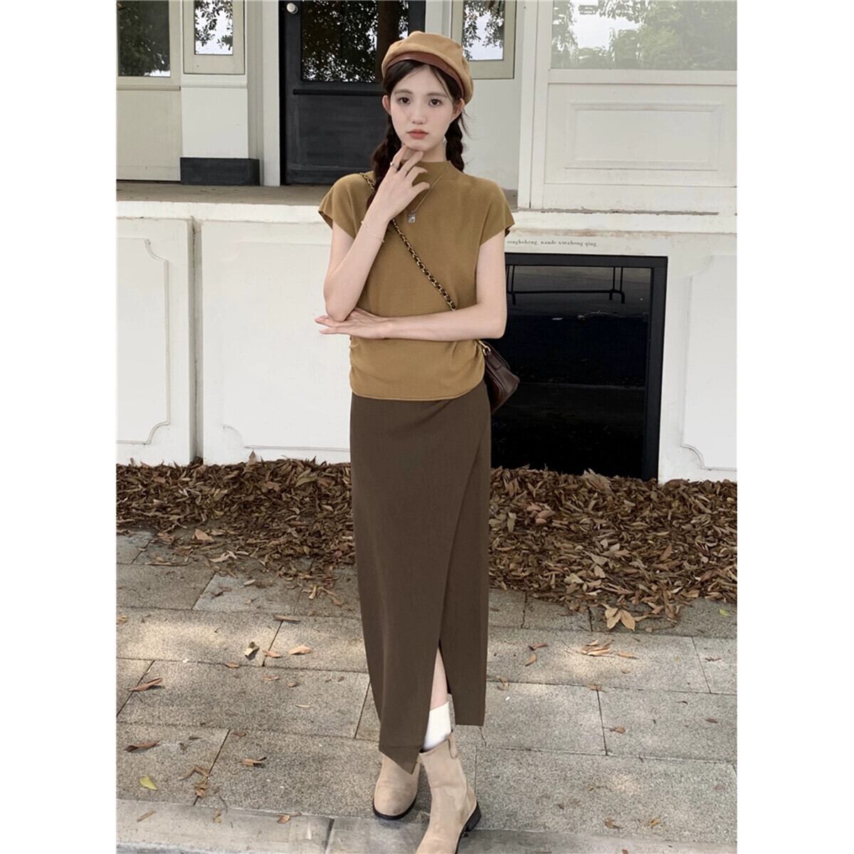 ハーフタートルネック無地ルーズ半袖 Tシャツミッドレングススリットスカート女性秋 2023 新ファッションスーツ オータム 秋物 ソリッドカラー missk18751709182