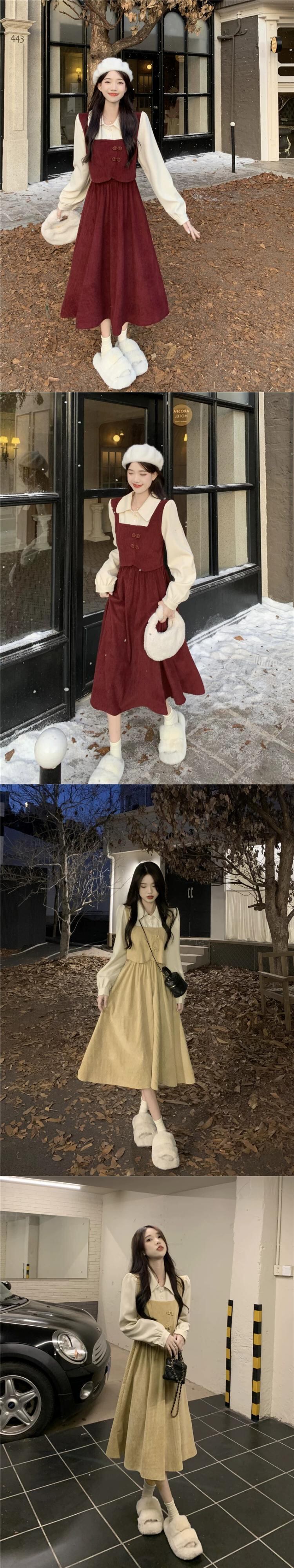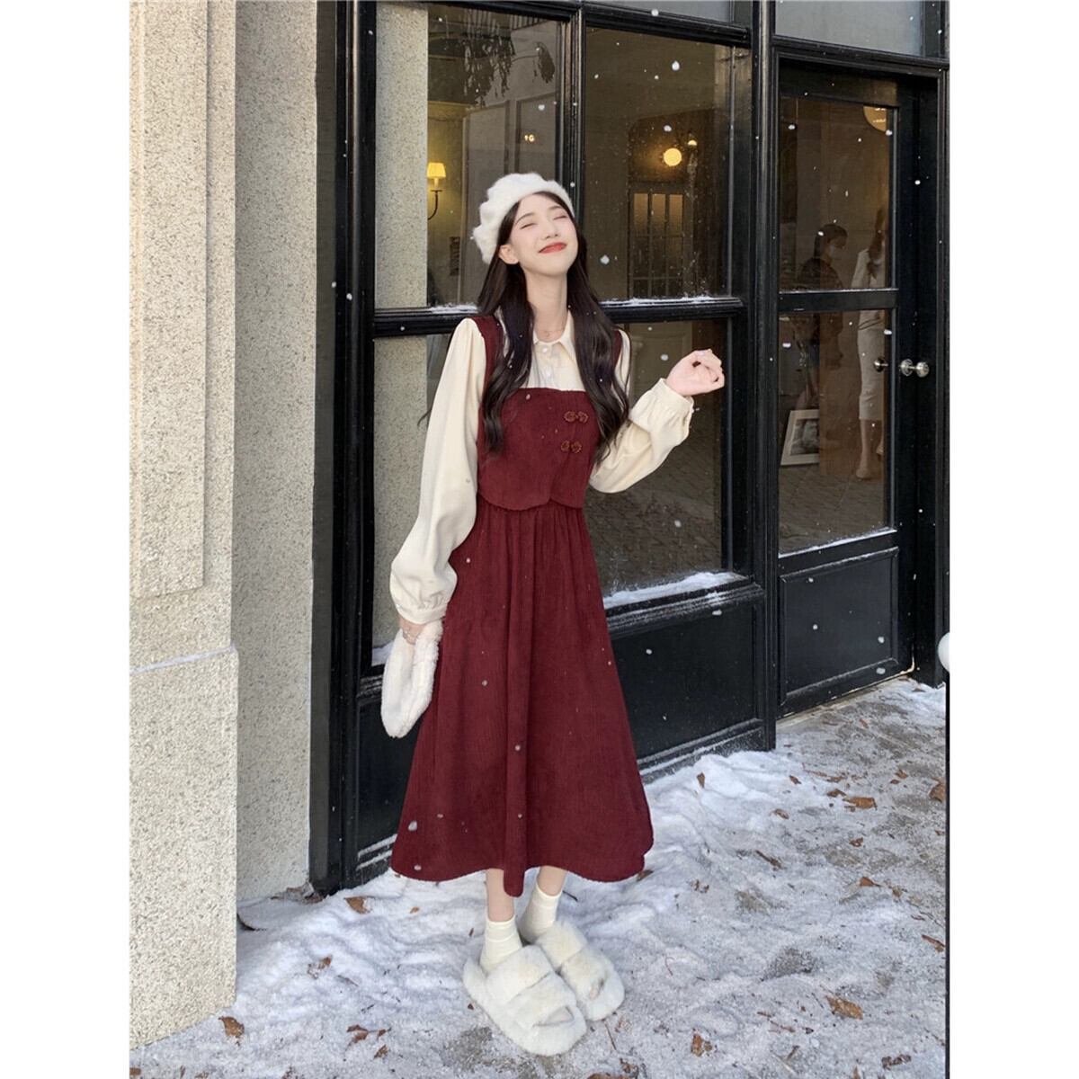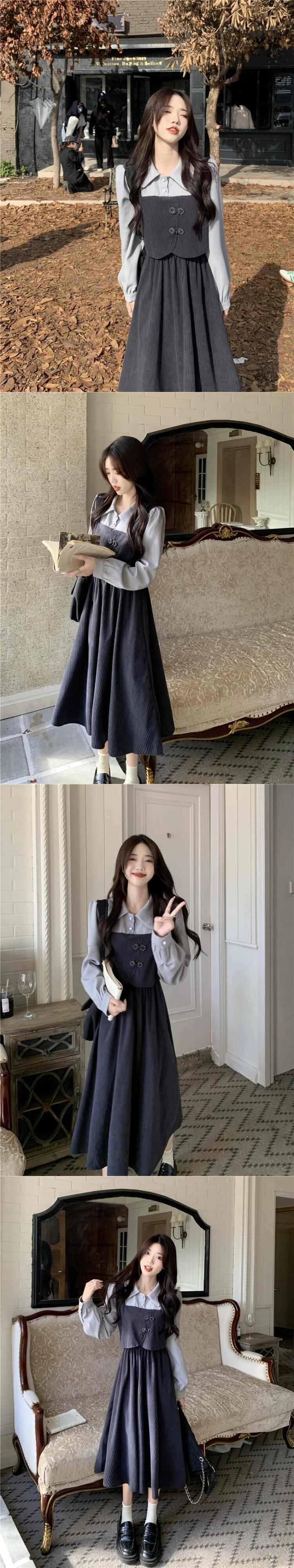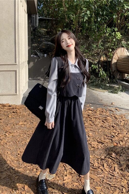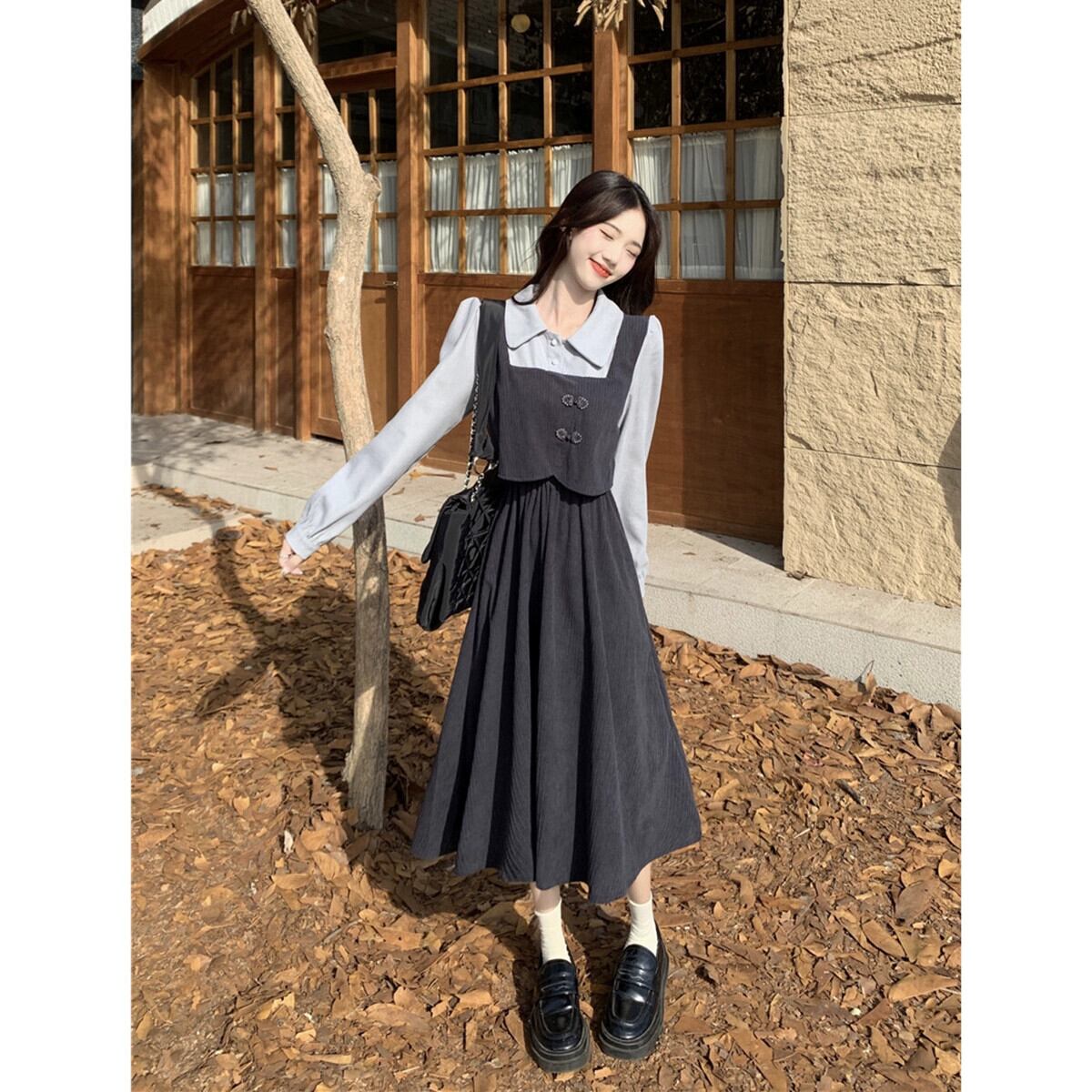 偽のツーピース長袖ドレスの女性 2023 秋の新しいレトロなバックルウエスト痩身スプライシングミッドレングススカート ロング オータム 秋物 missk43003984645