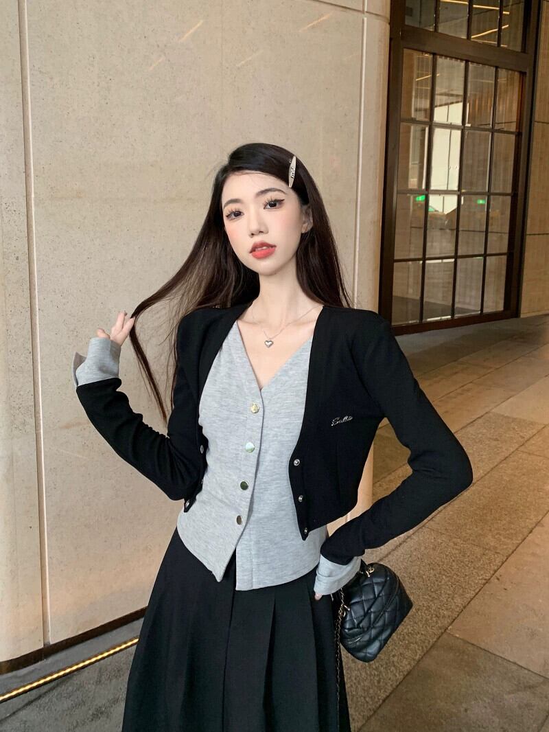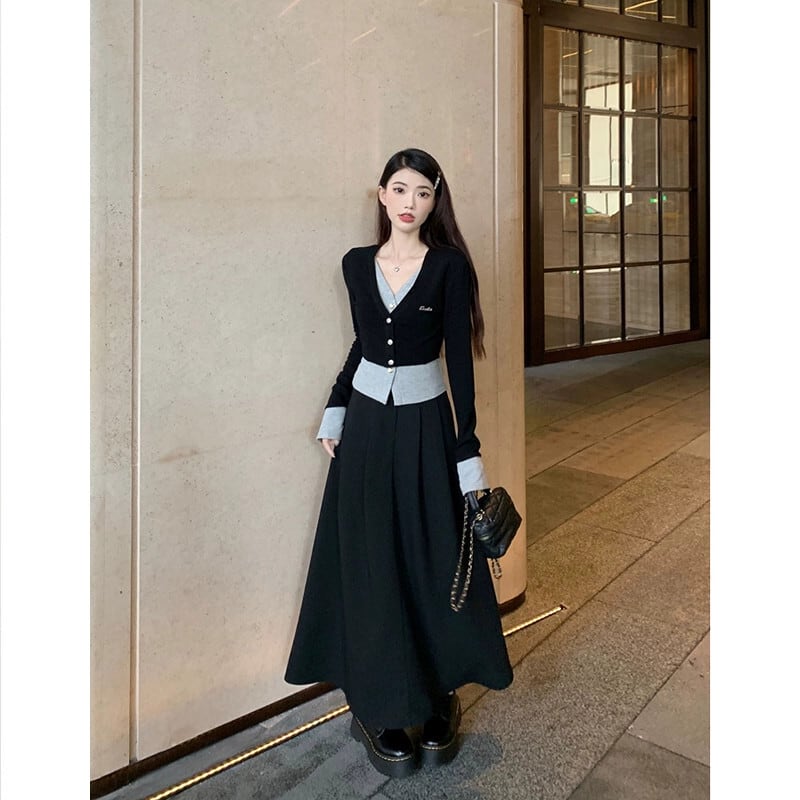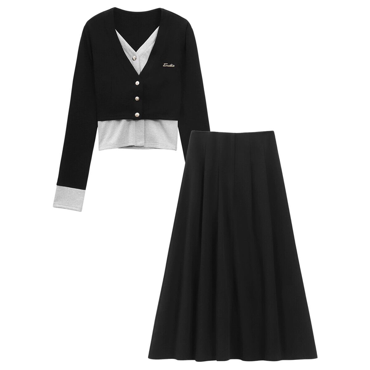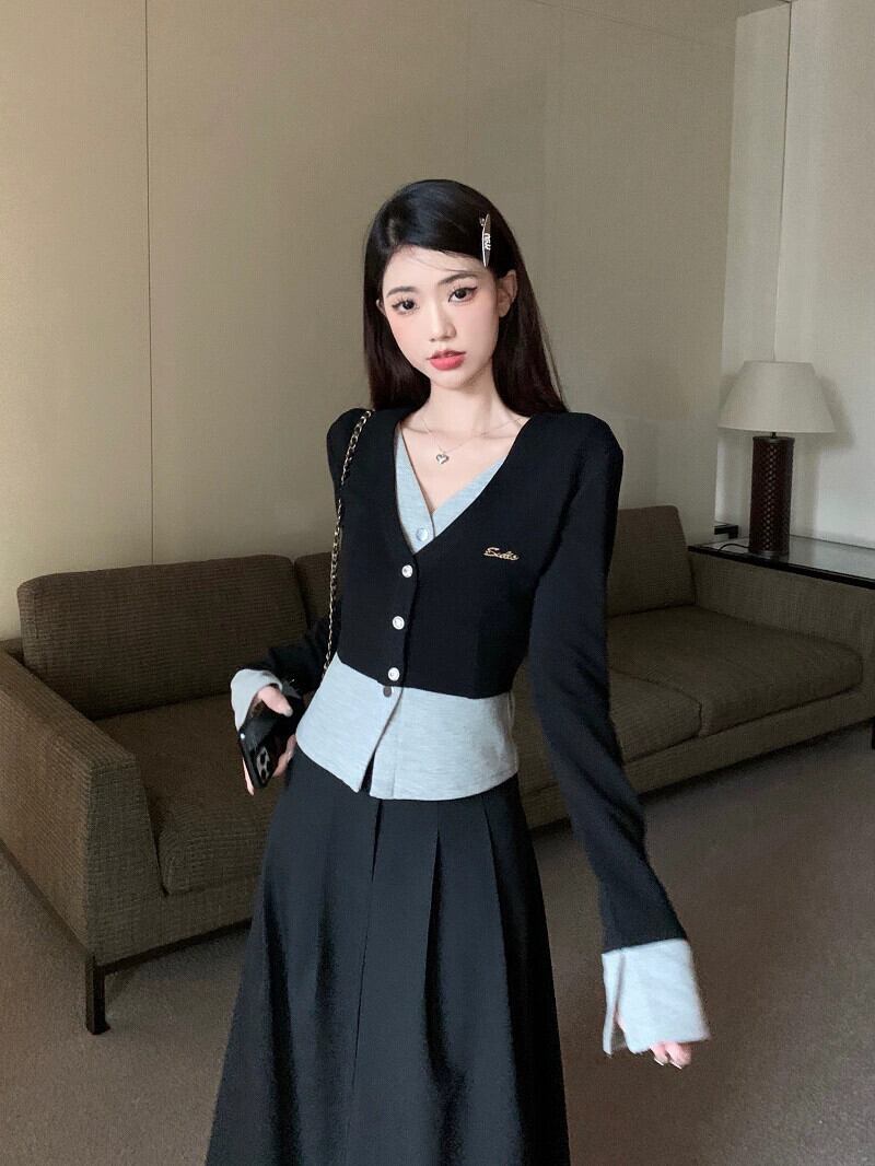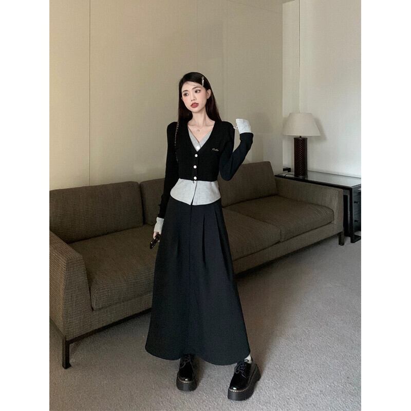 偽ツーピース V ネック気質長袖ニットカーディガンハイウエストハーフレングススカート女性秋 2023 新しいファッションスーツ ロング オータム 秋物 Vネック missk6292615208