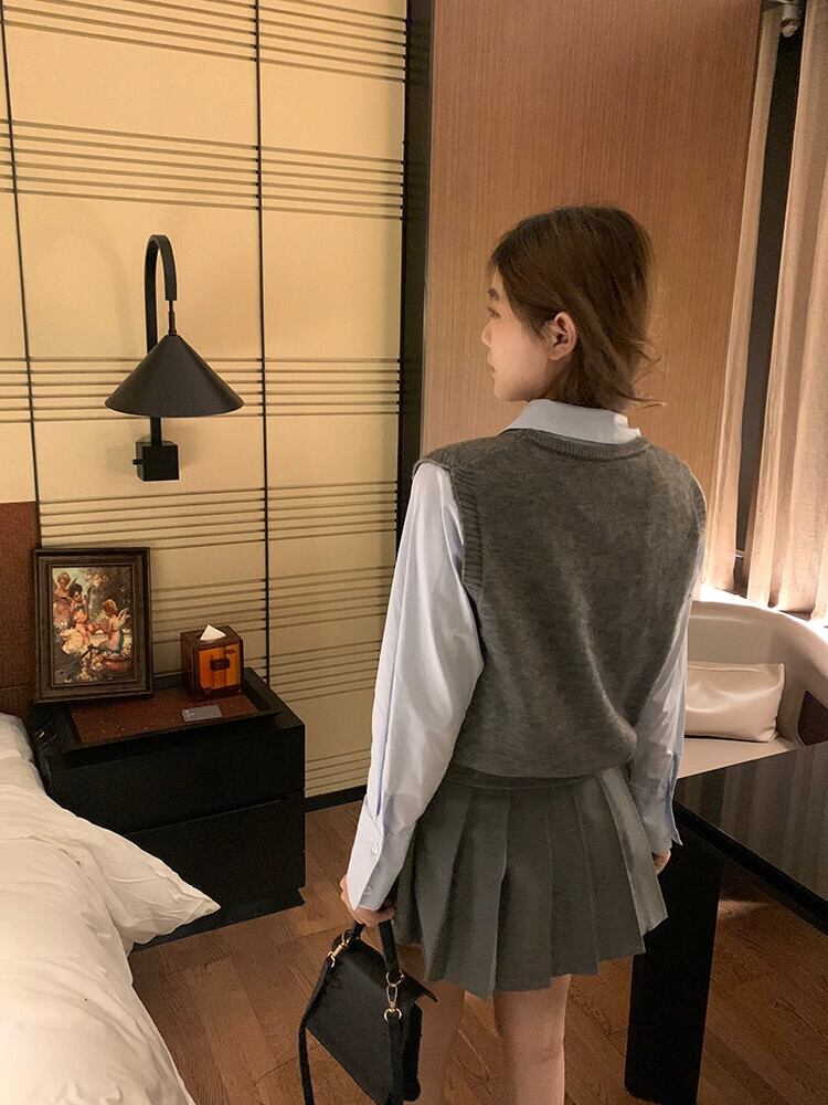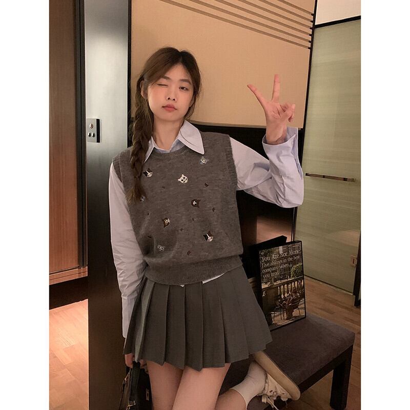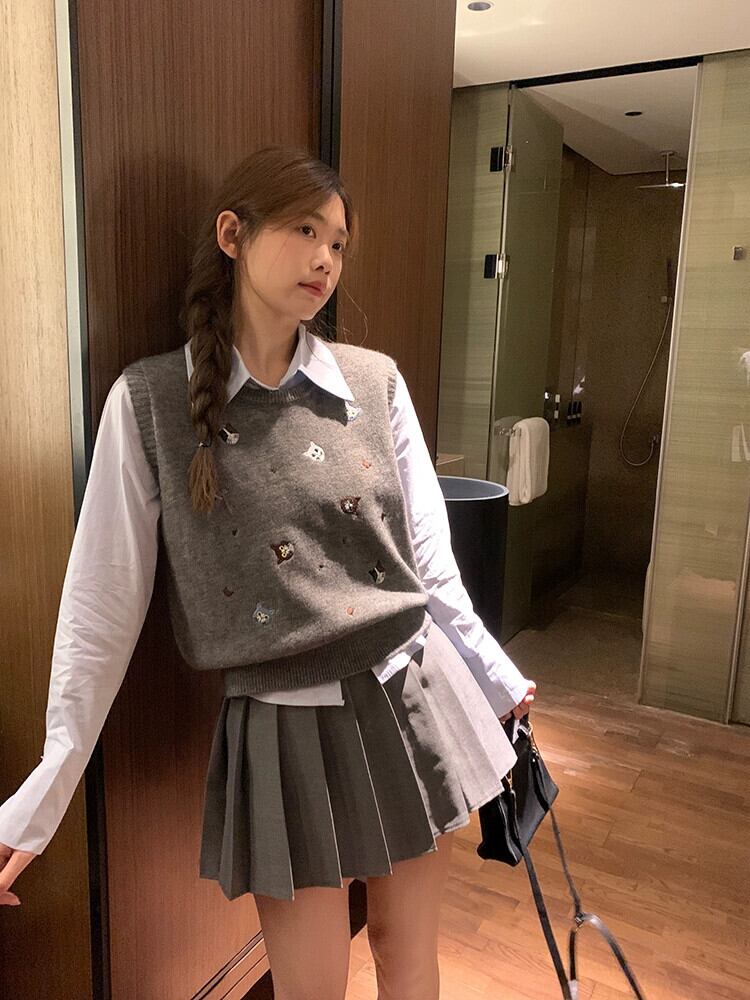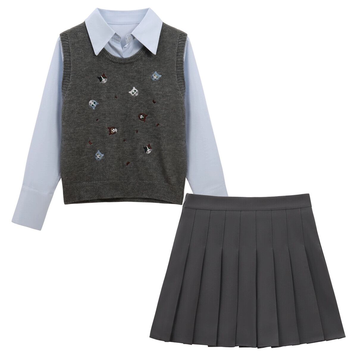 色:グレースカート,グレーの猫のベスト,青いシャツ