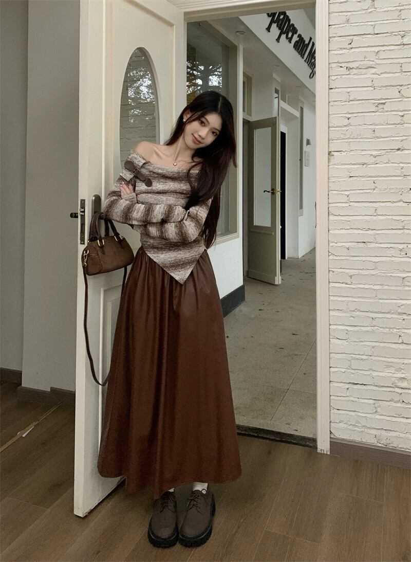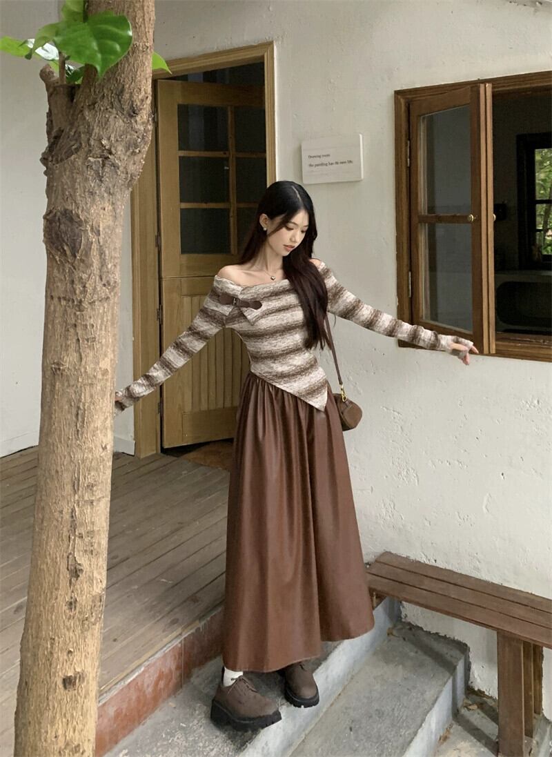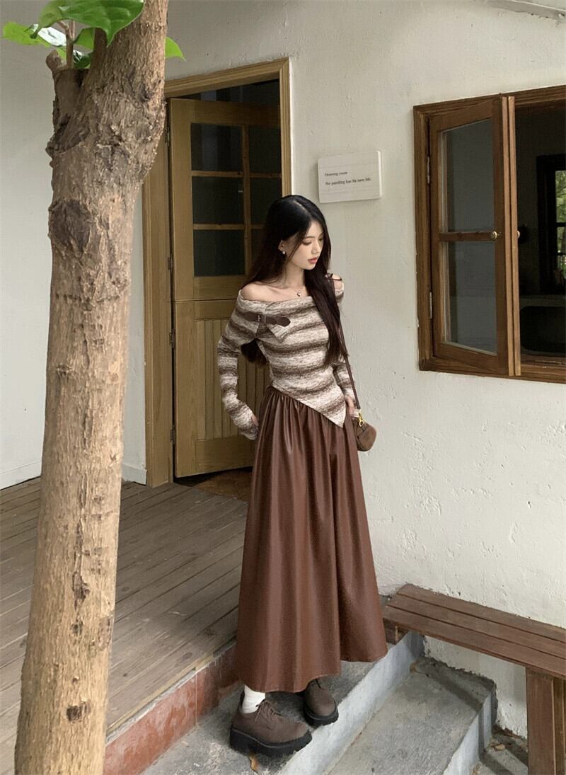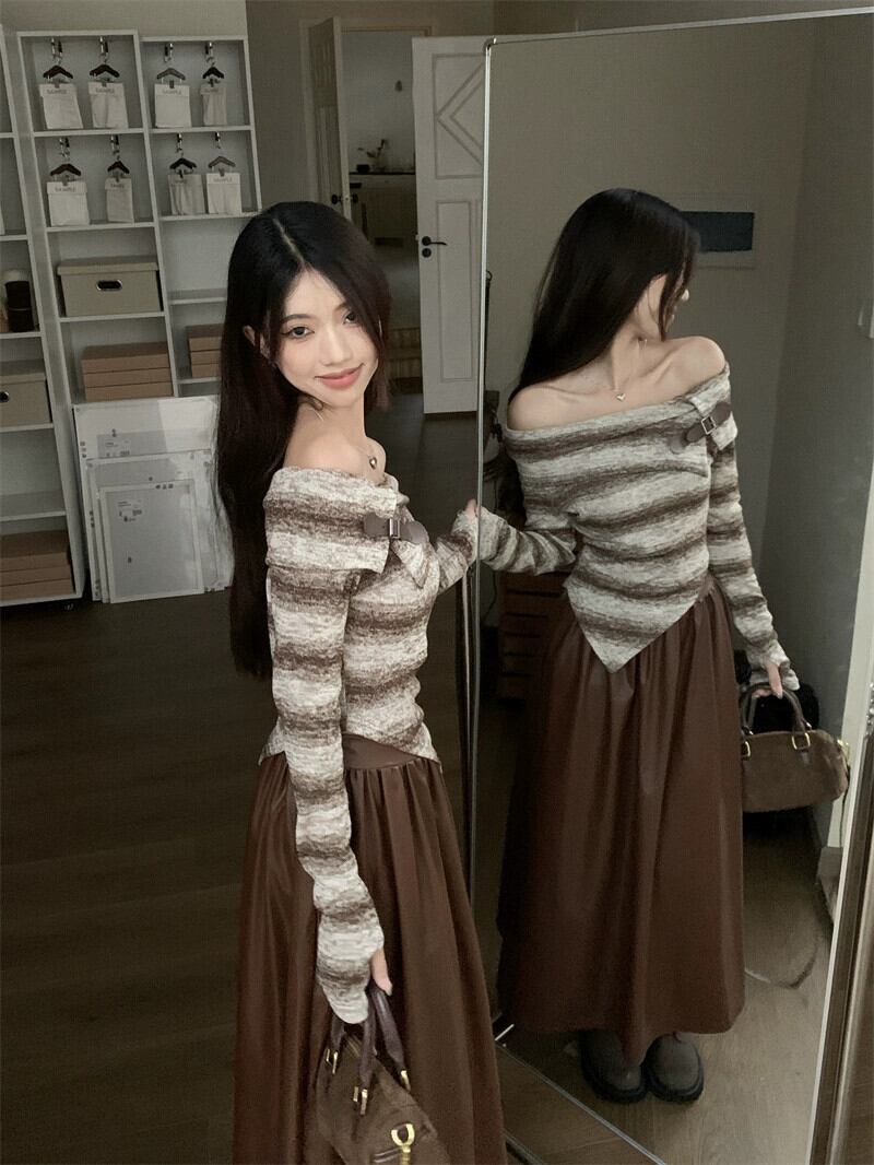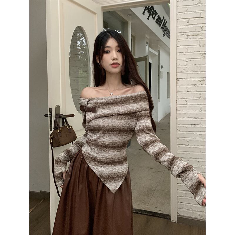 2023年秋のストライプの長袖セーターの女性の新しいスタイルの不規則なワンショルダーの甘くてスパイシーな痩身オフショルダートップ ロング 大人ガーリー スウィート キュート カジュアル オータム 秋物 missk72773868575