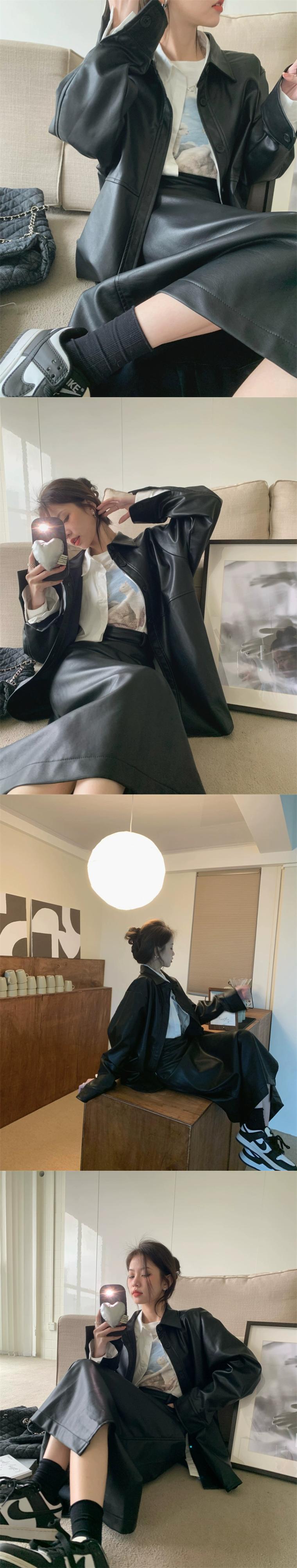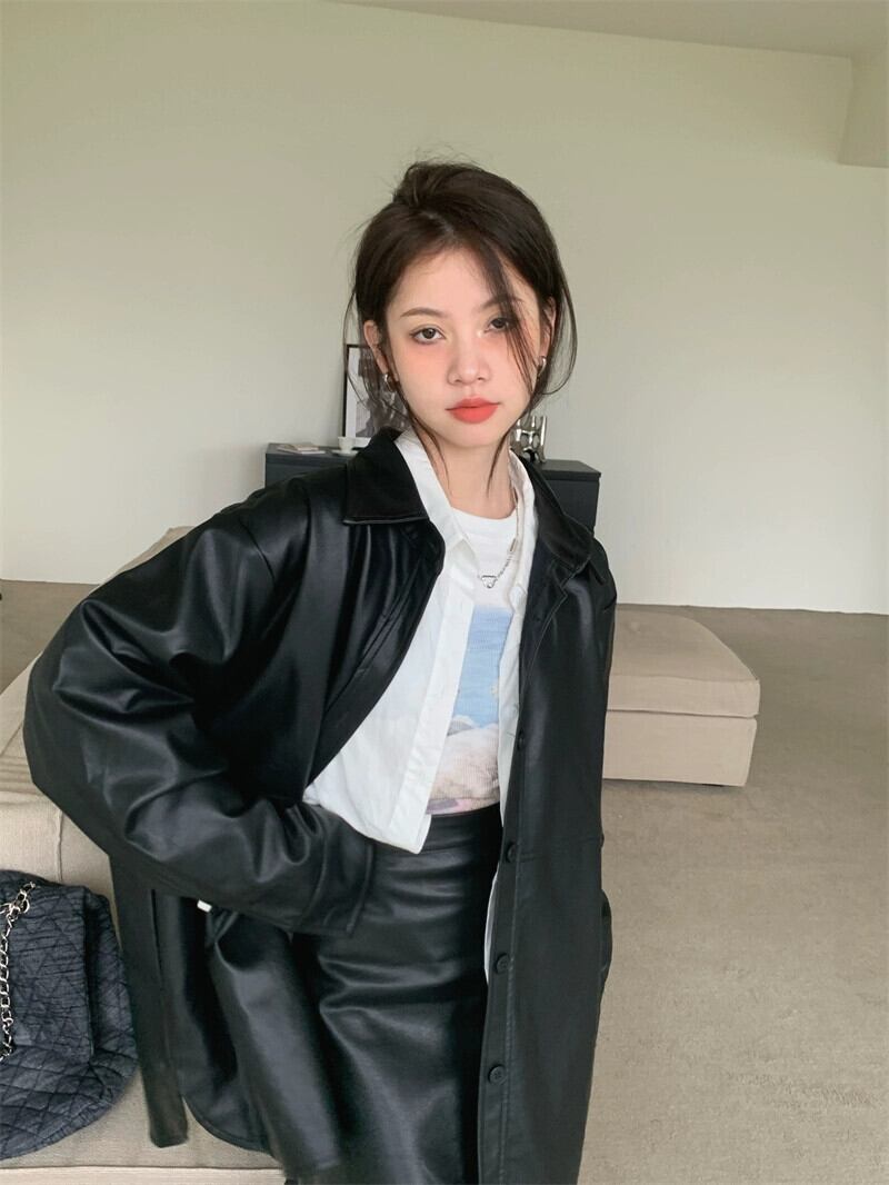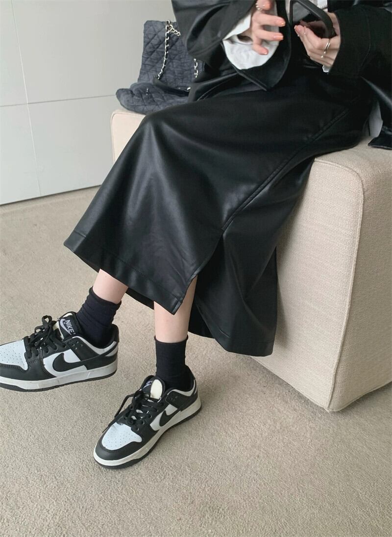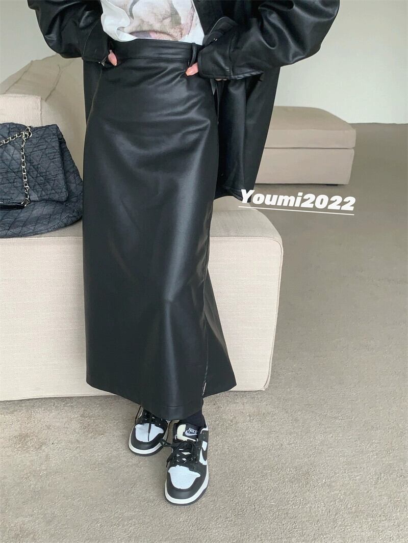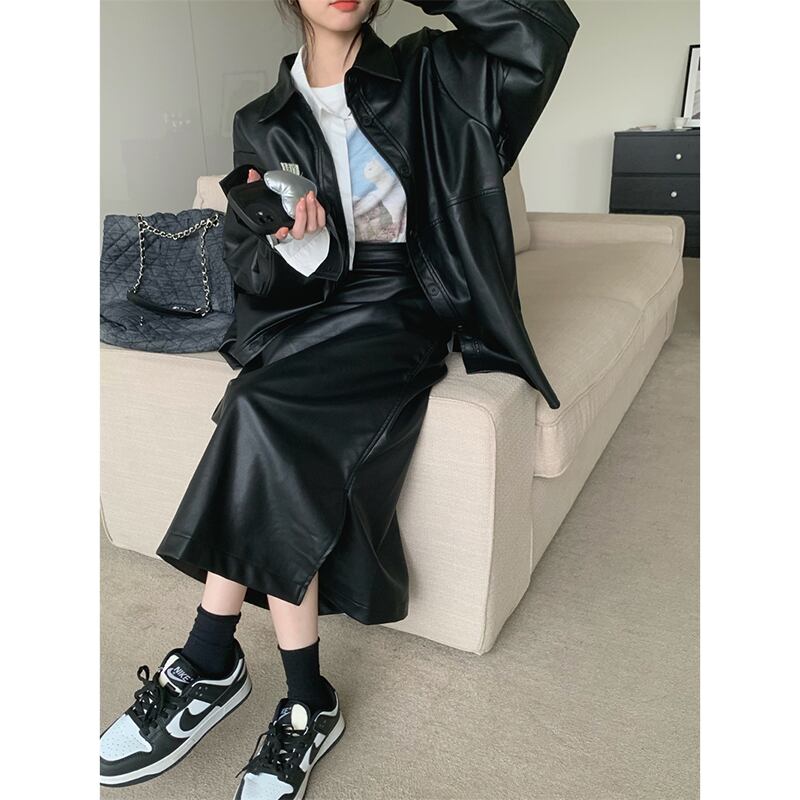 香港スタイルのレトロな気質長袖レザージャケットスリットハイウエストスカート女性秋の新ファッションツーピースセット ハイウェスト ロング オータム 秋物 missk78967100250
