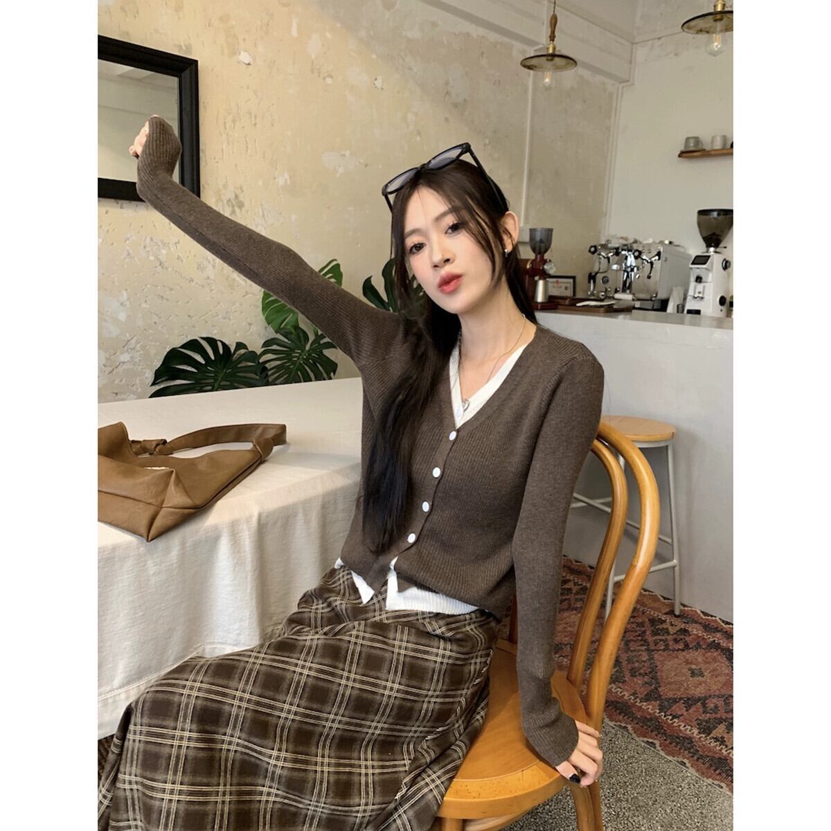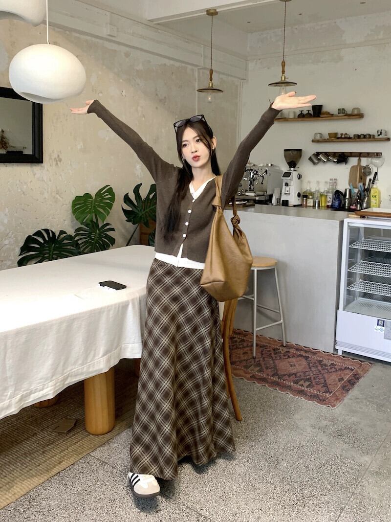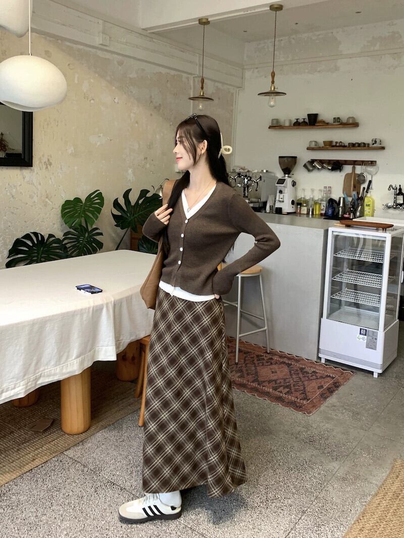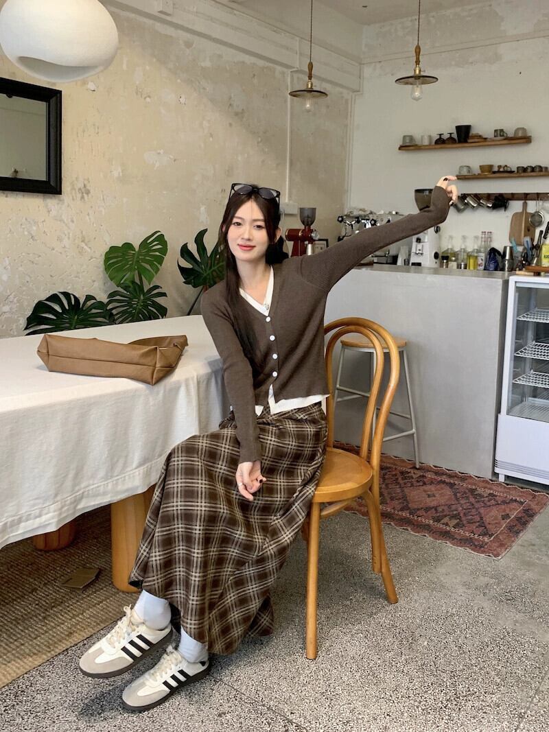 バージョンの怠惰な偽ツーピース長袖セーターハイウエストチェック柄スカート女性秋の新ファッションツーピースセット ロング オータム 秋物 missk91852248029
