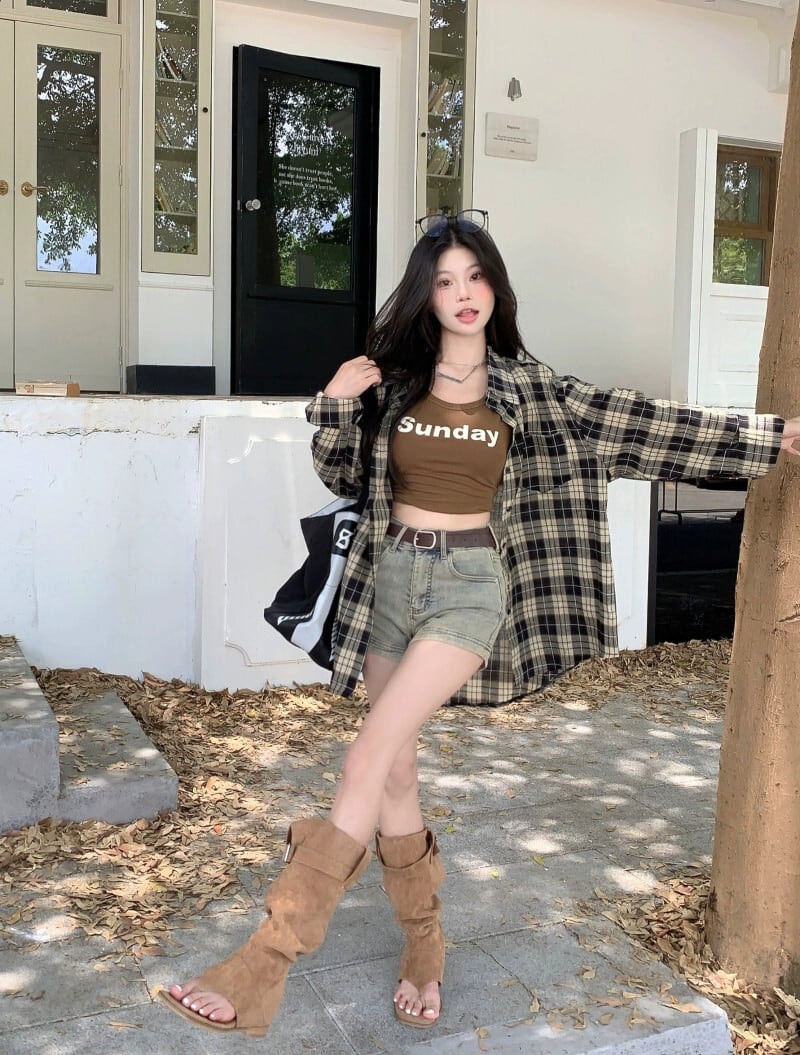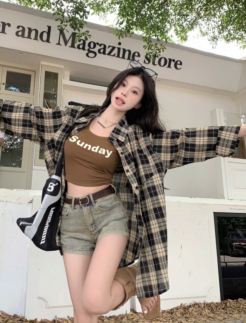レトロルーズミッドレングス長袖チェック柄シャツショート Tシャツ女性秋 2023 新しいファッションスーツ ロング オータム 秋物 missk39574514233