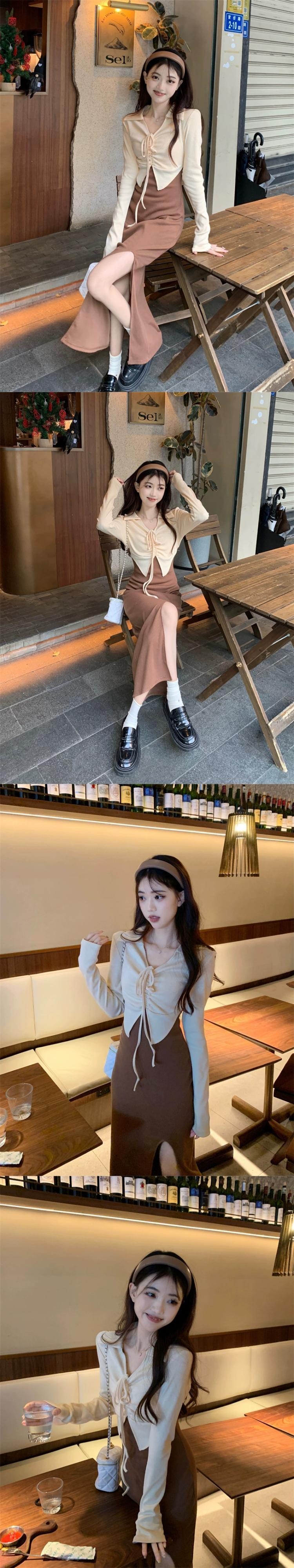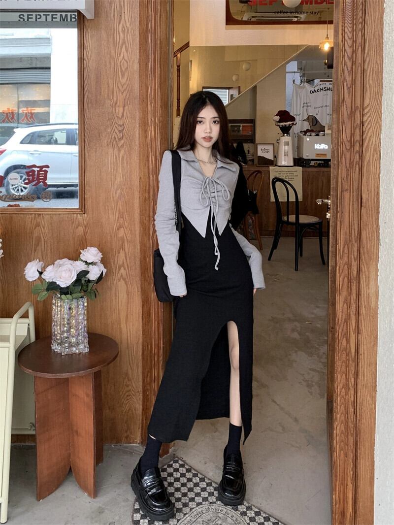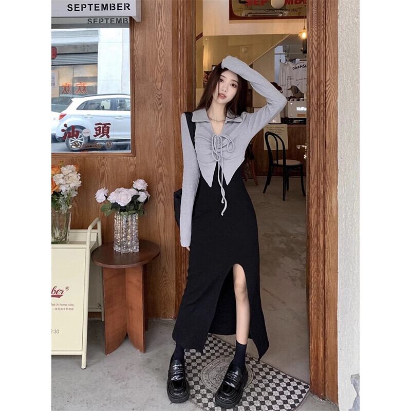 フランスの甘いネクタイフェイクツーピース長袖ドレスの女性の秋の新しいレトロなウエストデザインステッチミッドレングススカート ロング 大人ガーリー スウィート キュート カジュアル オータム 秋物 missk29147011363