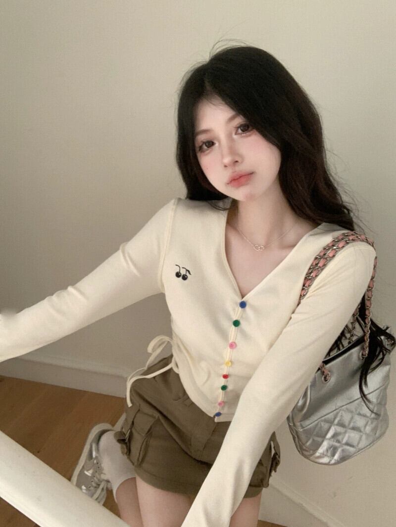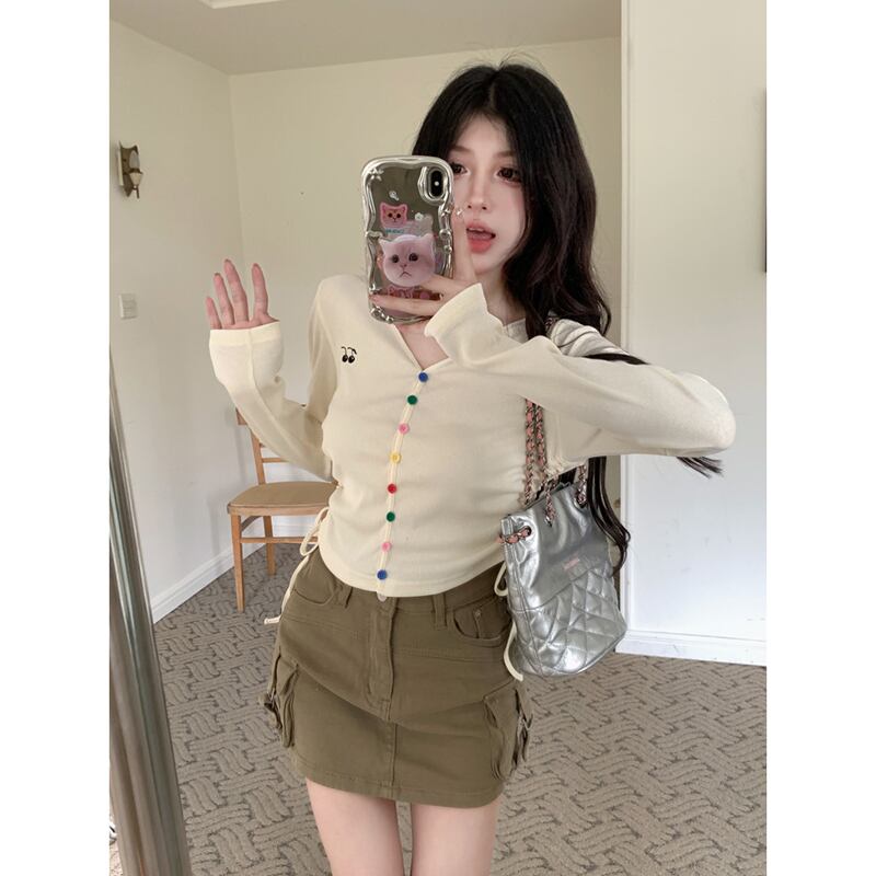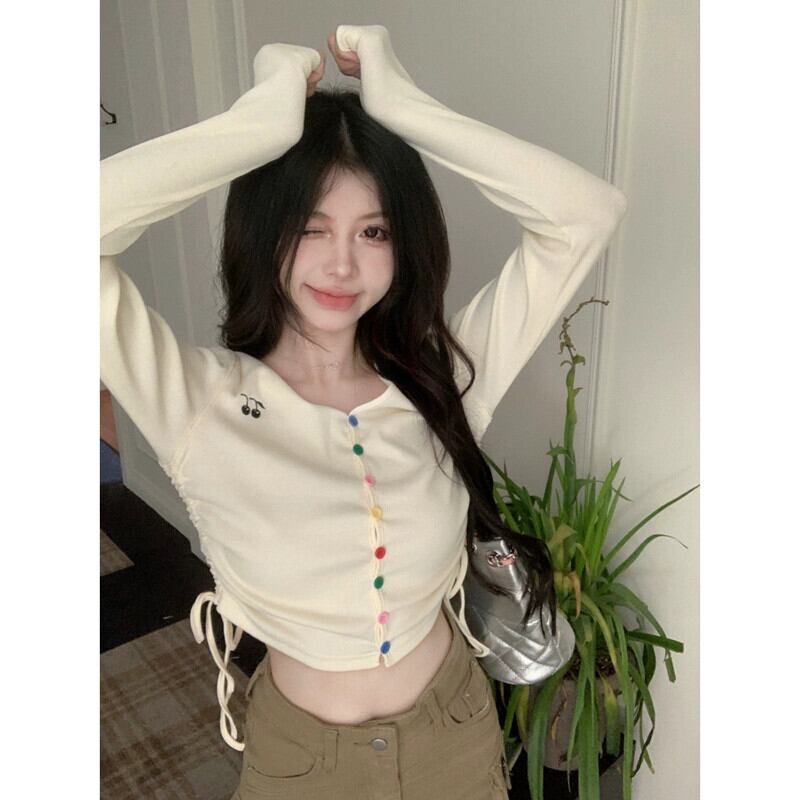 シックなレインボーボタン巾着ショート長袖 Tシャツ 2023 初秋の新デザイン V ネックネクタイアウタートップ女性 ロング オータム 秋物 Vネック missk63015061422