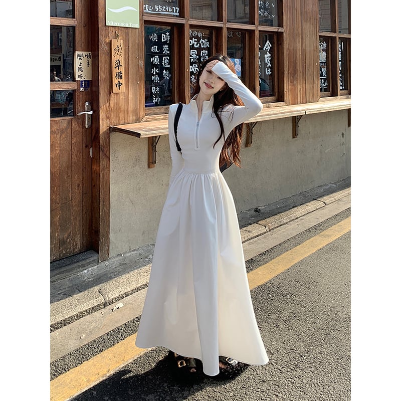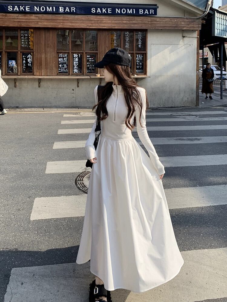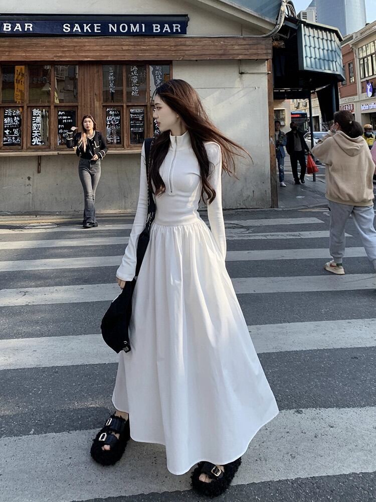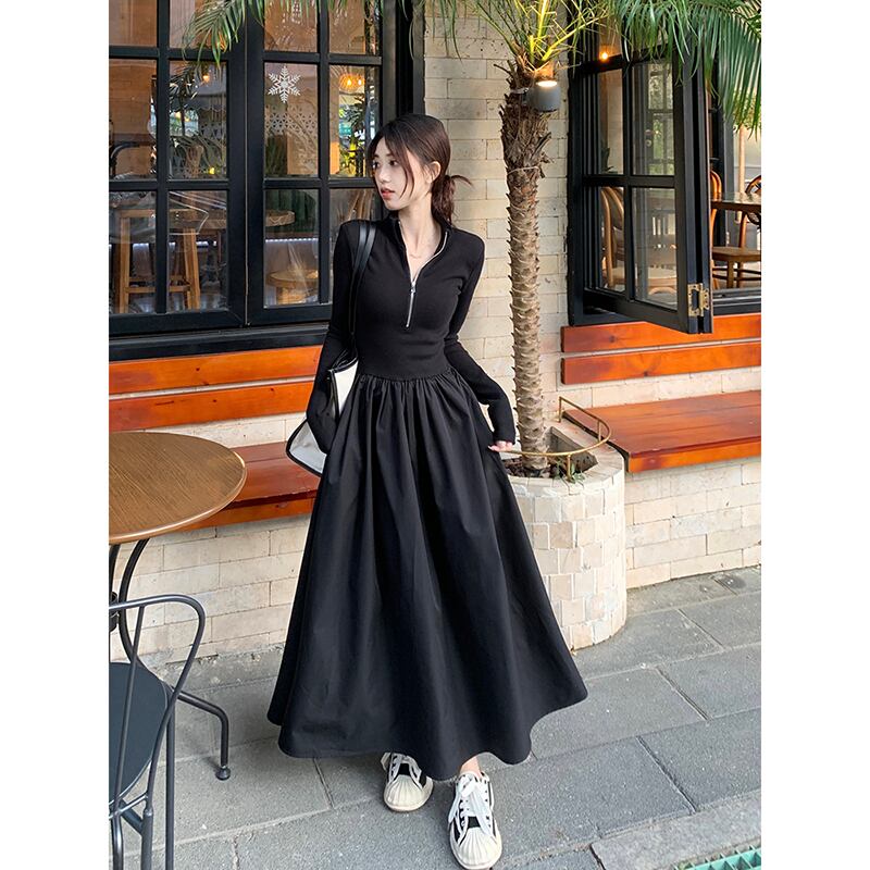 ニットスプライシング長袖ドレス女性秋バージョン 2023 新スタイルウエスト痩身甘塩っぱいロングスカート 大人ガーリー スウィート キュート カジュアル オータム 秋物 missk15692128087
