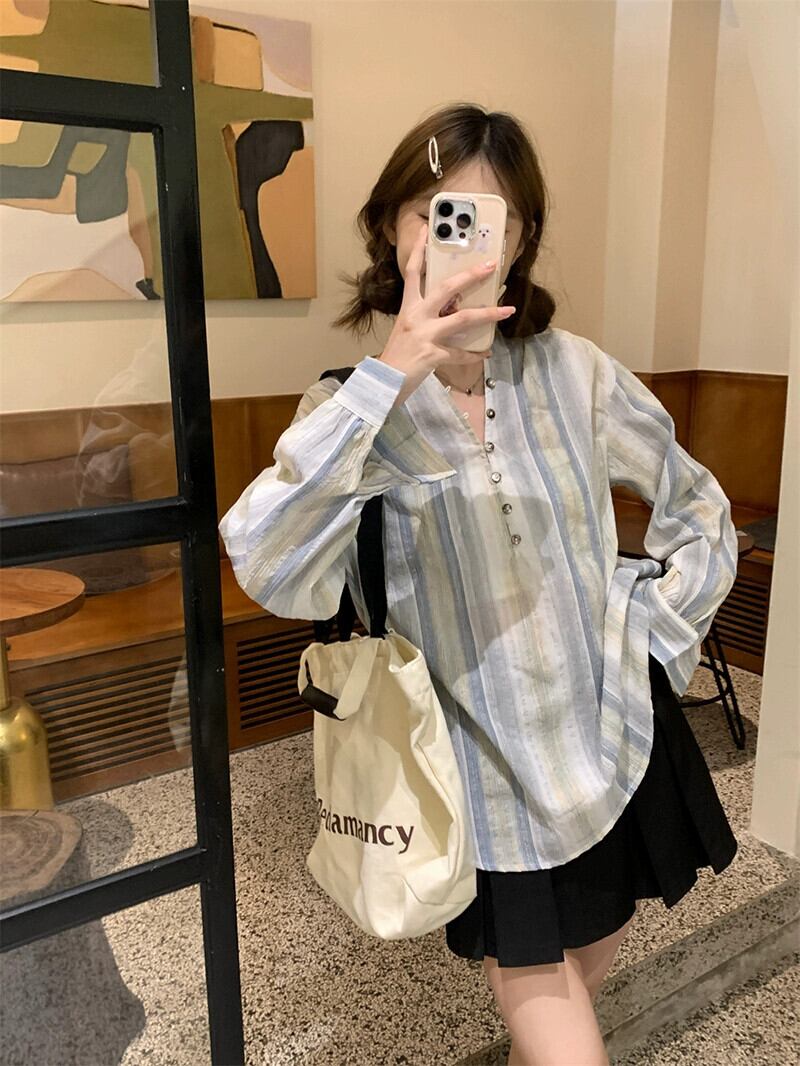 2023 秋の新ニッチシンプルなグラデーション縦縞ルーズで多用途のファッショナブルなラウンドネック長袖シャツ女性 ロング オータム 秋物 Oネック ストライプ missk4434912864