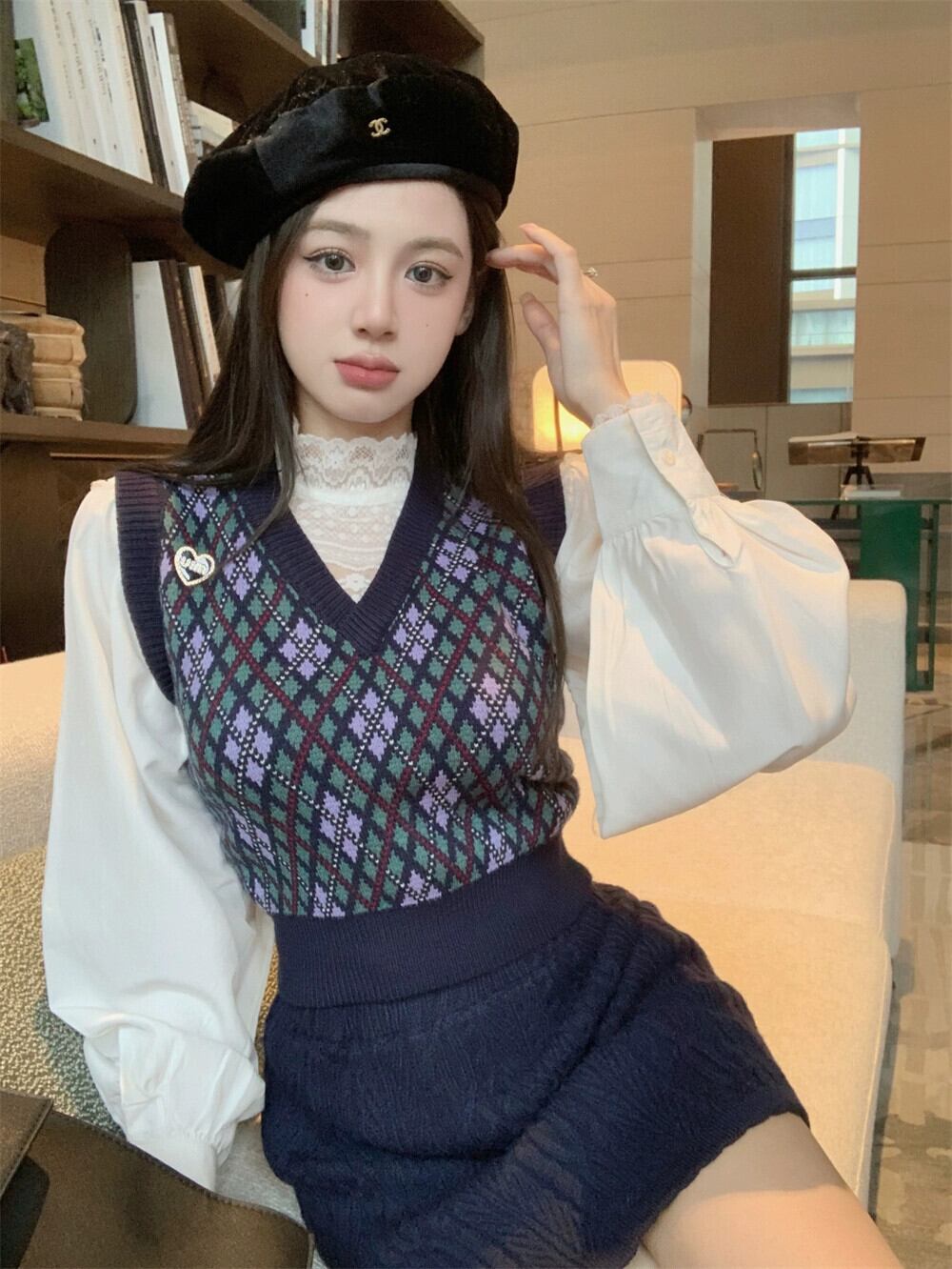 色:白のシャツ,黒スカート,ダークブルーのチョッキ