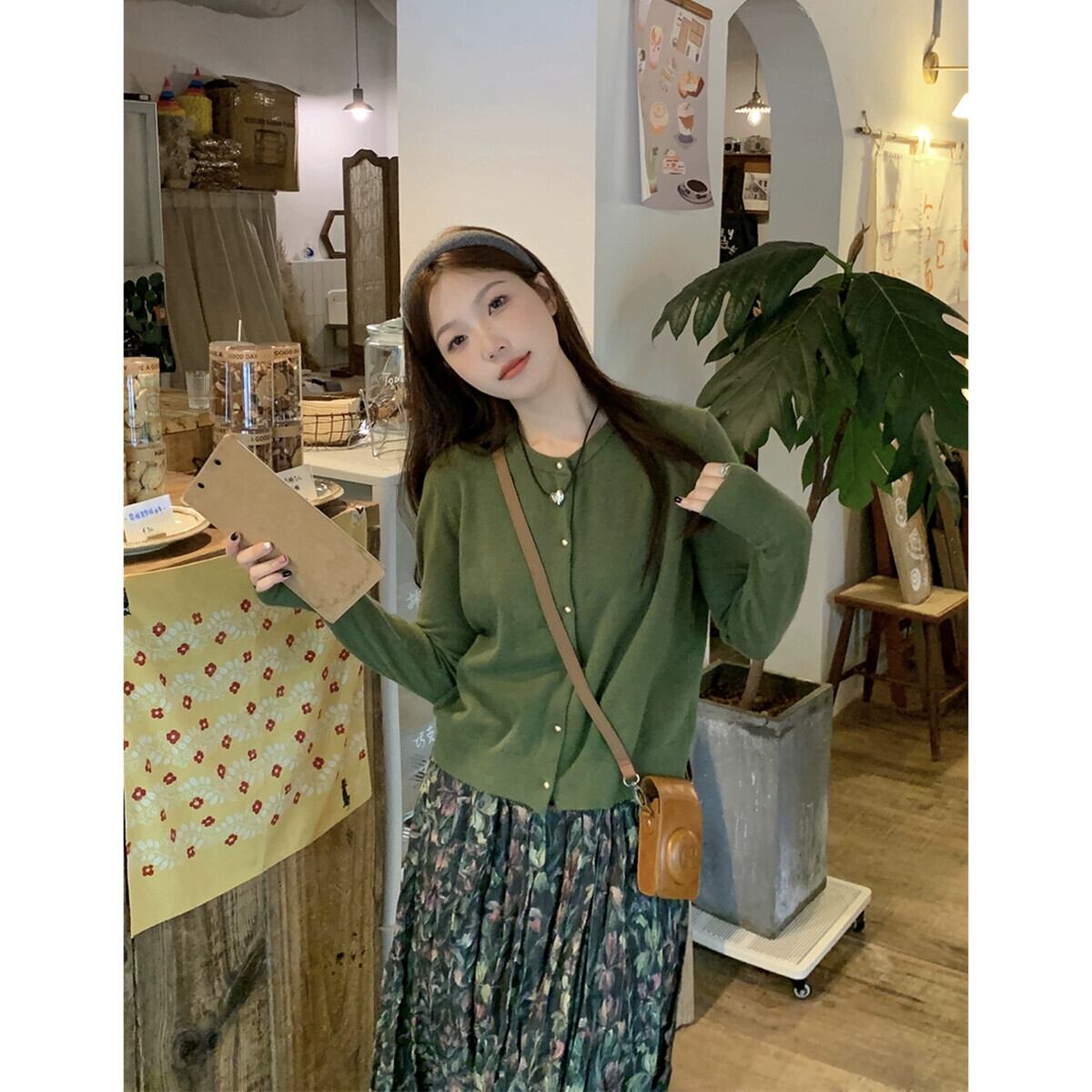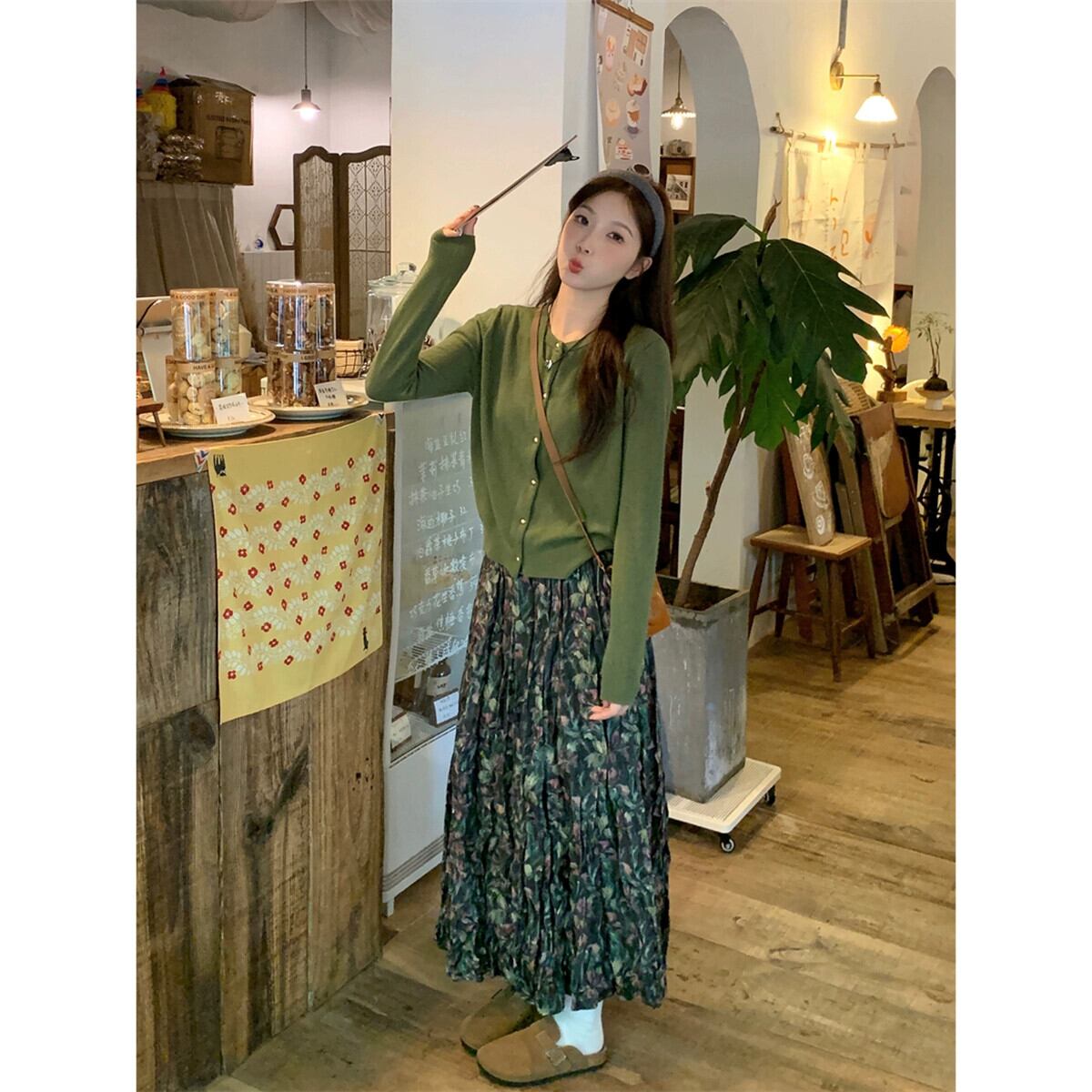 色:緑のセーター,グリーンフローラルスカート,ウコンセーター,黄色い花のスカート