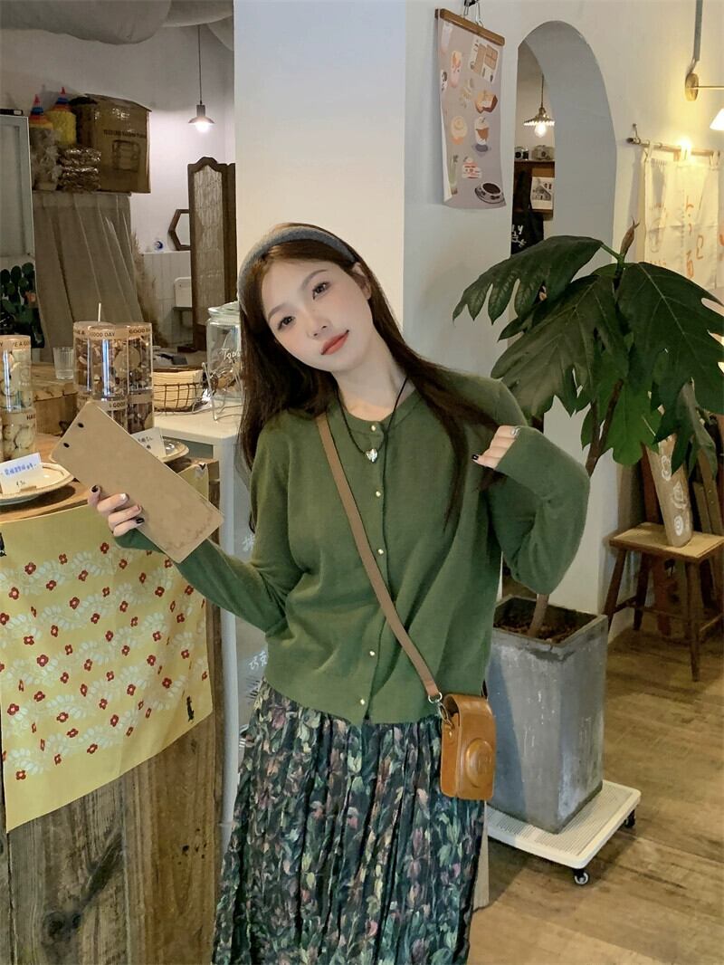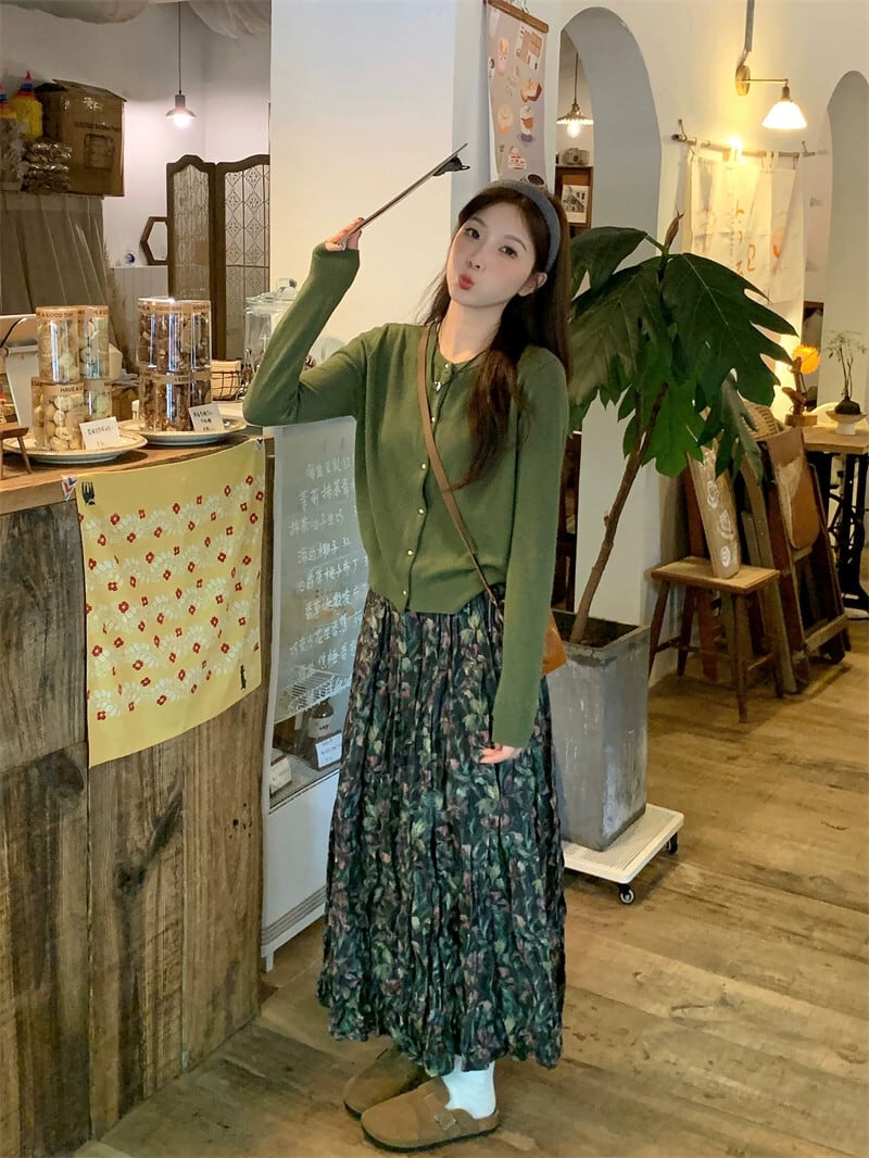 レトロ長袖ニットカーディガンデザインプリーツ花ミディスカート女性秋 2023 新しいファッションスーツ ロング オータム 秋物 花柄 missk96824249970