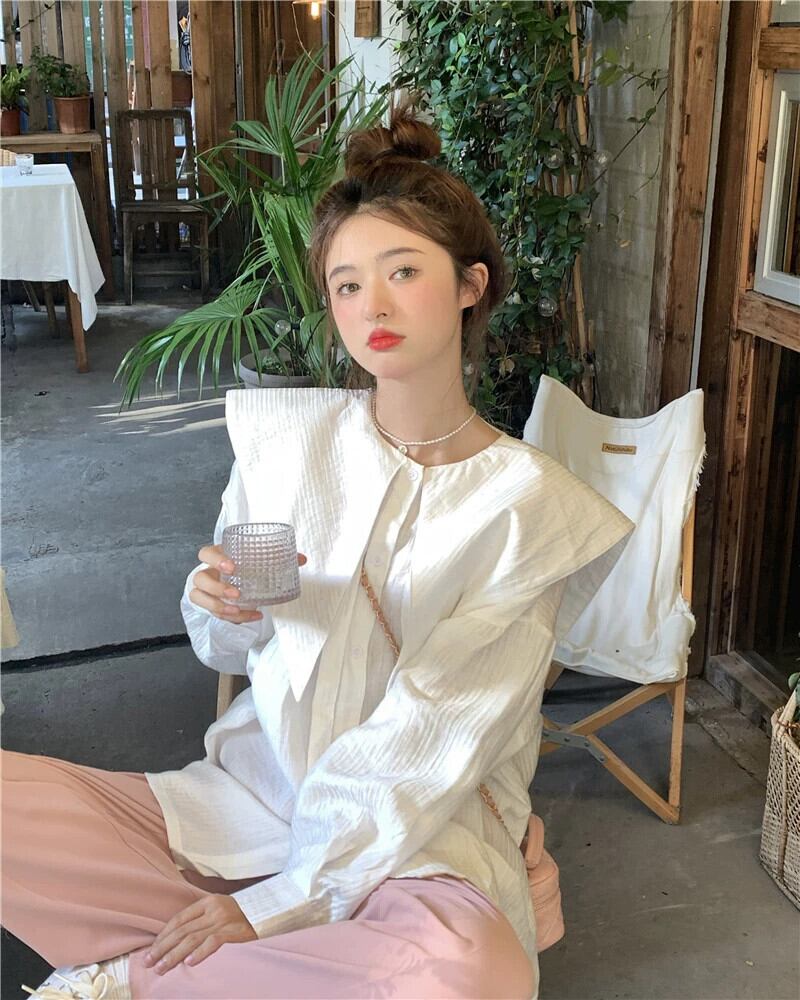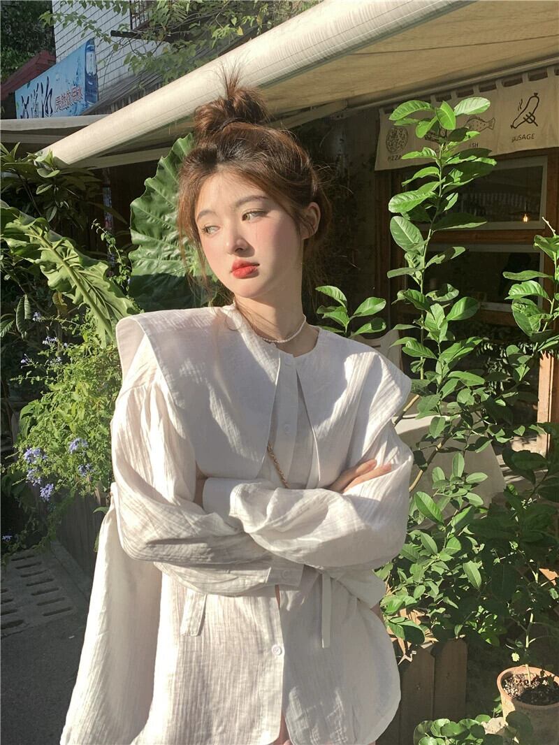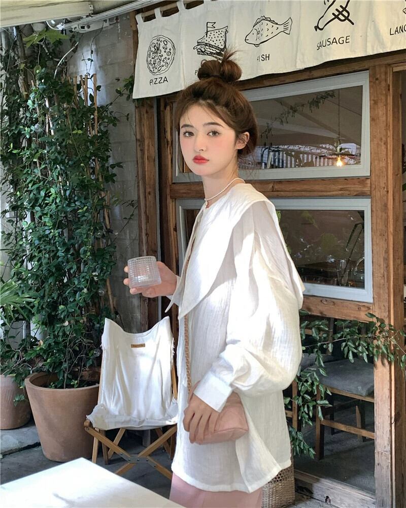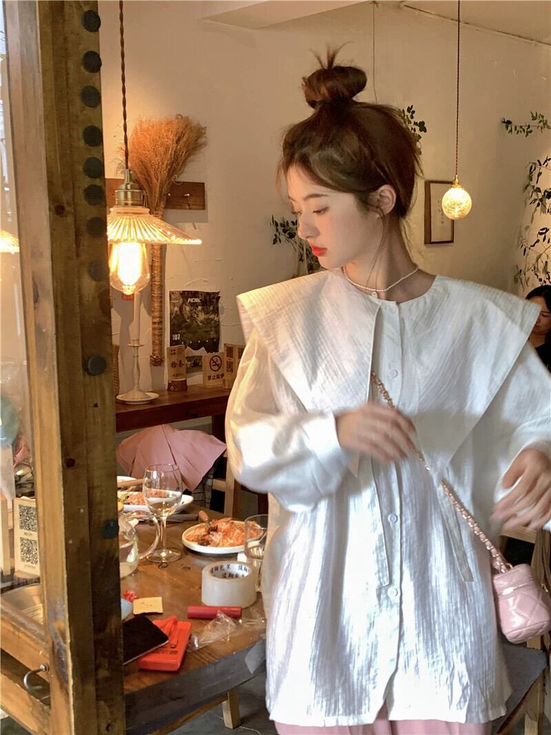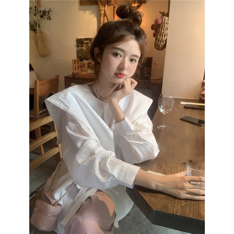 ネイビーカラーシャツレディース2023年秋新デザインニッチスイートホワイトルーズミッドレングス長袖トップ ロング 大人ガーリー スウィート キュート カジュアル オータム 秋物 missk60713091051