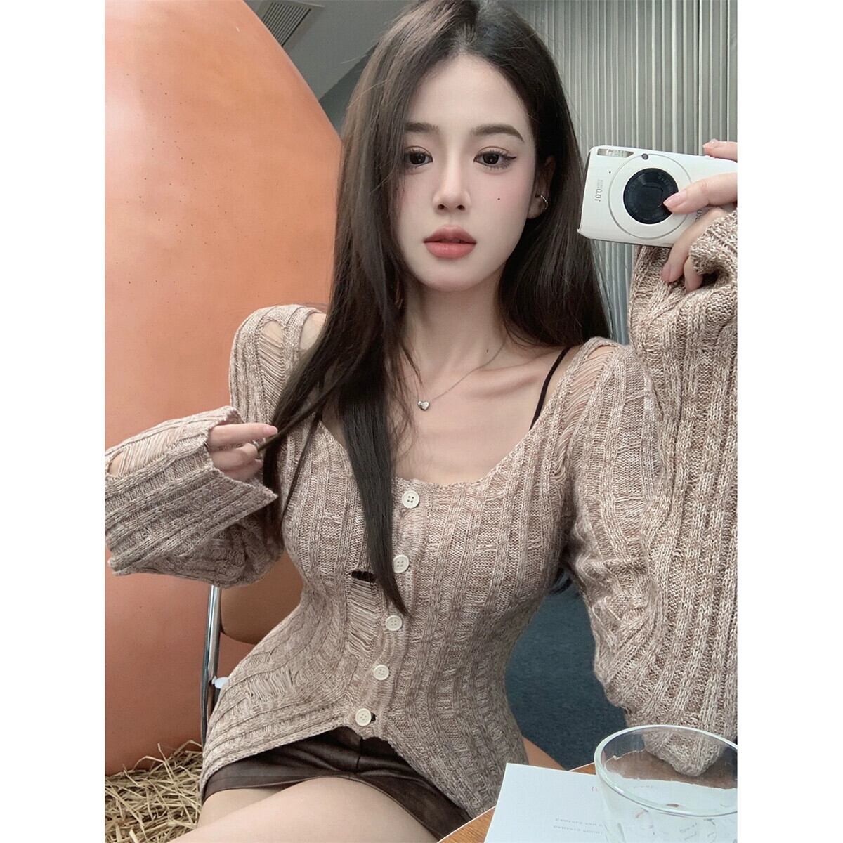 センススリット中空長袖セーター女性秋レトロ 2023 新しいスリムミッドレングストップシック ロング オータム 秋物 missk47578440811