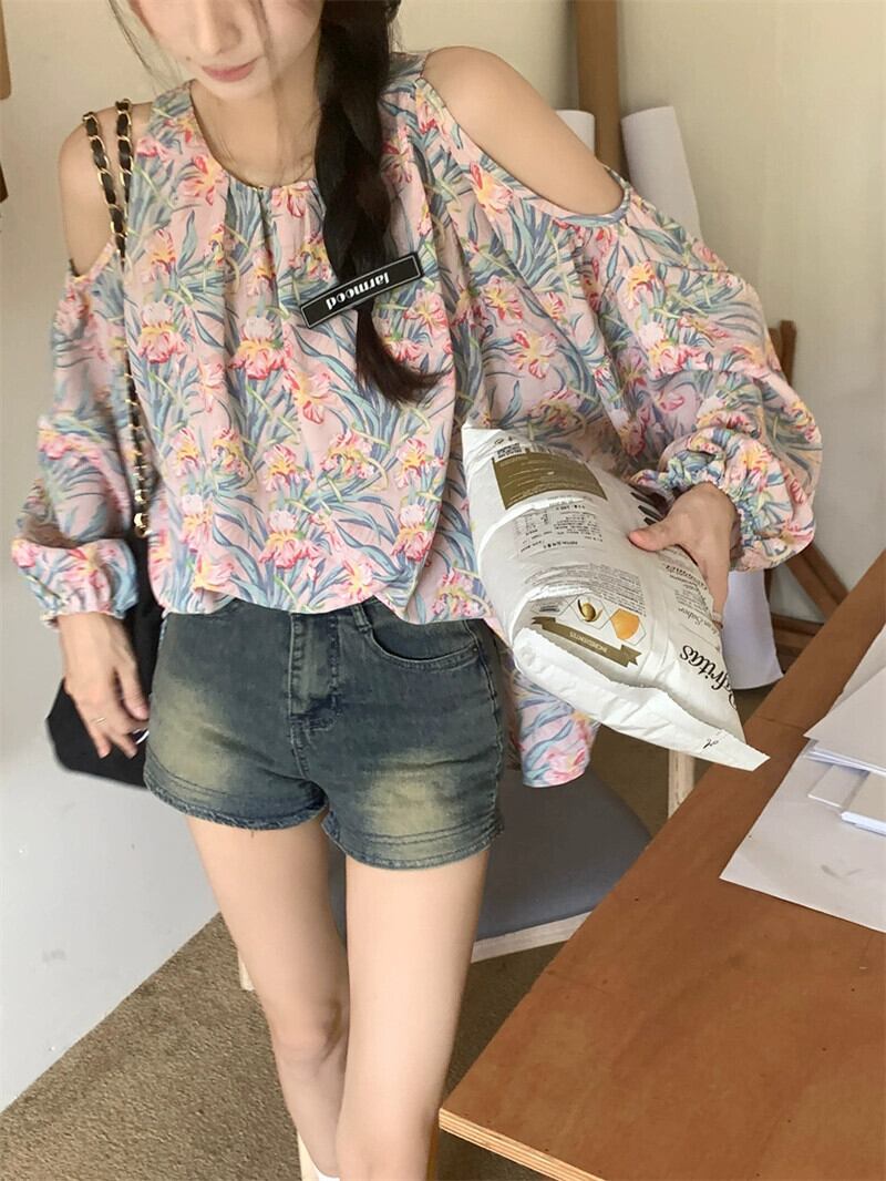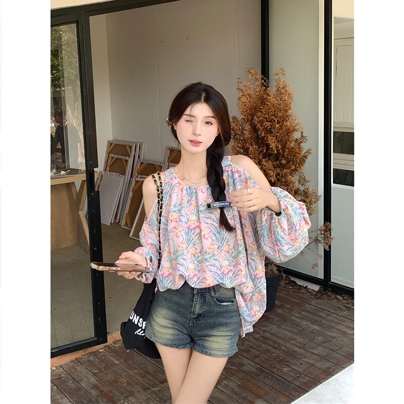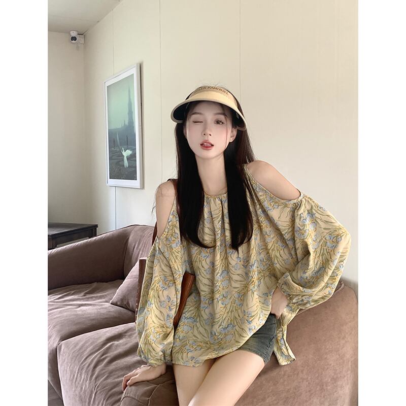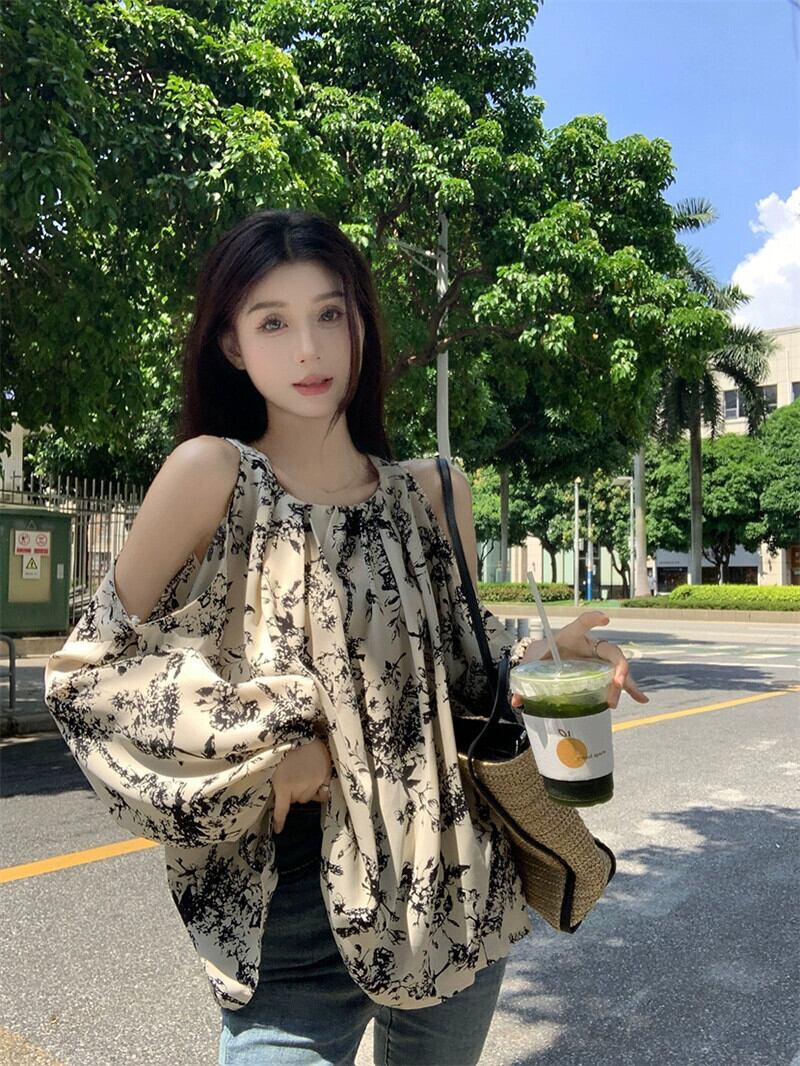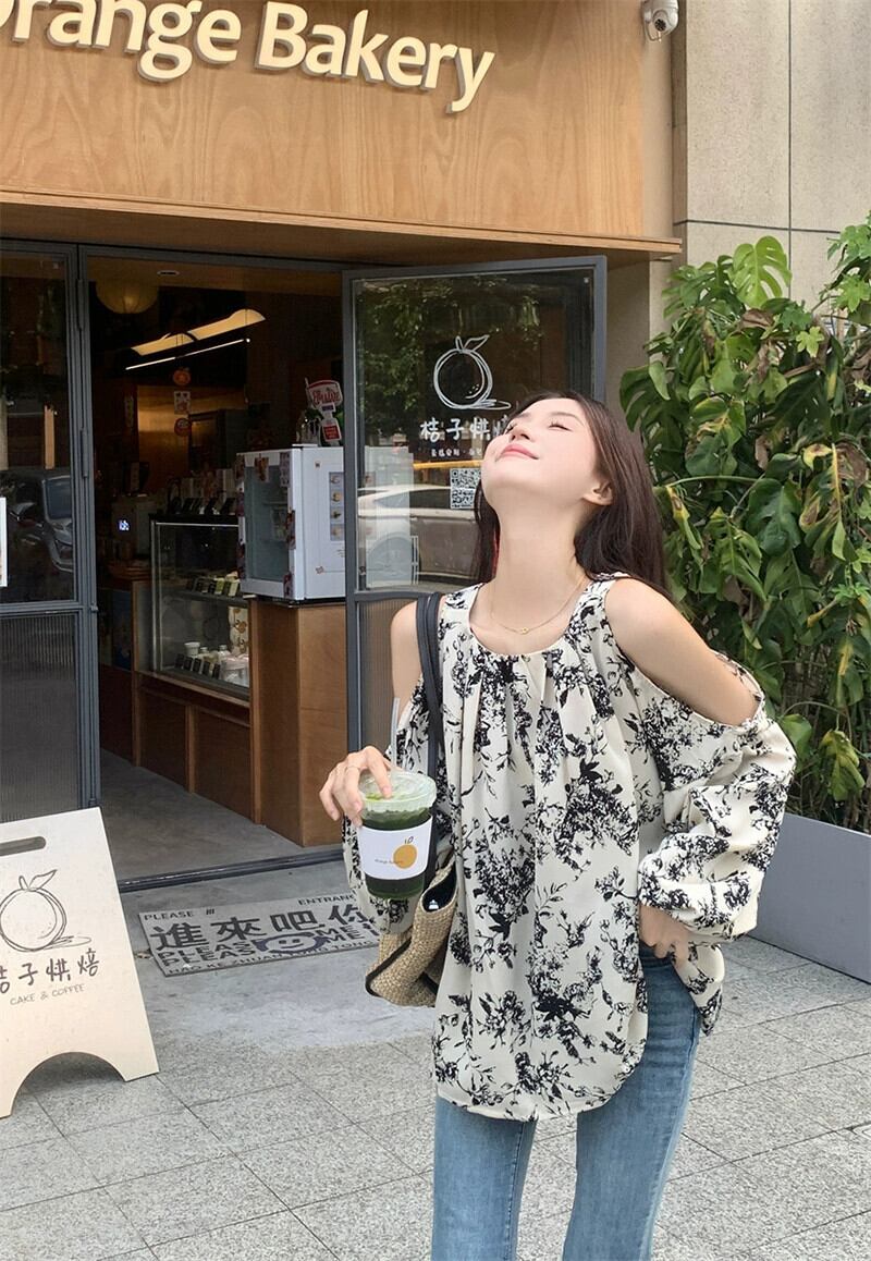 レトロなスタイルの水墨画オフショルダー長袖シャツ初秋2023新しいニッチデザインファッショントップス女性 ロング オータム 秋物 missk31972214306