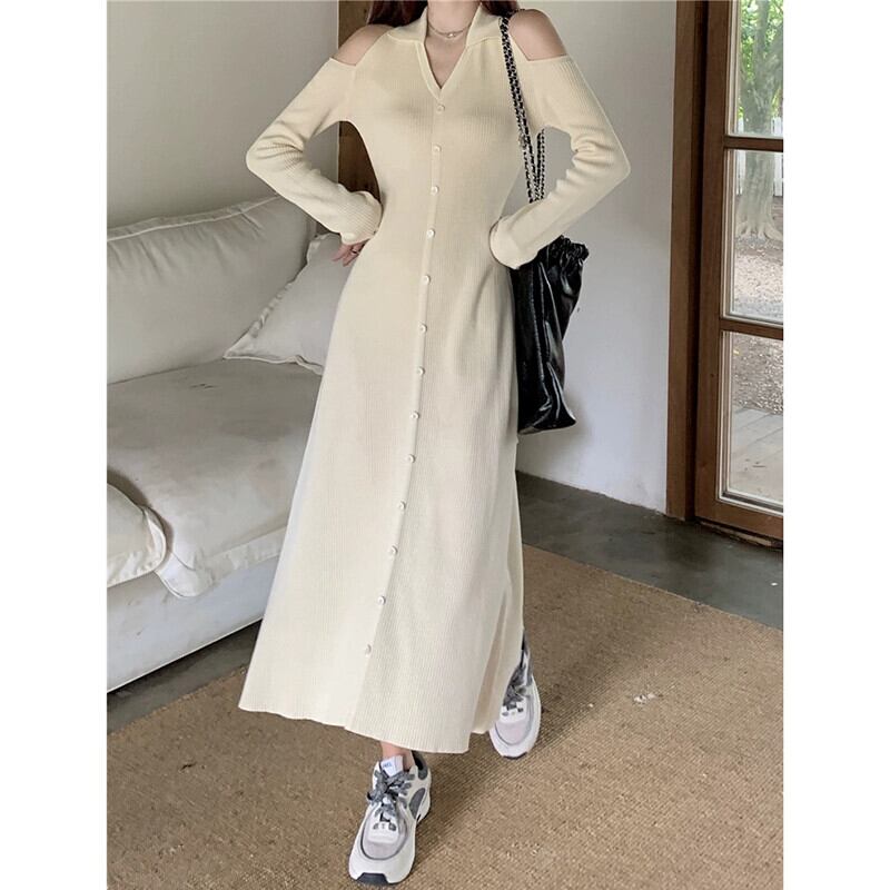 オフショルダー長袖ニットドレス女性 2023 秋の新スタイルフレンチスタイルのデザインスリムスリムロングスカート オータム 秋物 missk67162467855