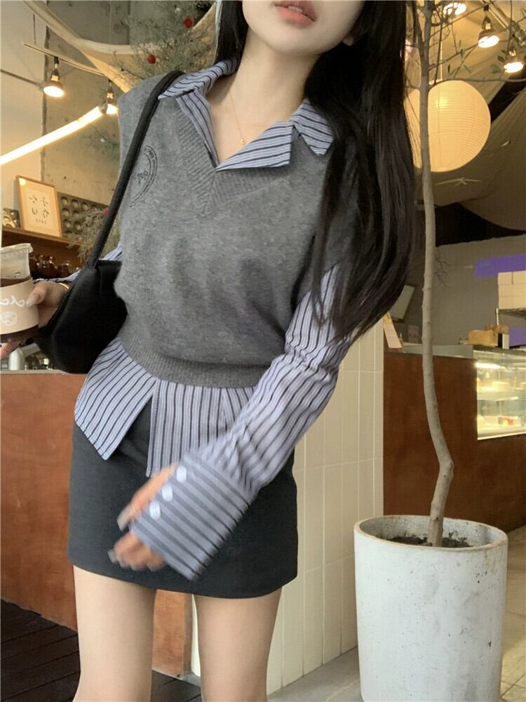 重ねVネックニットベスト、ベスト、ストライプ長袖シャツ、Aラインスカート、レディース2023年秋新作ファッションスーツ ロング オータム 秋物 missk38263487360