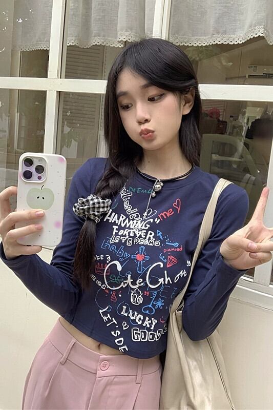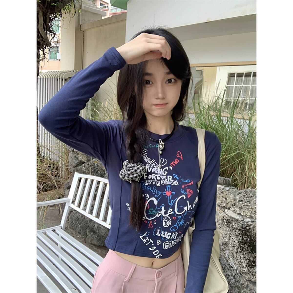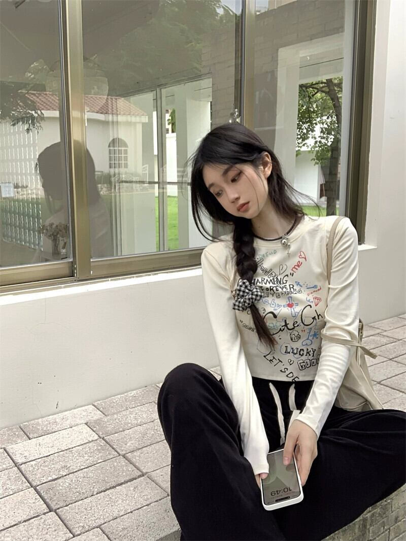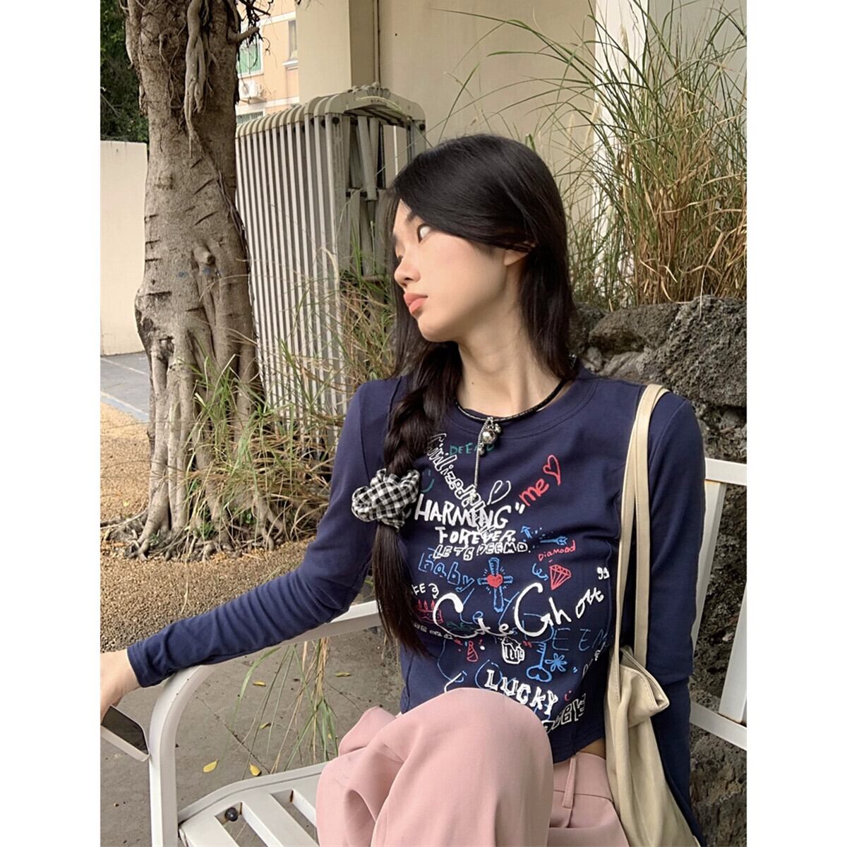 ホットガールグラフィティプリント長袖 Tシャツ女性の秋 2023 多用途ボトリングシャツトレンディトップ ロング オータム 秋物 missk79955050276