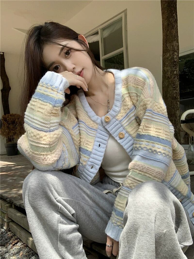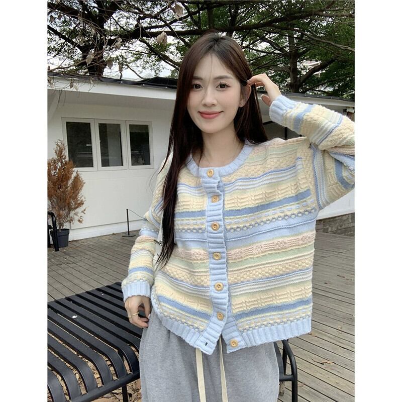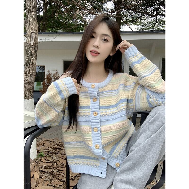 穏やかなスタイルのストライプの対照的な色の長袖セーターの女性の秋 2023 新デザインソフトとワックスのようなルーズセータージャケット ロング オータム 秋物 missk97896205233