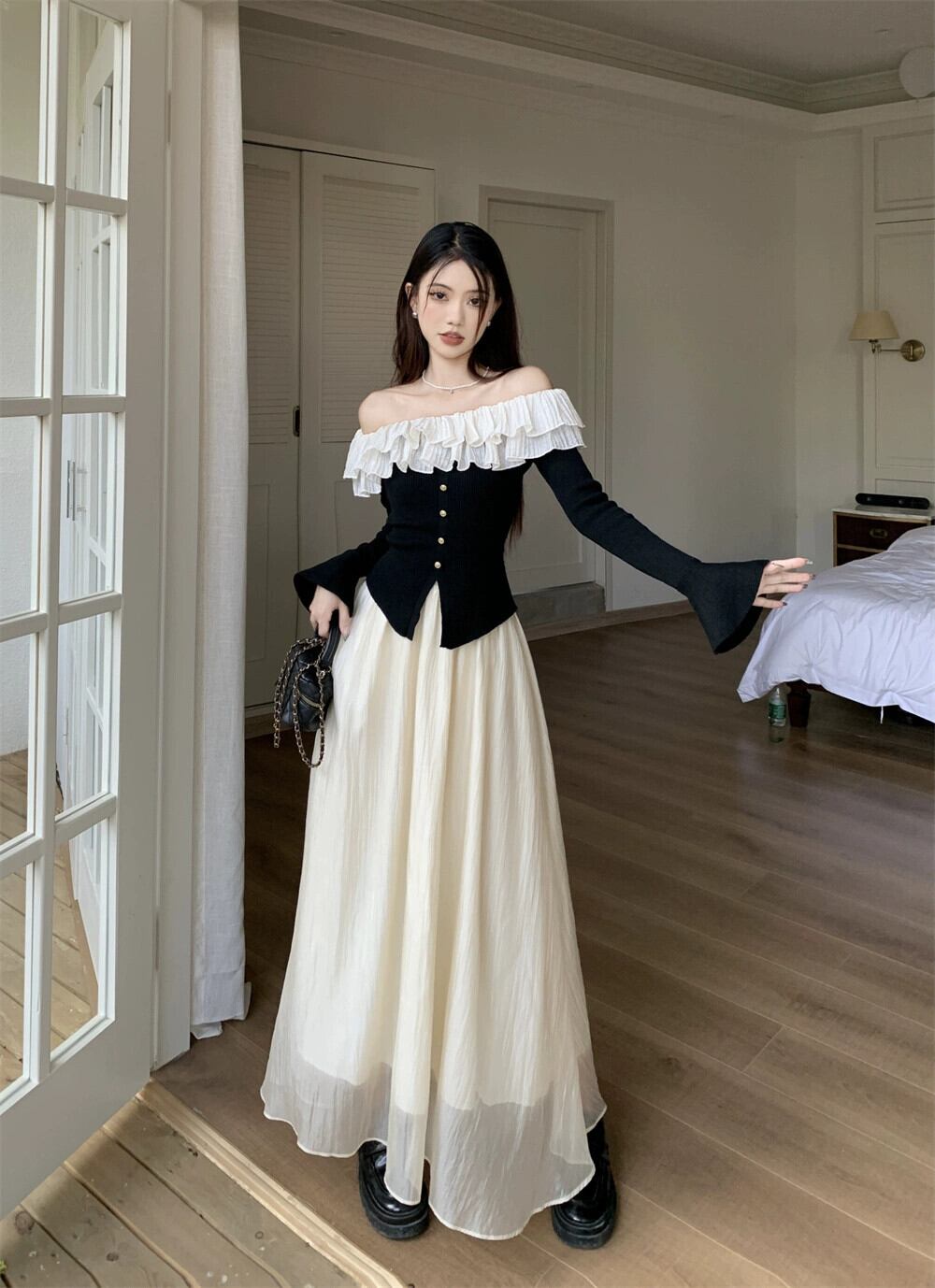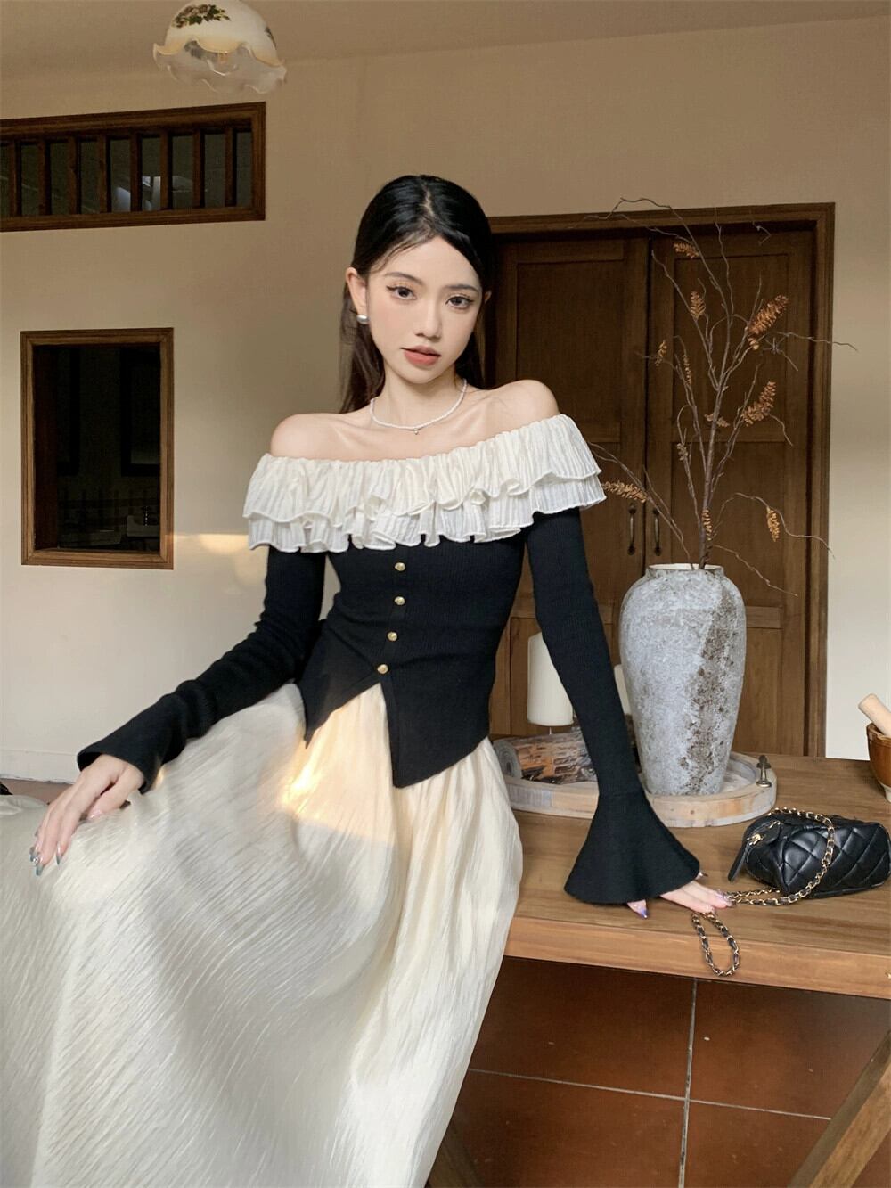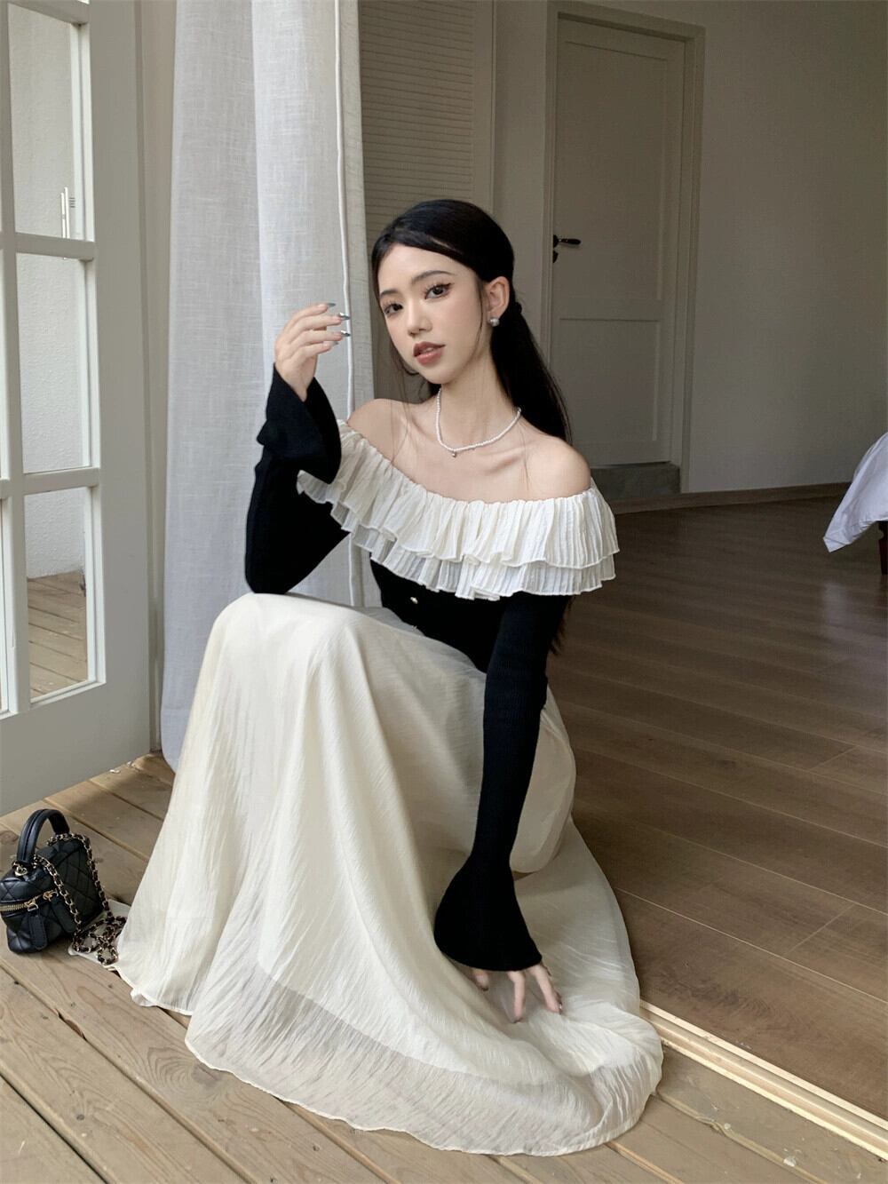 フレンチニッチデザインワンショルダー長袖セーターメッシュスカート女性2023秋の新作ツーピースセット ロング オータム 秋物 missk48584270921