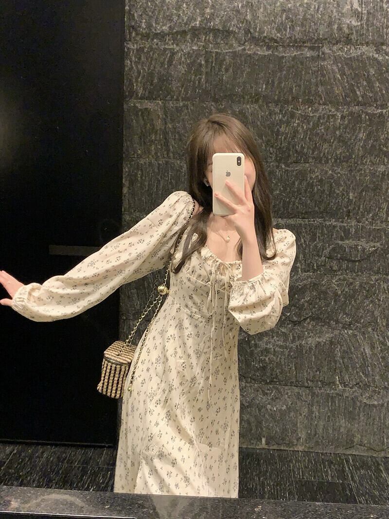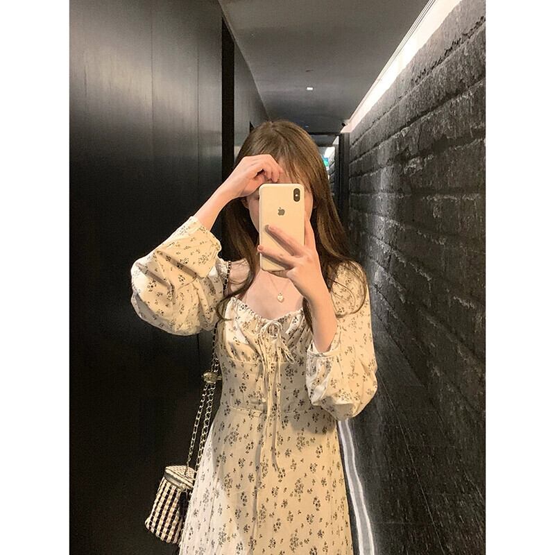 スクエアネック花柄ドレスレディース秋バージョン 2023 新しいシックなウエスト痩身レースアップスリット長袖スカート ロング オータム 秋物 スクウェア missk7995751344