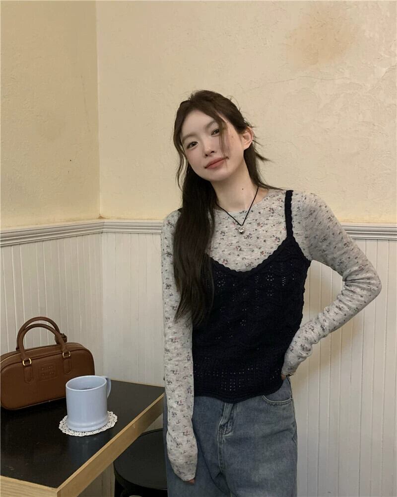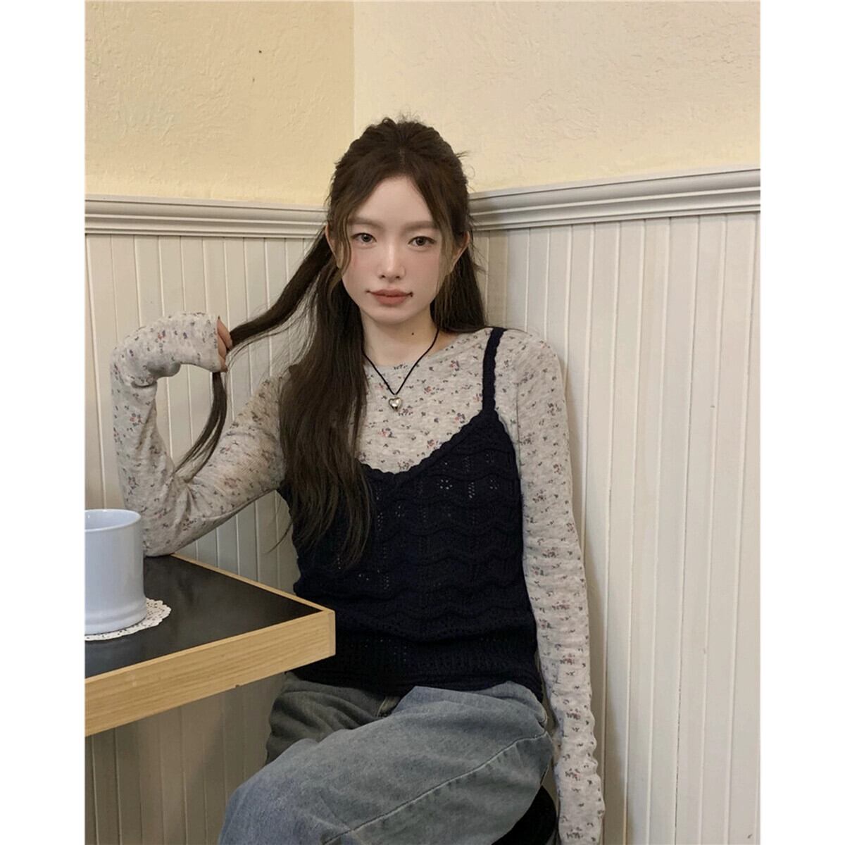 中空層状ニットキャミソールハート型花柄長袖ボトシャツ女性秋 2023 新しいファッションスーツ ロング レッド オータム 秋物 missk91360698092