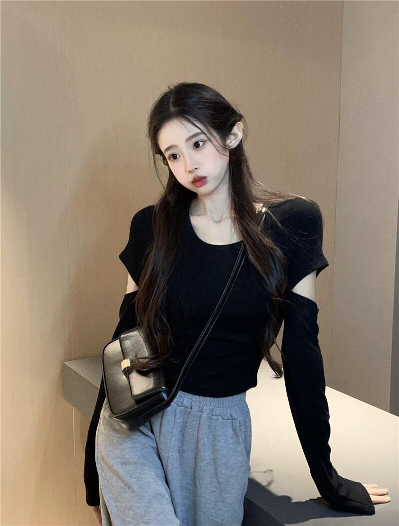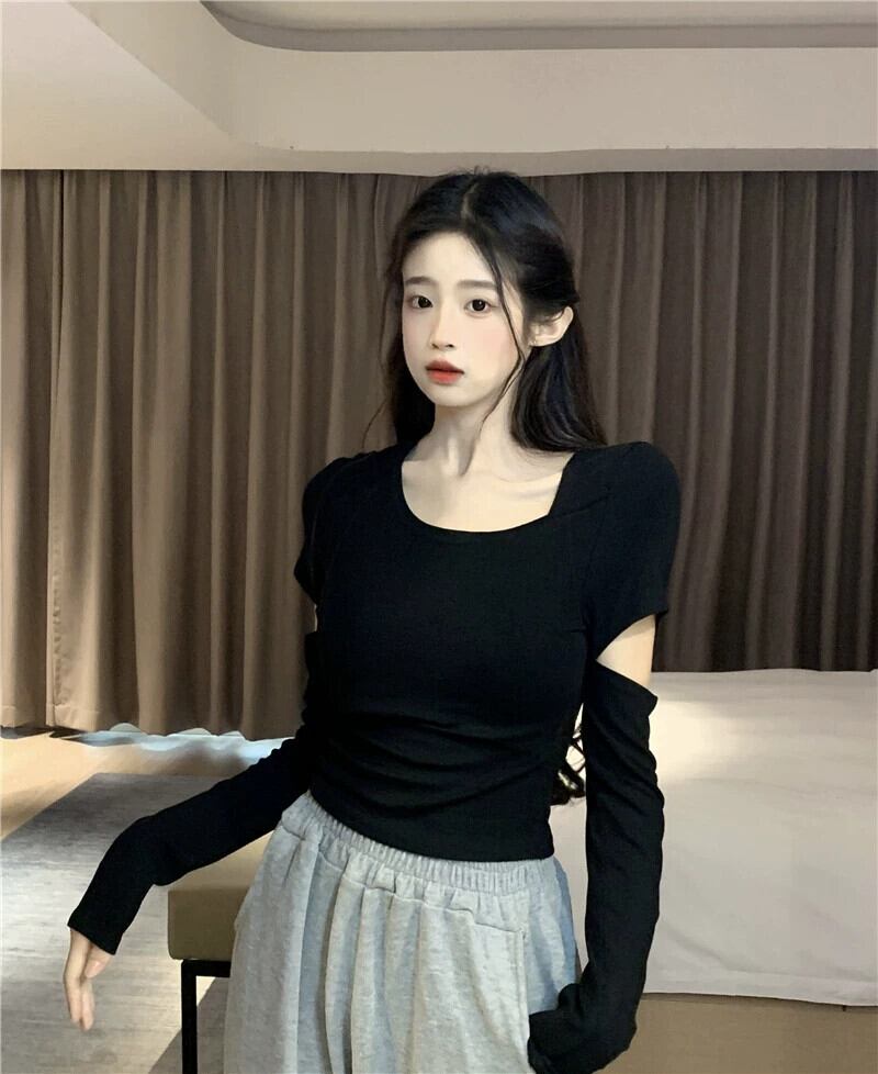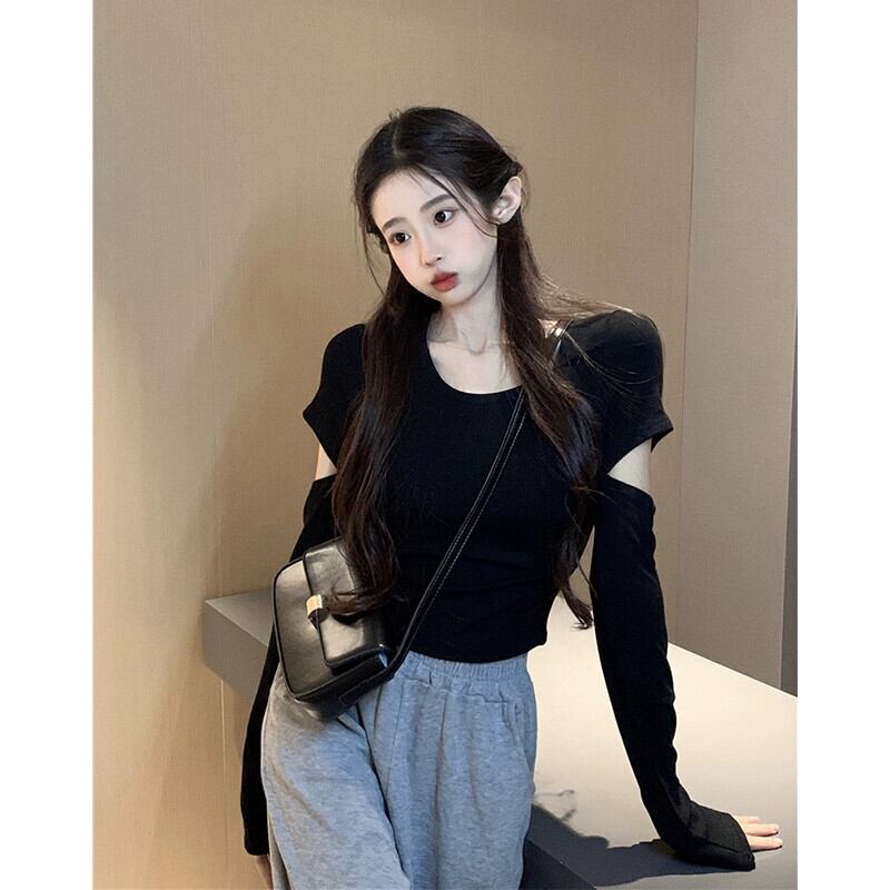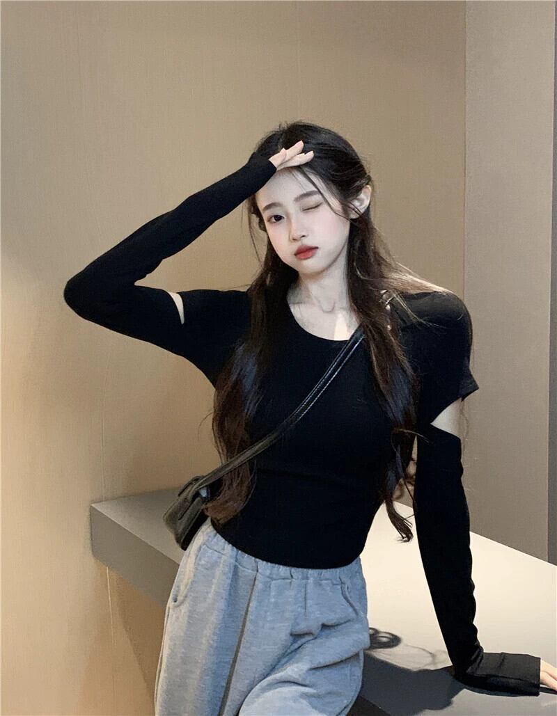 Hot Girl ブラック リップド ロング スリーブ Tシャツ レディース 秋バージョン 2023 スリム フィット ボトリング トップ 長袖 オータム 秋物 missk57881428026