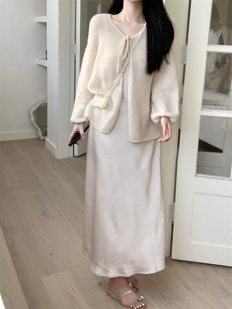 色:アプリコットカーディガン,スリングドレスSコード,ストラップドレスMサイズ