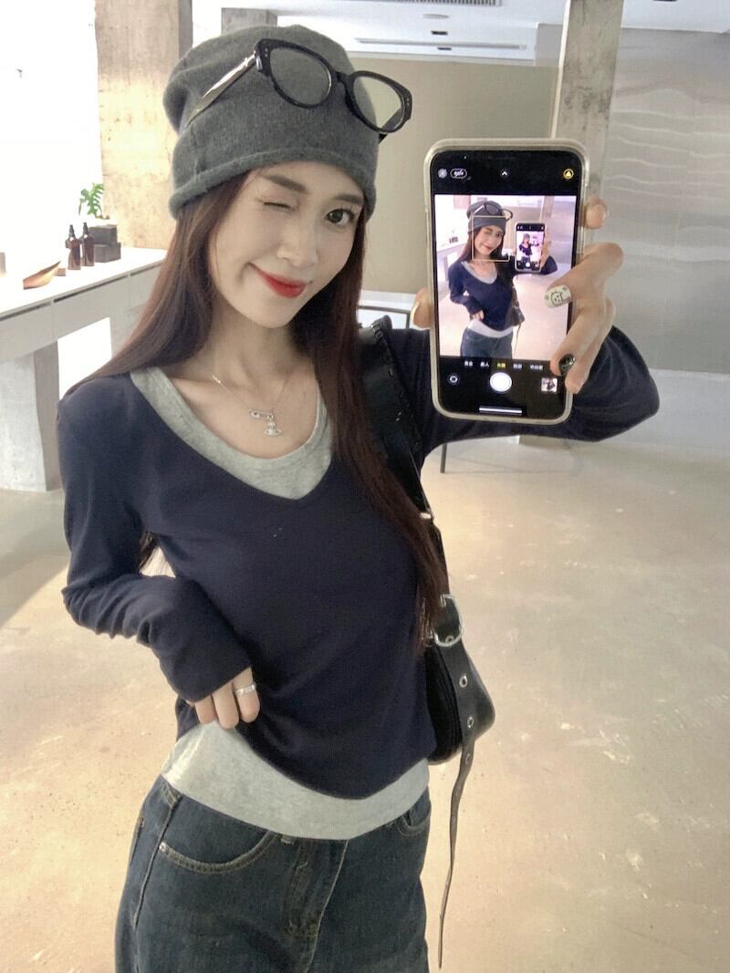 ネイビーブルーの長袖 Tシャツの女性 2023 秋の新デザインのスリムフィットショートインナーボトリングシャツトップスーツ ロング オータム 秋物 missk22047669490