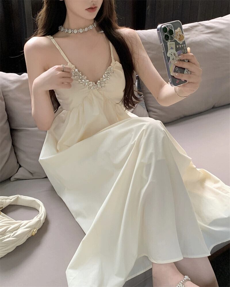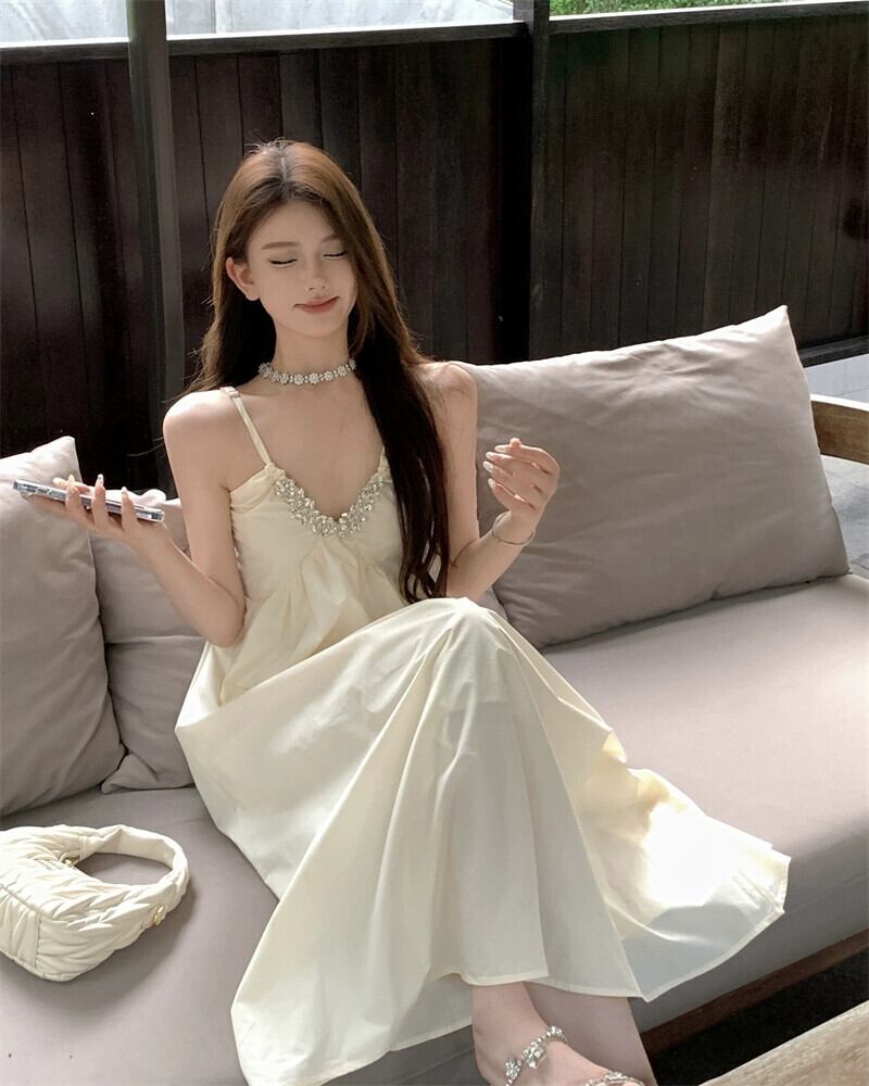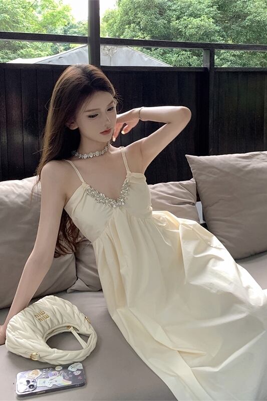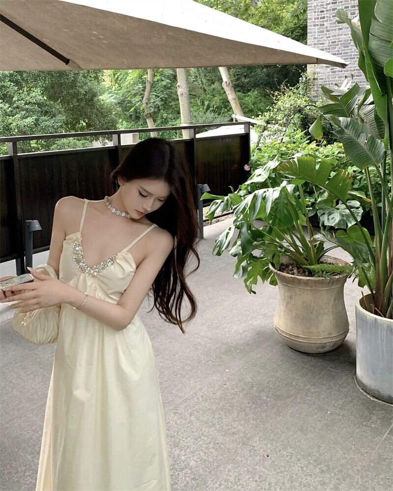 フレンチ v ネックハイエンド輝くダイヤモンドサスペンダードレス秋 2023 新しいスタイルの気質ウエストホルターネックロングスカート オータム 秋物 Vネック missk61924759243