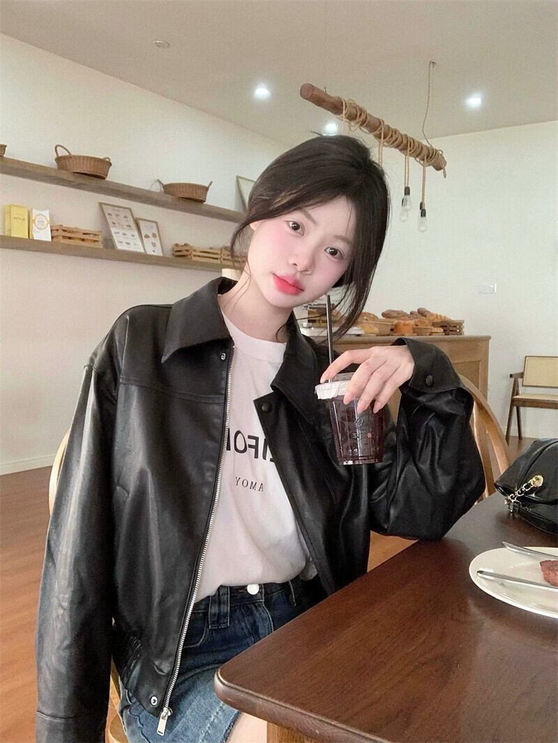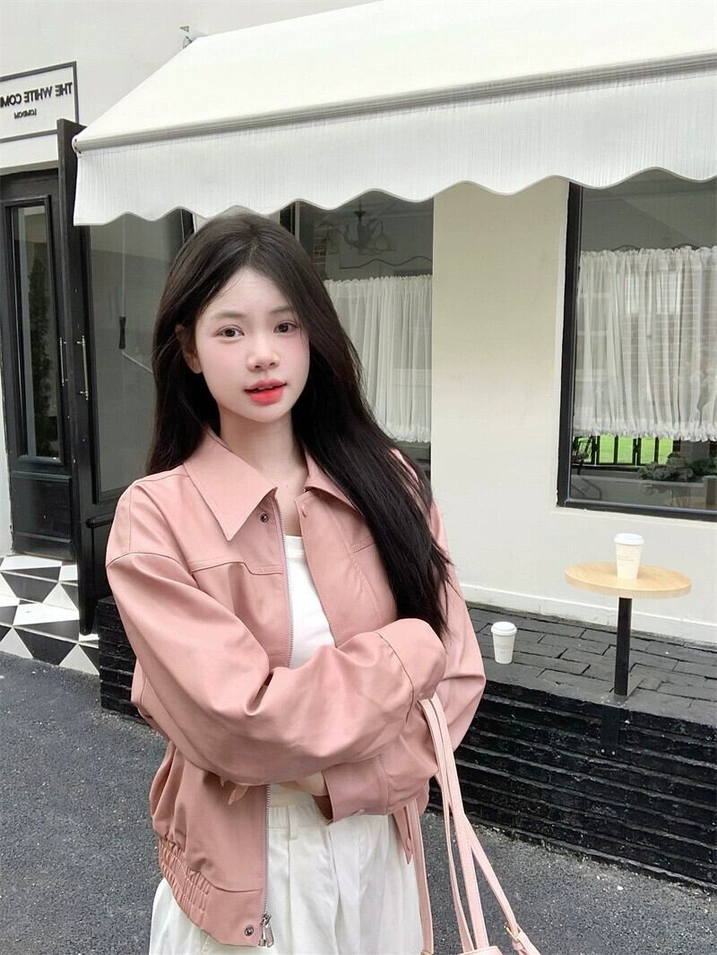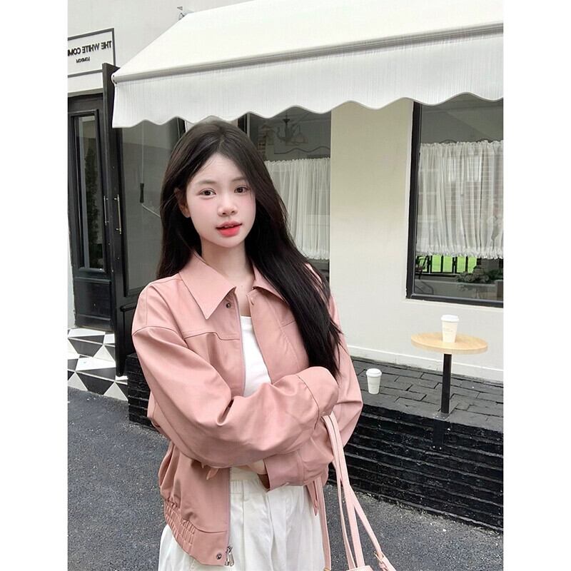 ピンクレザージャケットレディース秋バージョン2023新しいポロカラー甘くてクールなルーズ多目的長袖ジャケットトレンディ ロング 大人ガーリー スウィート キュート カジュアル オータム 秋物 missk97198964457