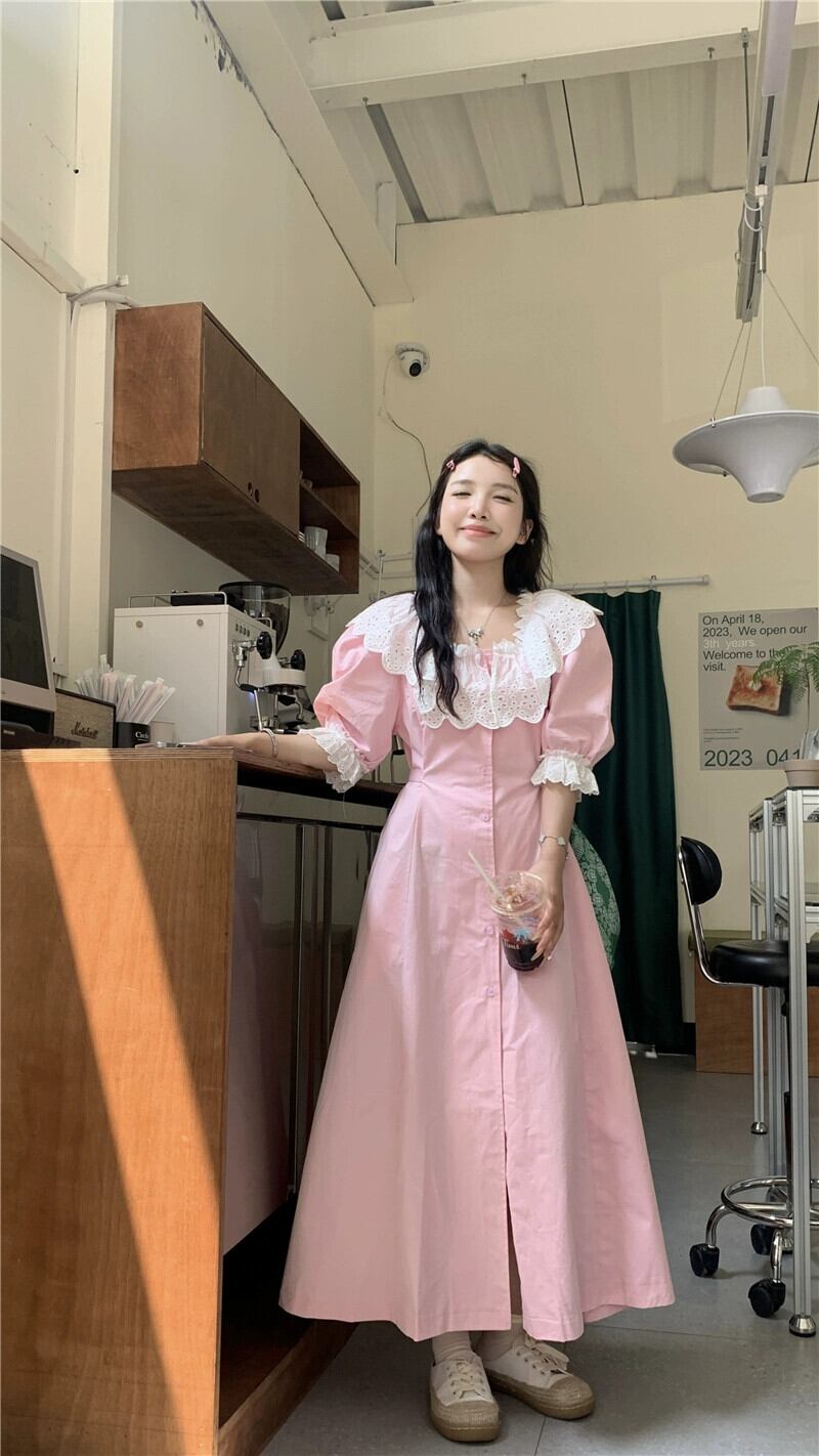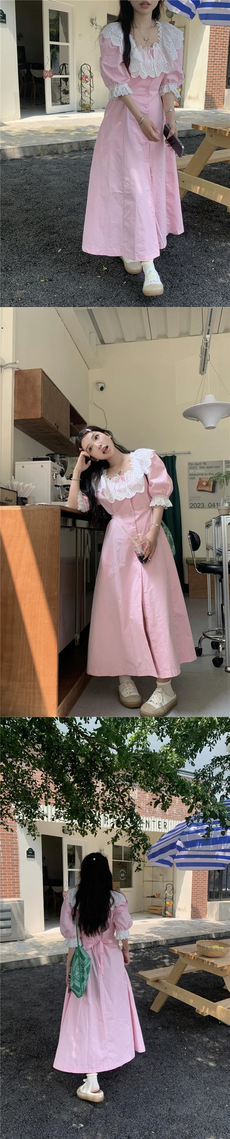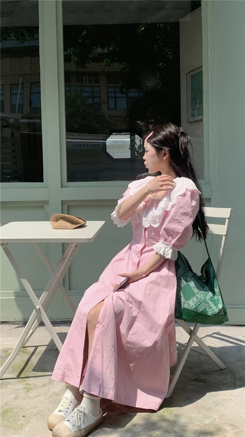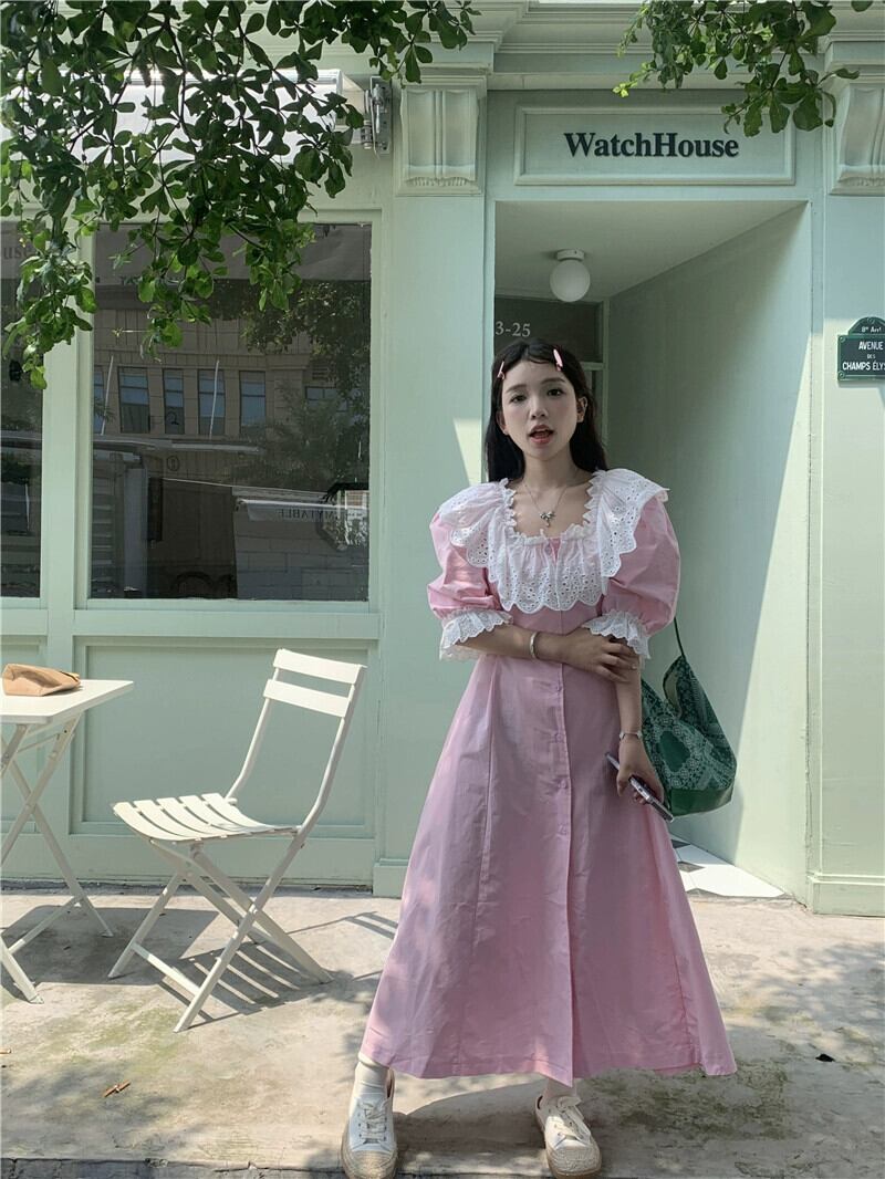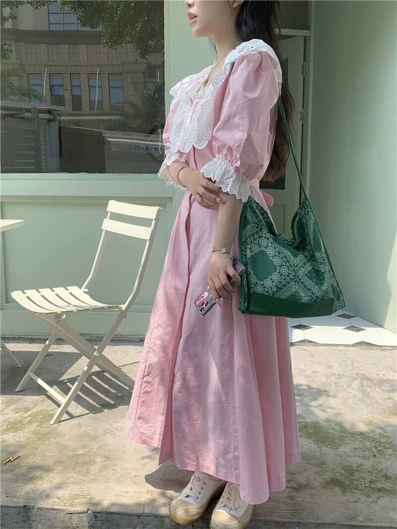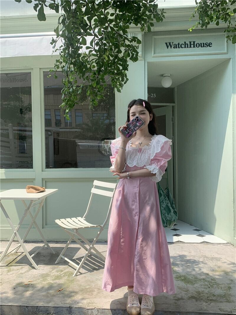 甘いレースのスクエアネックドレスの女性の秋の新しいスタイルのフレンチニッチ気質ウエストを締めるピンクのロングスカート 大人ガーリー スウィート キュート カジュアル オータム 秋物 スクウェア missk27260511689
