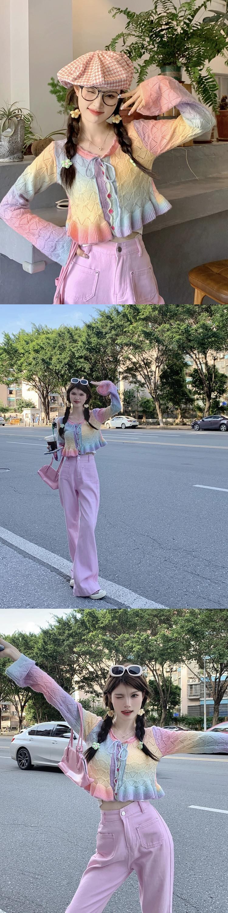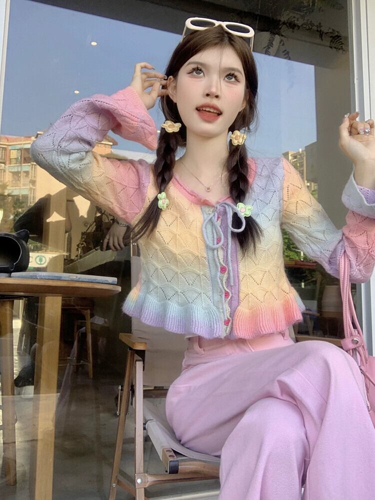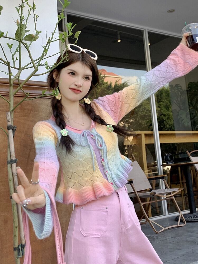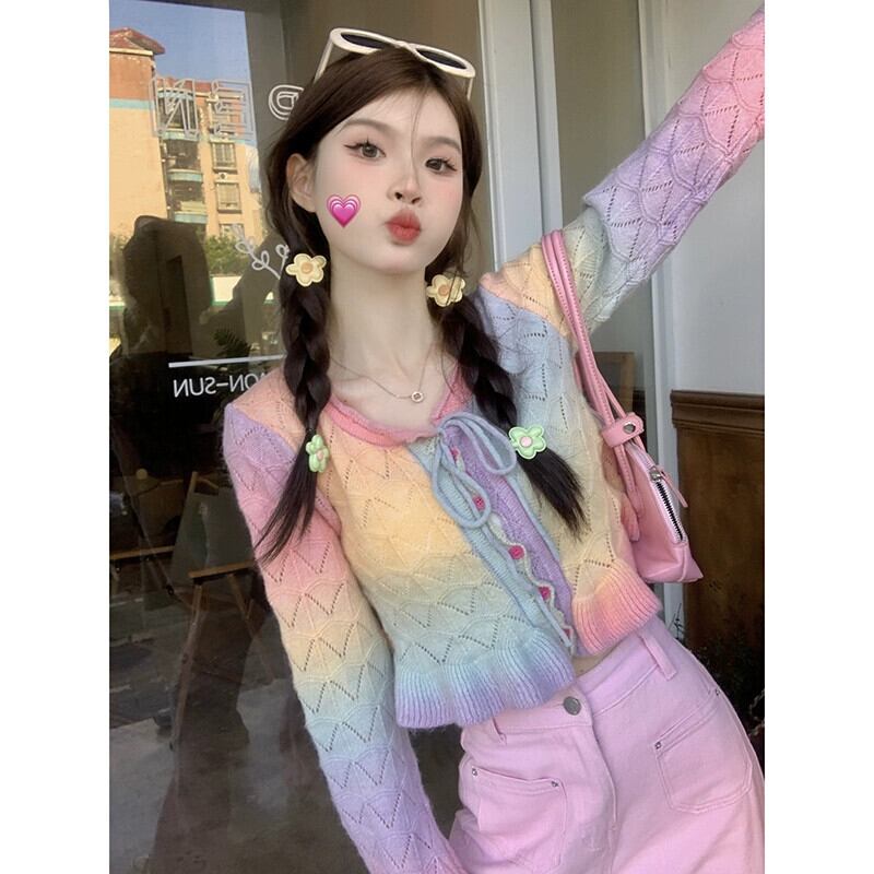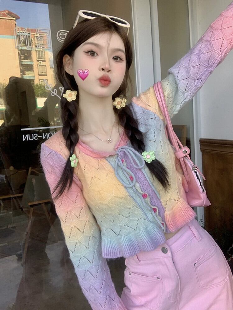 ドーパミンガールレインボーカラー長袖セーター2023年秋中空レースアップシックトップ ロング missk23800511188