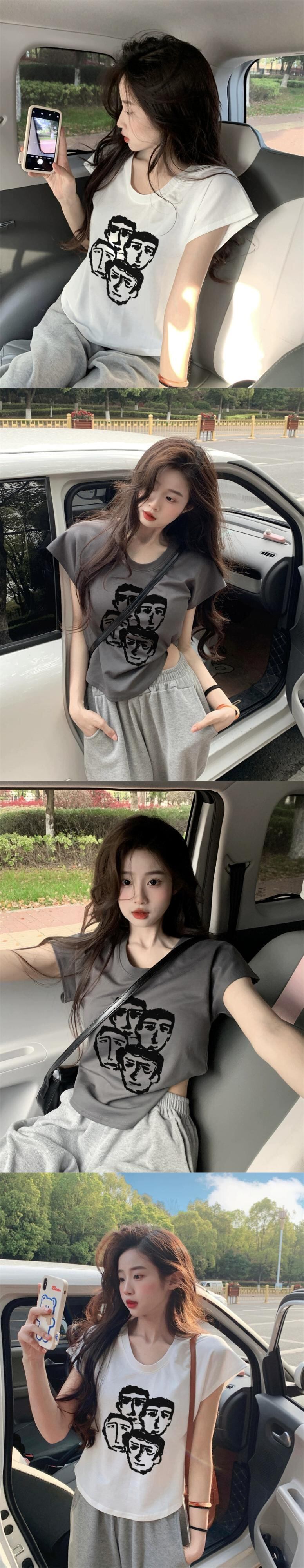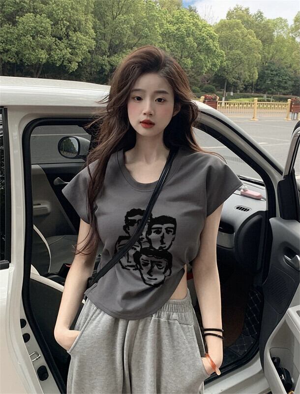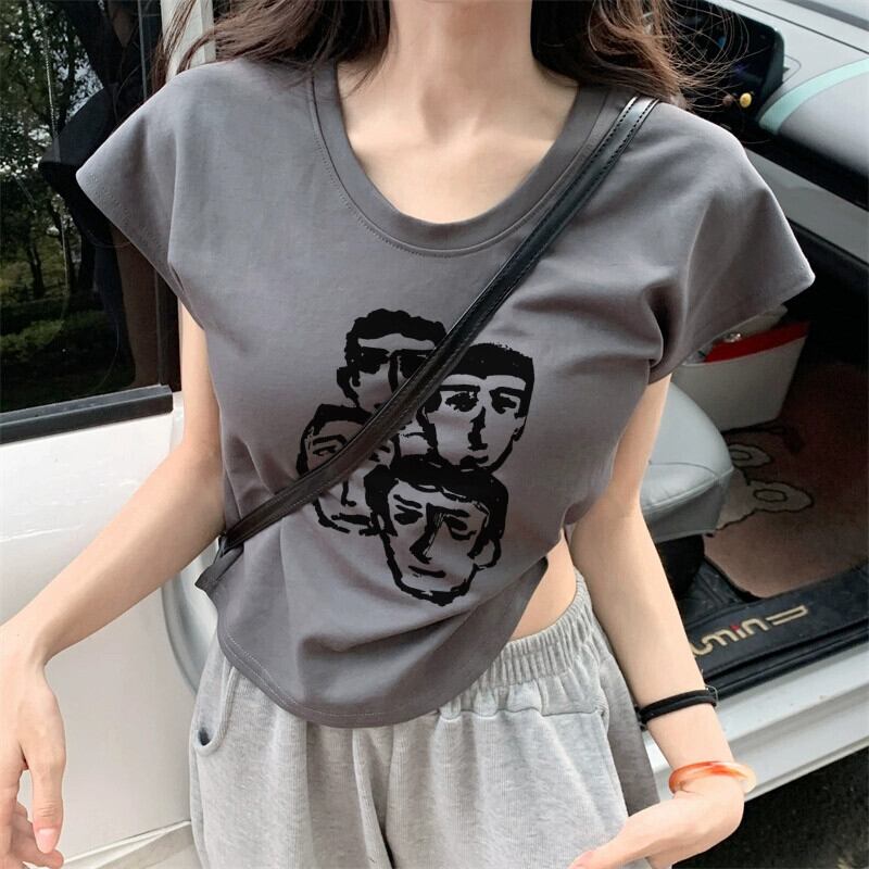 レトロプリント右肩半袖 Tシャツ女性の夏 2023 新しいアメリカンスリムフィットショートデザイントップ サマー 夏物 missk99855236678