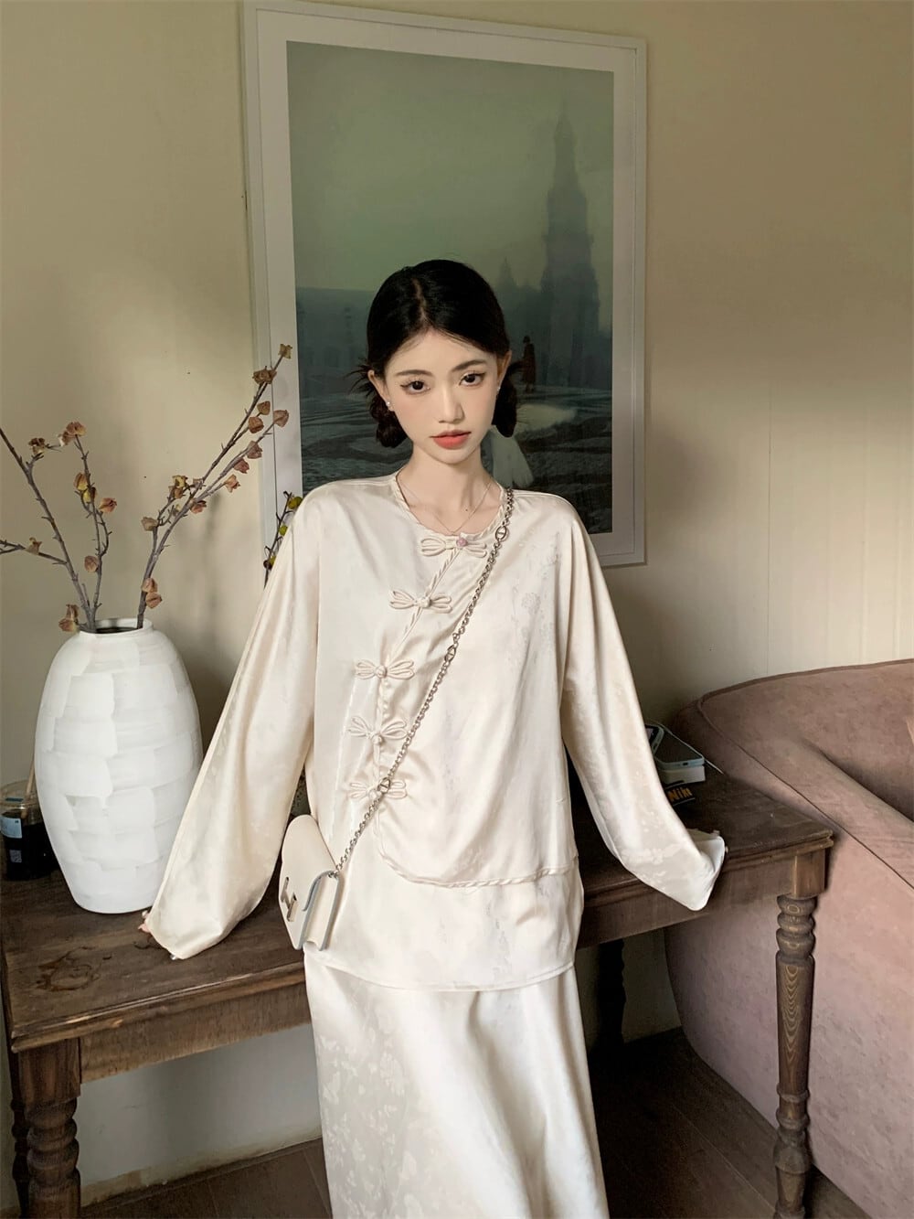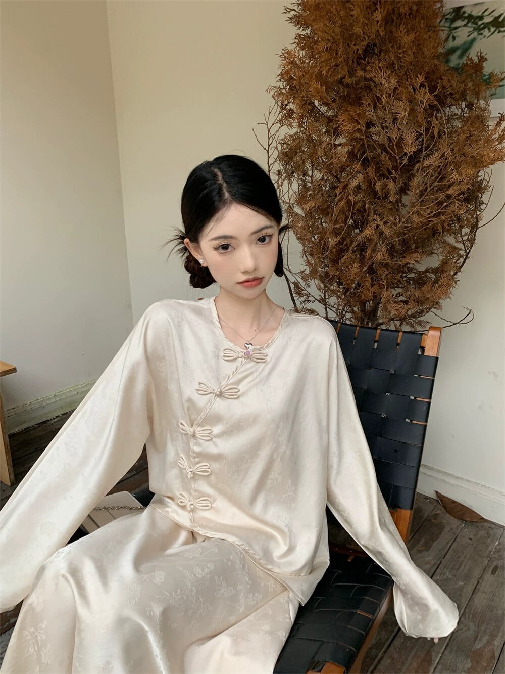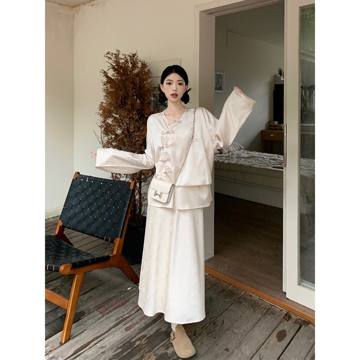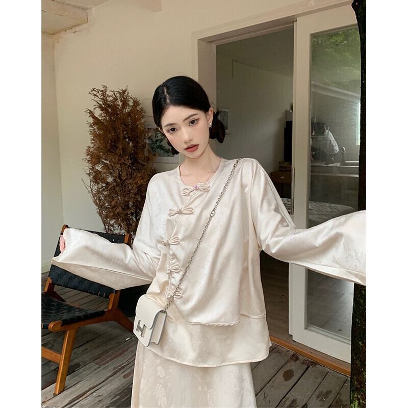 中国デザインのバックルルーズ長袖トップミッドレングススカートの女性の秋の2023新しいツーピースセット ロング オータム 秋物 missk84564308539