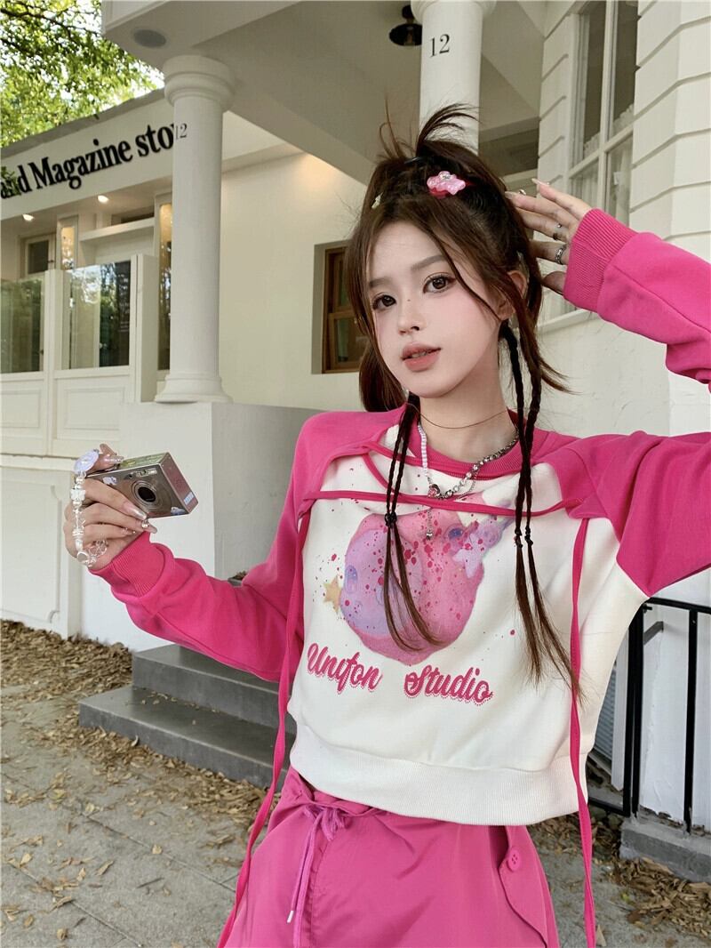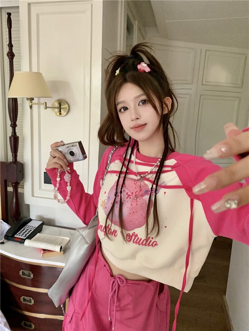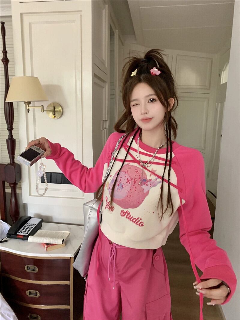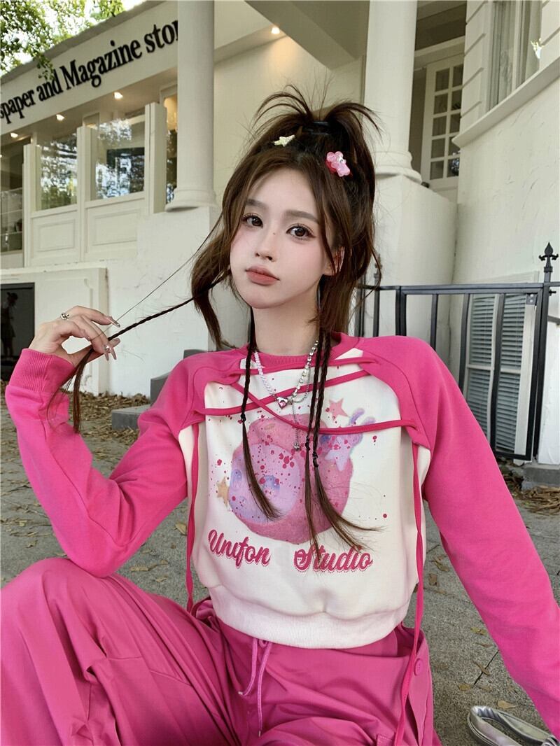ドーパミンショートスウェットシャツ2023年秋の新デザインストラップコントラストカラーステッチプリント長袖トップス ロング オータム 秋物 missk78265978203