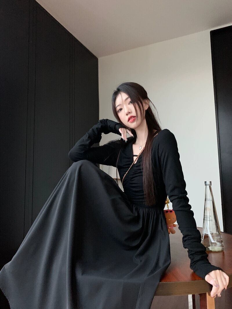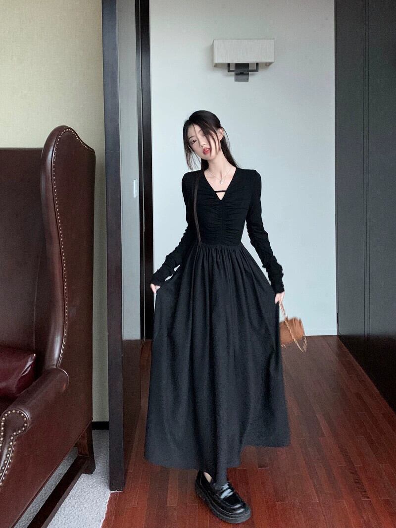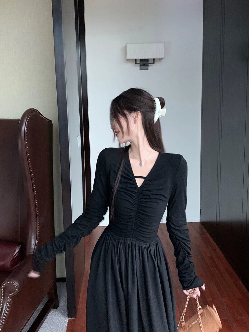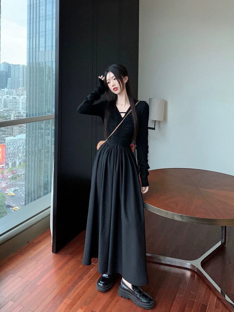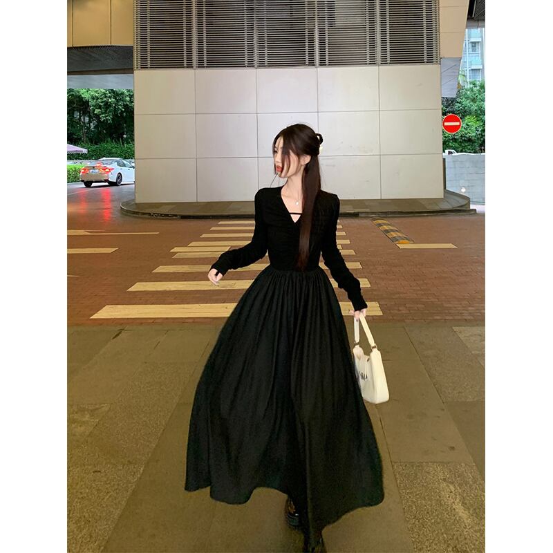 フランスの V ネック長袖ドレスの女性 2023 秋の新しいウエスト痩身ミッドレングス黒の気質大きな裾スカート ロング ブラック オータム 秋物 Vネック missk19763861090