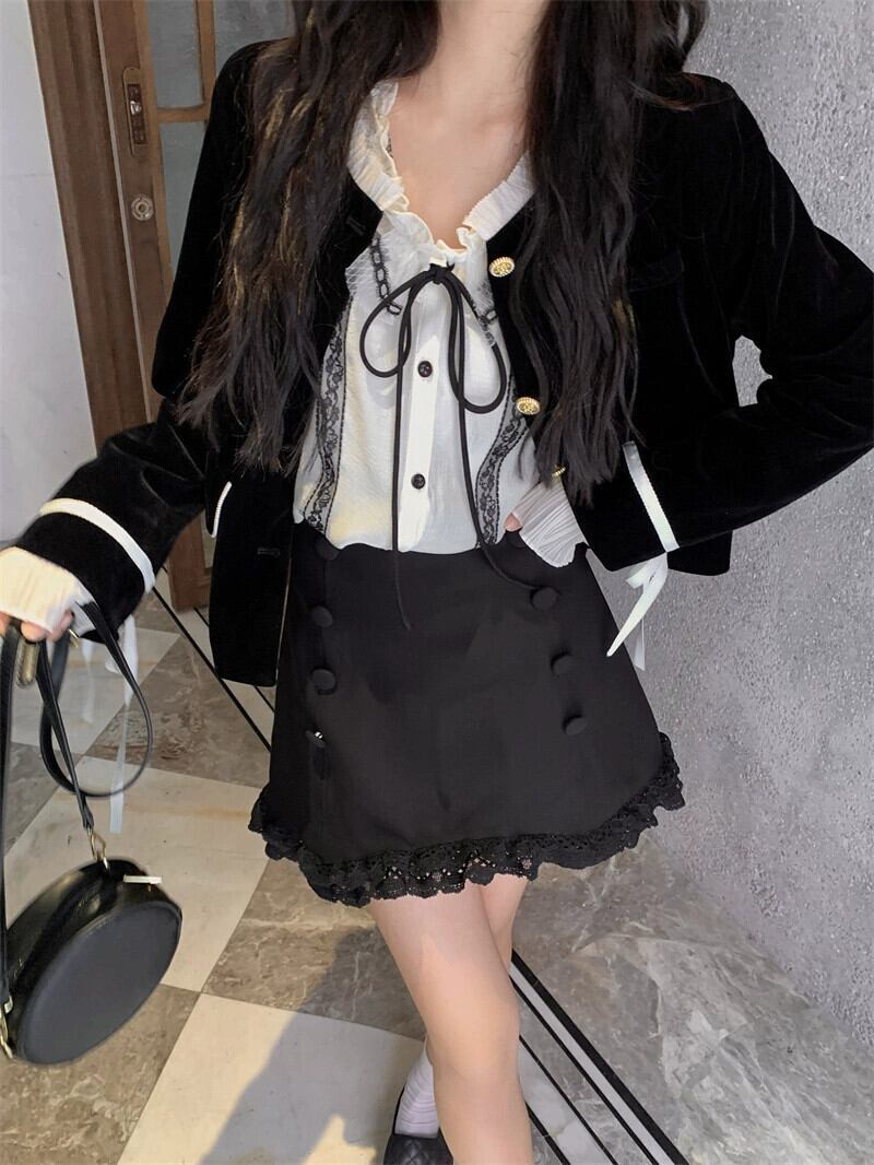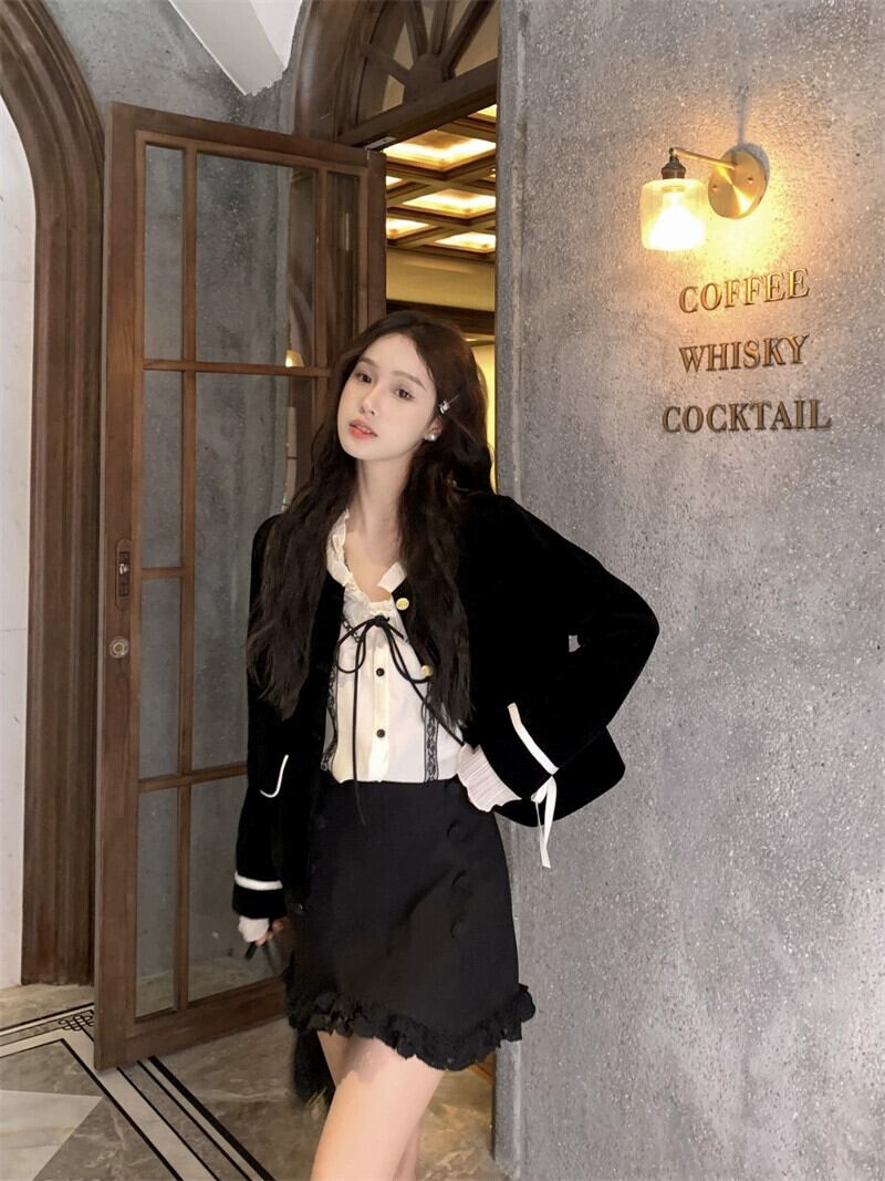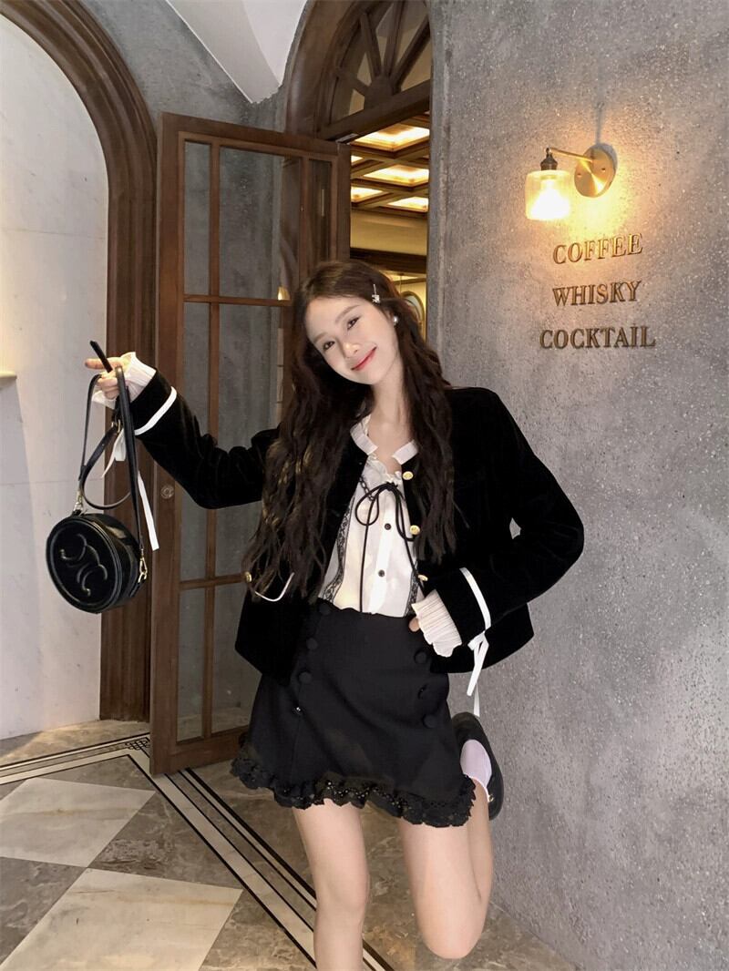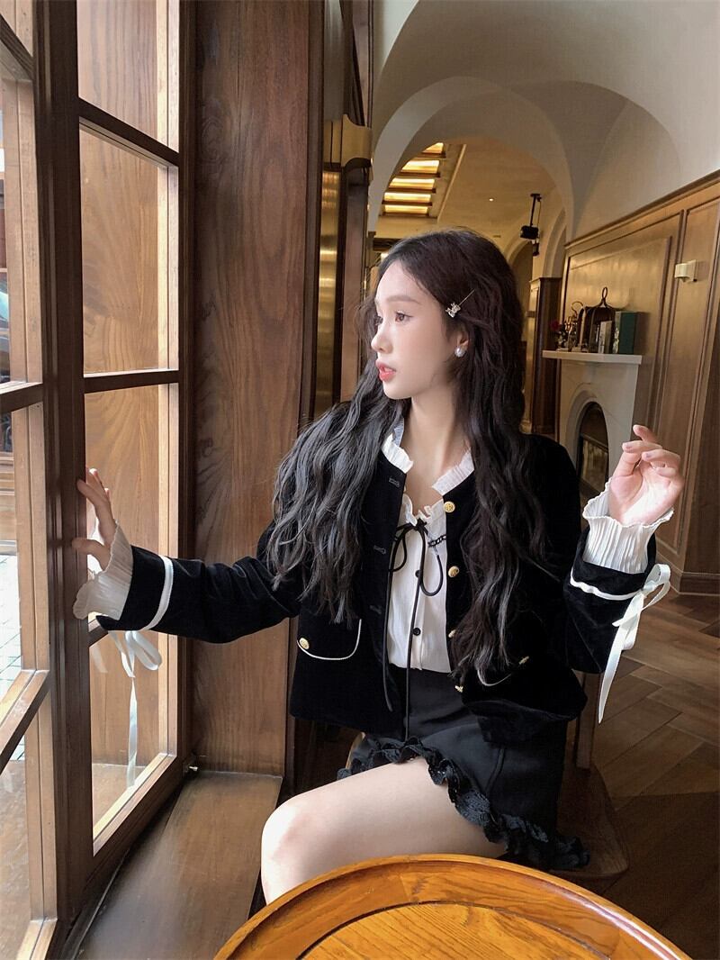 Xiaoxiangfeng ステッチ対照的な色の気質長袖コートシャツハイウエストショートスカート女性の秋 2023 新しいファッションスーツ ロング オータム 秋物 missk21377204337