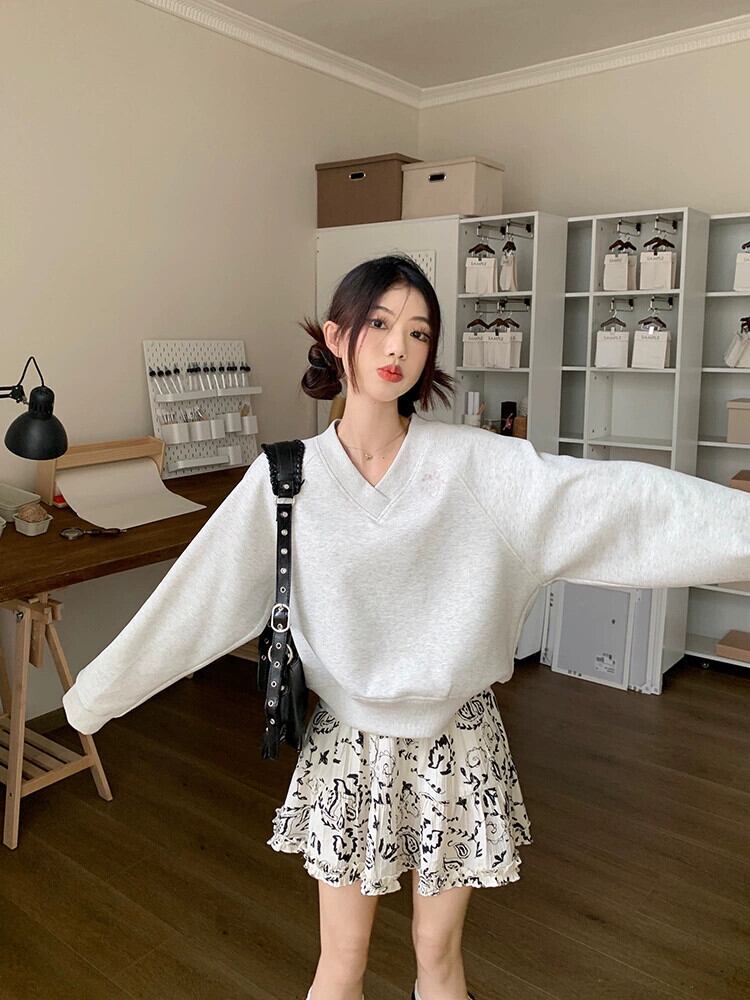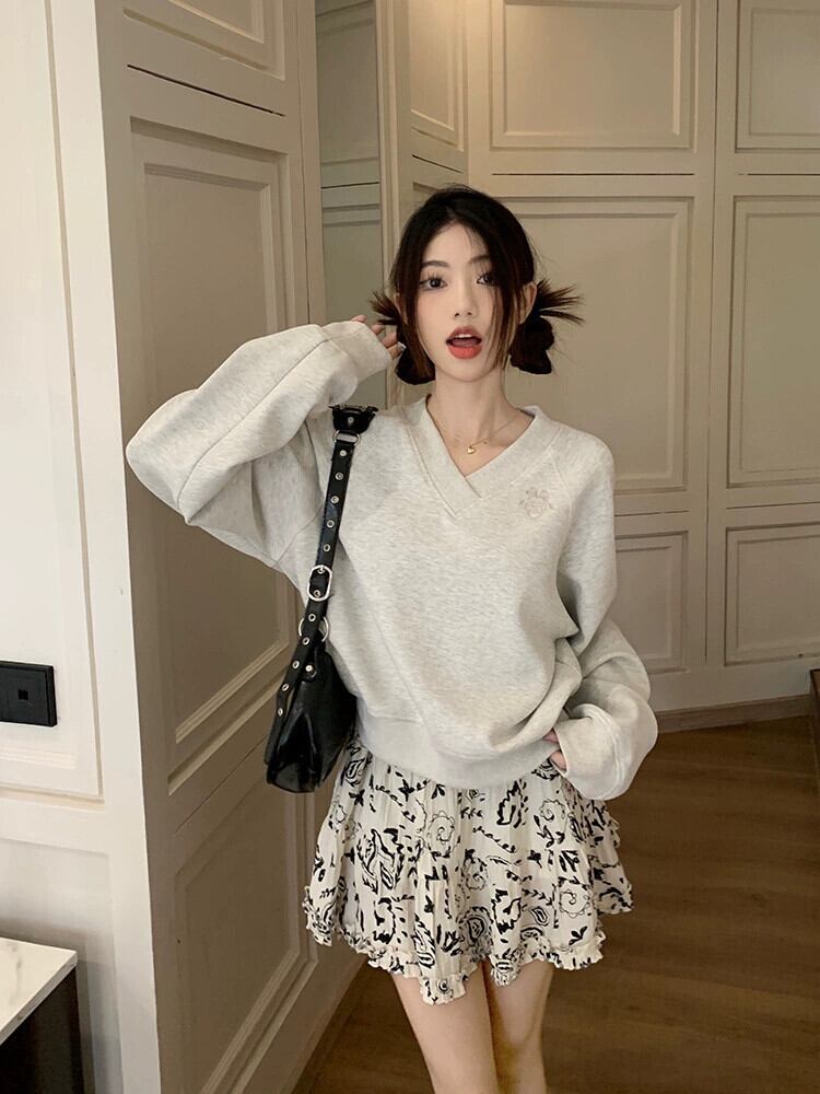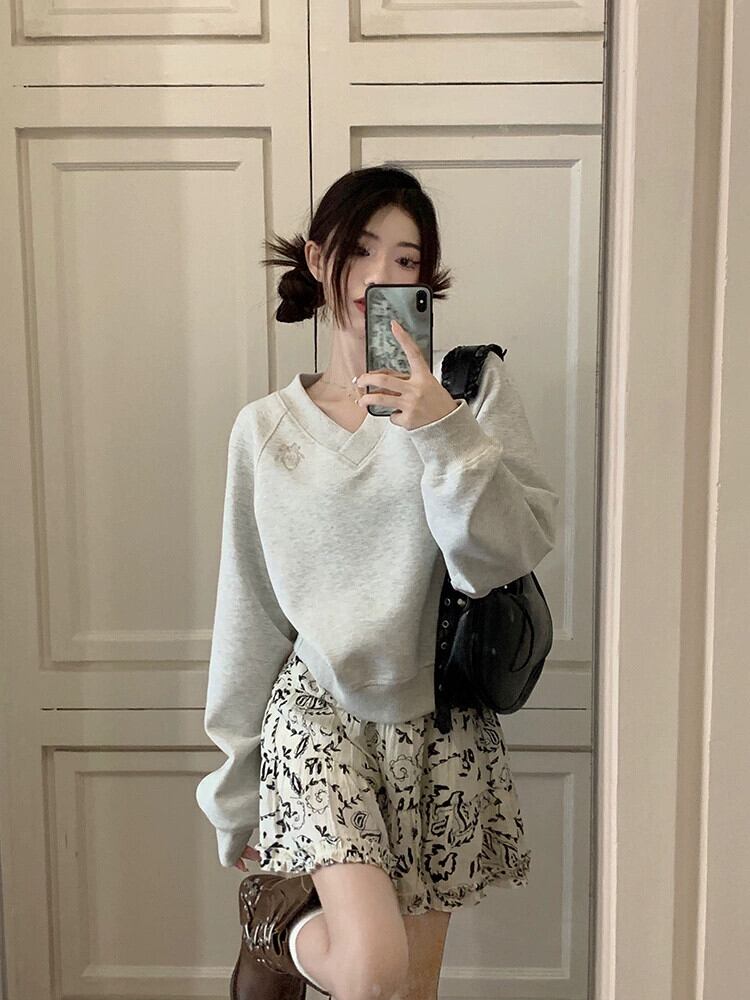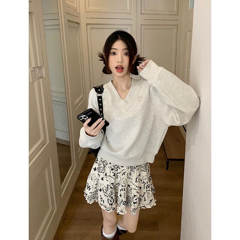 V ネック長袖トレーナー女性秋 2023 新しいカレッジスタイルのデザイン刺繍ルーズショートプルオーバートップイン ロング レッド オータム 秋物 Vネック missk67249532092