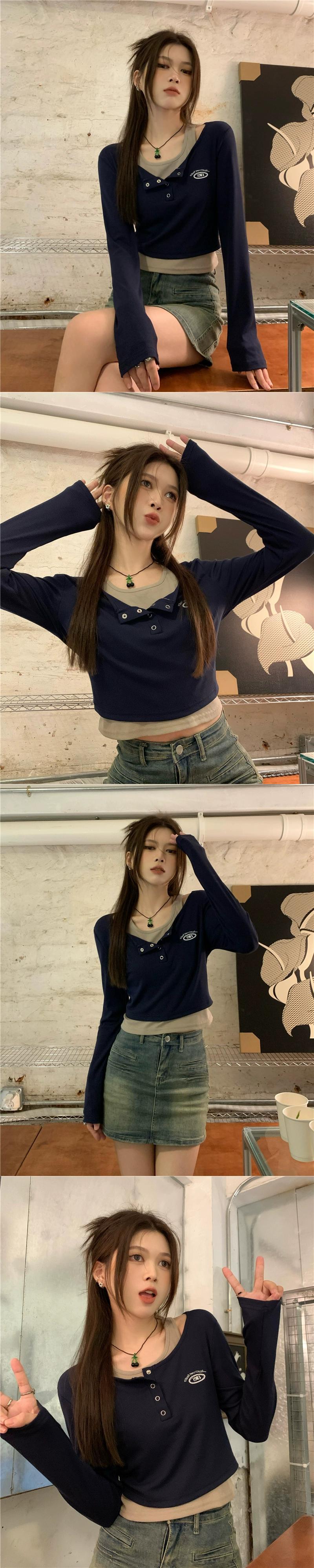 偽のツーピーススプライシング長袖Tシャツの女性の秋の新しいアメリカンレトロなデザイン、スリムで気質のトレンディなトップ ロング オータム 秋物 missk51307986013