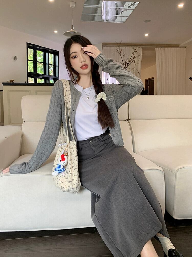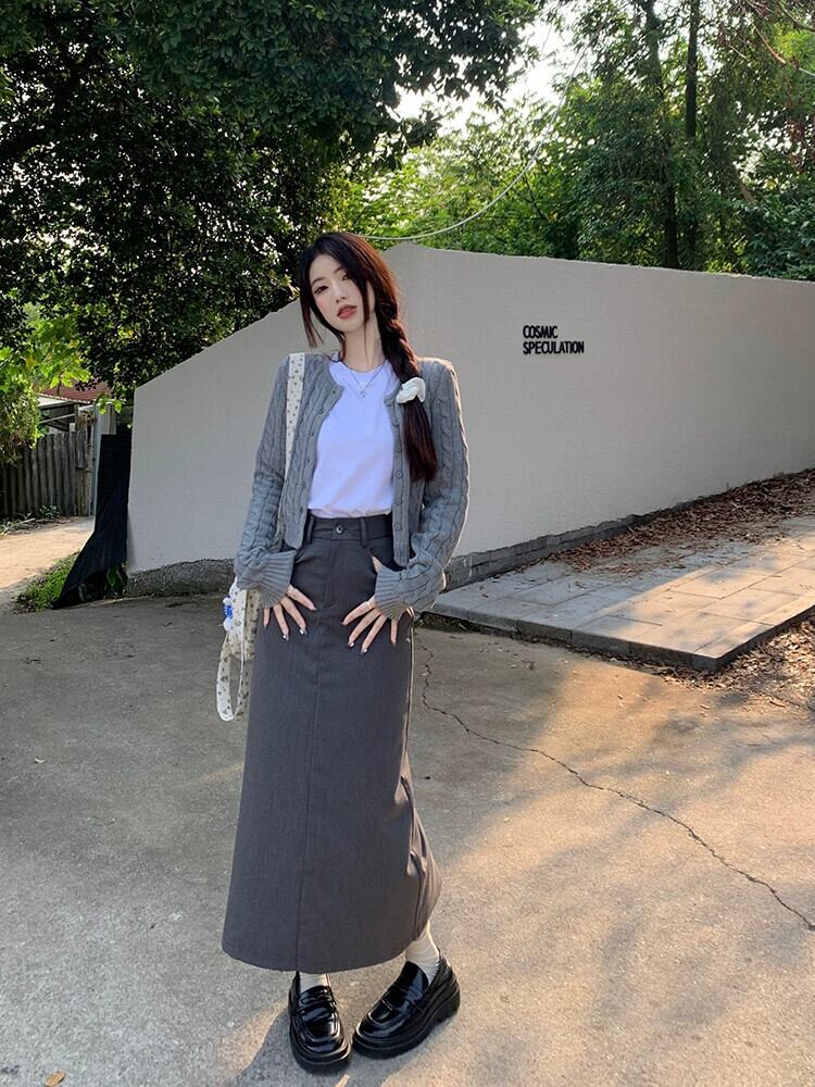 色:グレーのセーター,グレースカート,内側に白いTシャツ