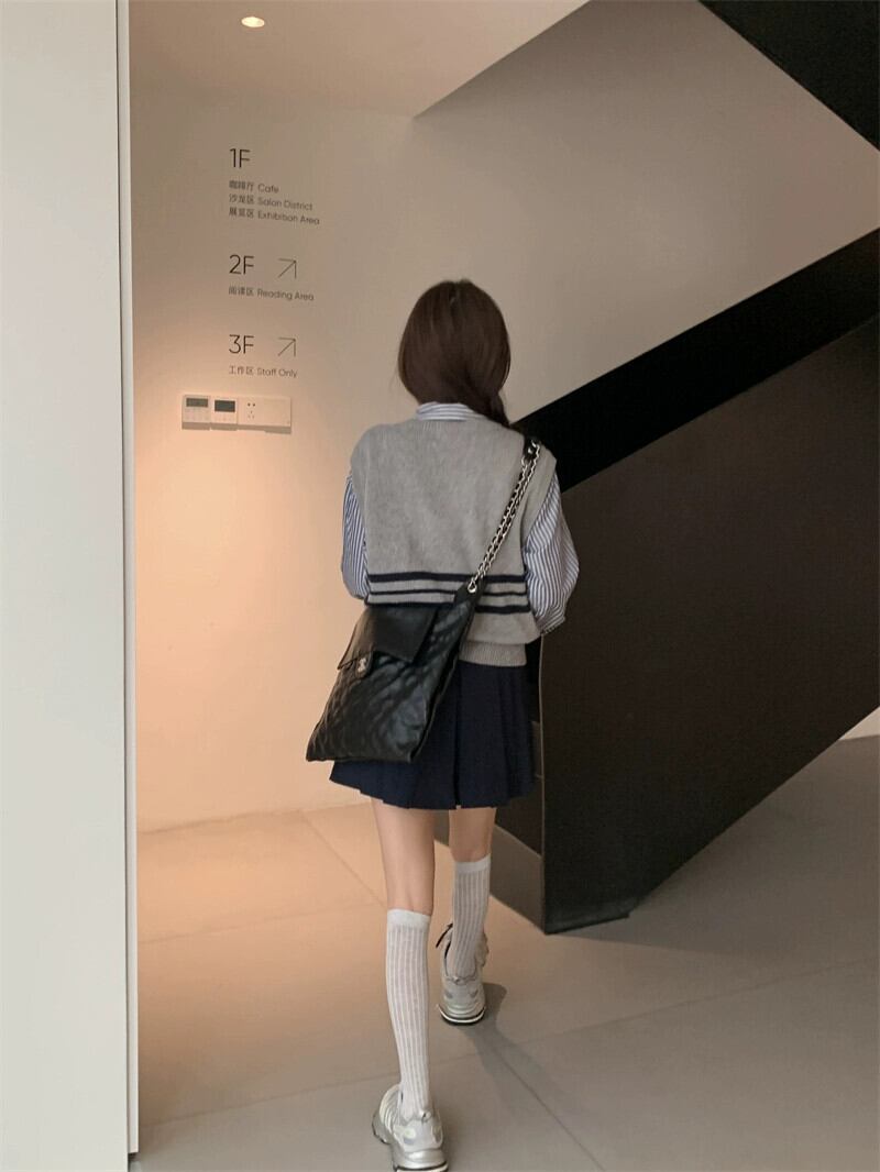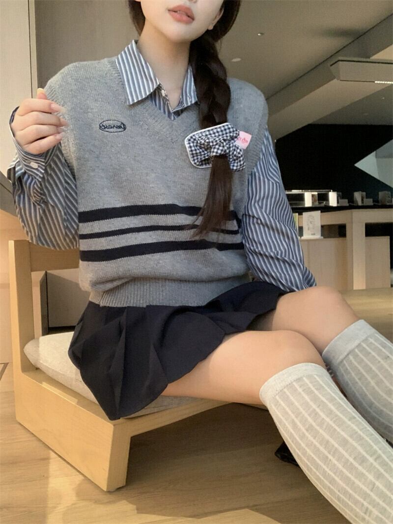色:グレーのベスト,ブルーストライプシャツ,青いスカートs,青いスカートm,ブルースカートL,ブルースカートXL