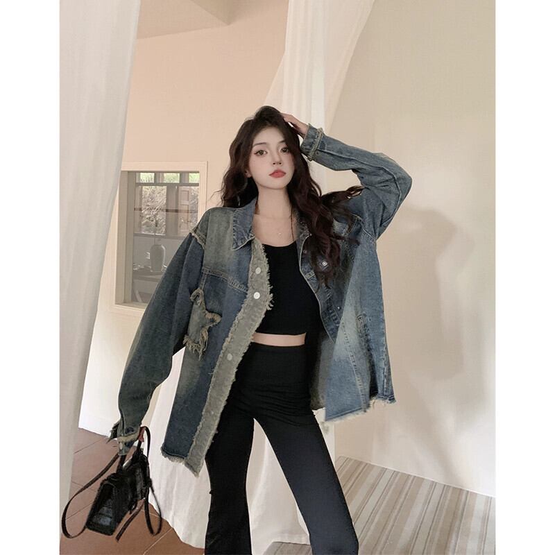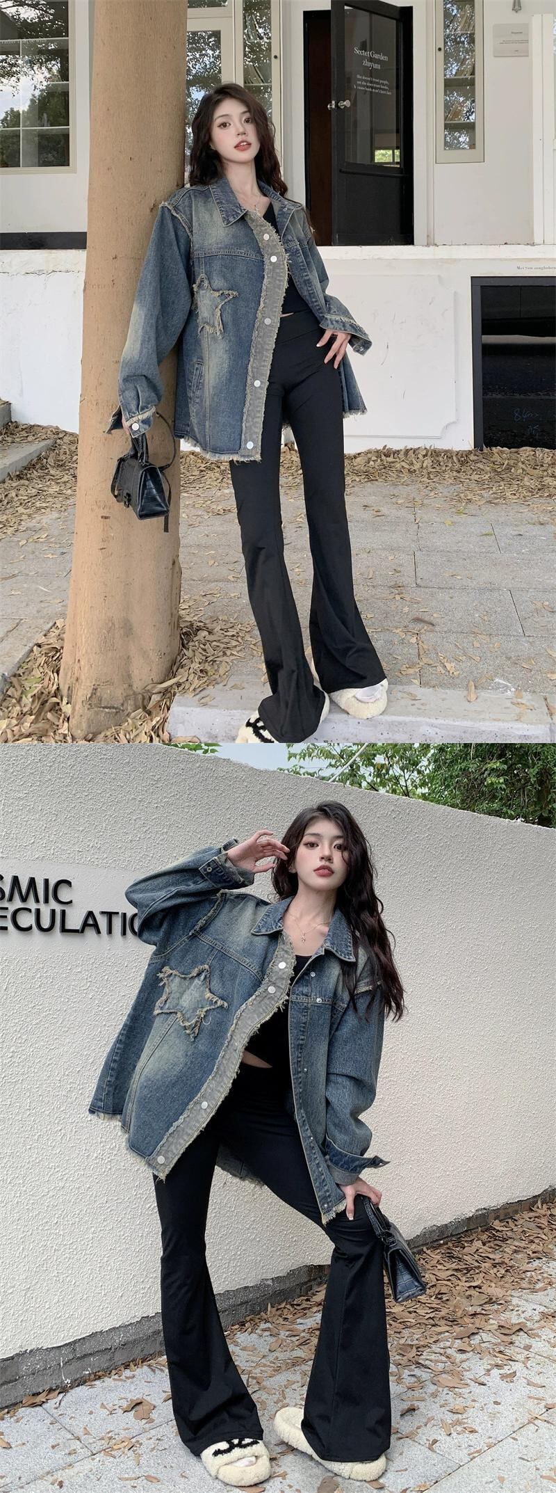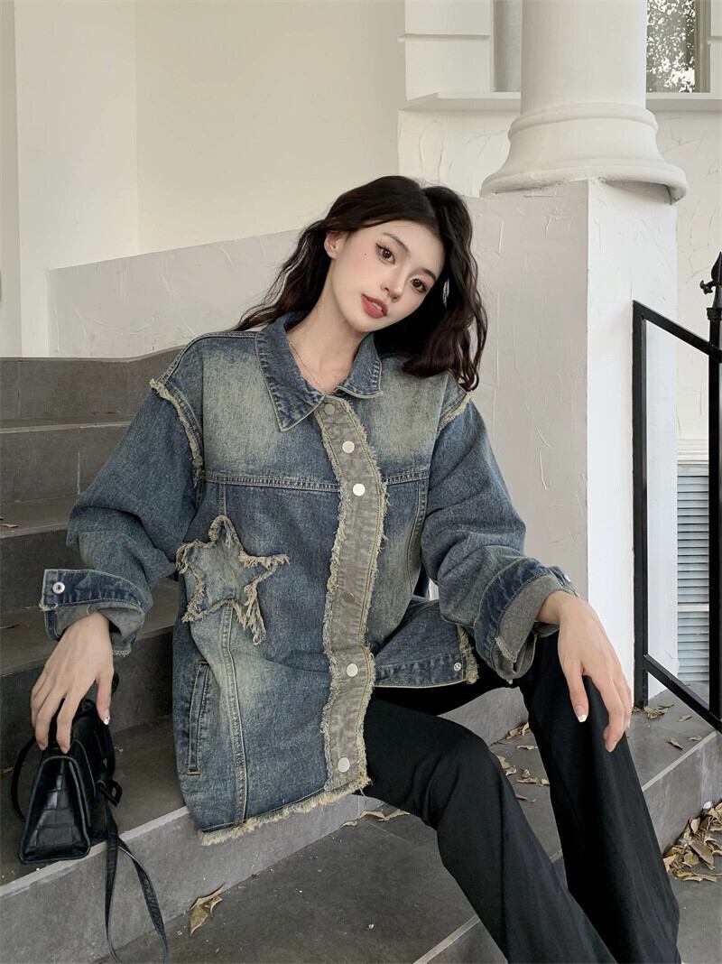 アメリカンスターパッチデニムジャケットの女性の秋2023新デザインルーズミッドレングス長袖トップトレンディな ロング オータム 秋物 missk53461634040