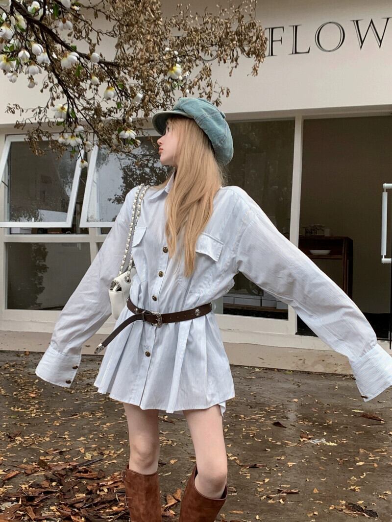 色:ブルーストライプシャツワンピース+ベルト