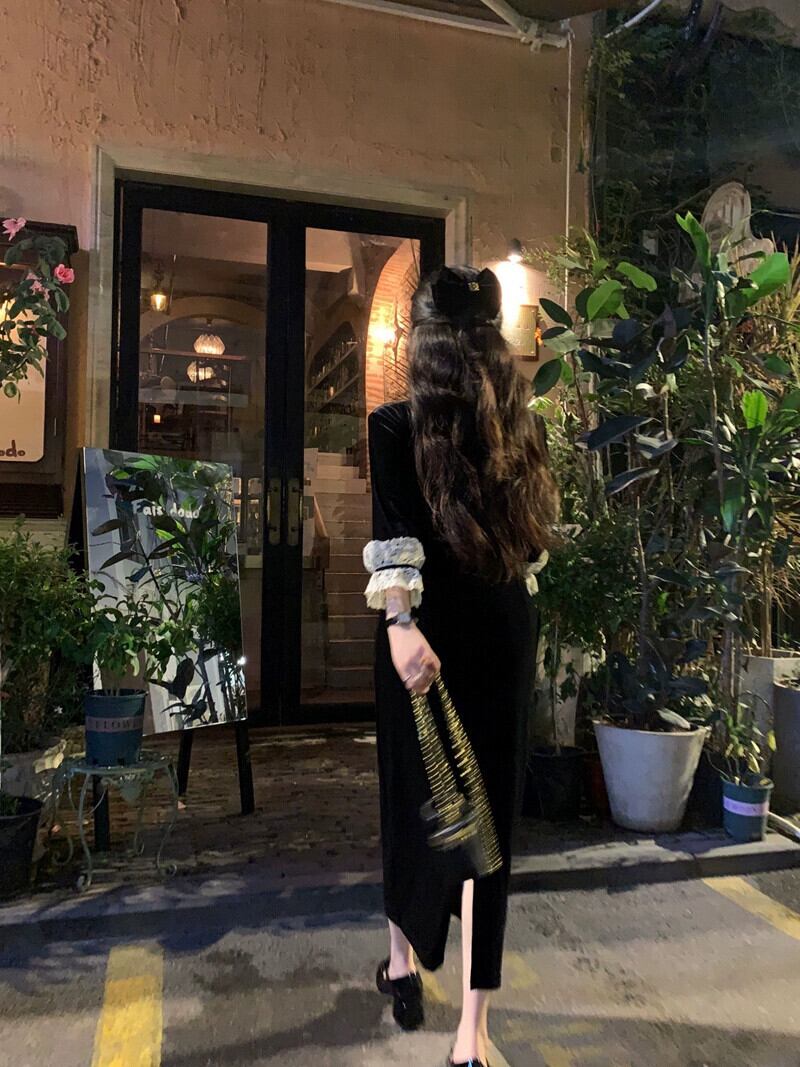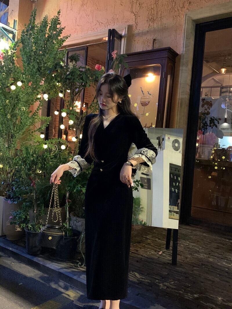 ヘップバーンスタイルベルベット長袖ドレス女性秋 2023 新しいフランスのハイエンドウエスト痩身ロングドレス オータム 秋物 missk68526152676