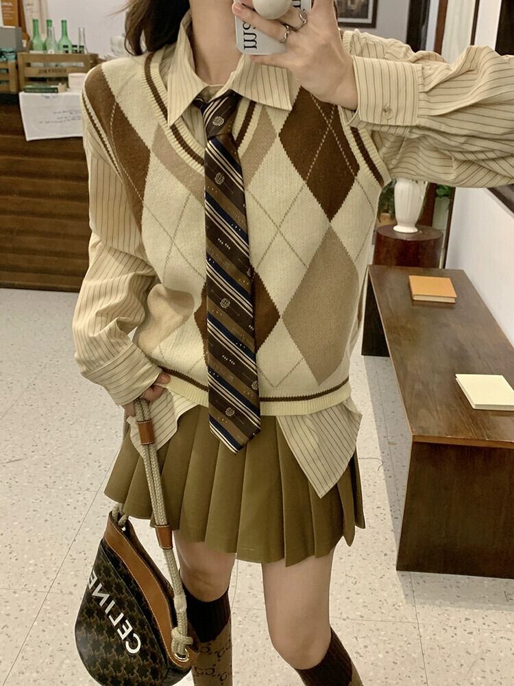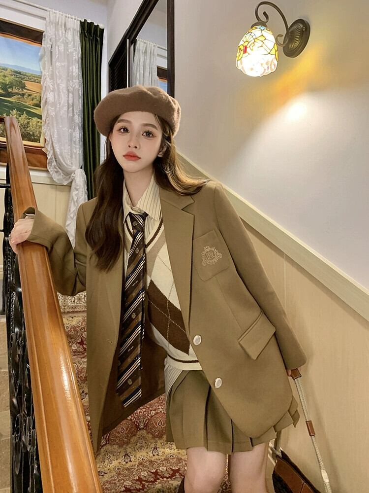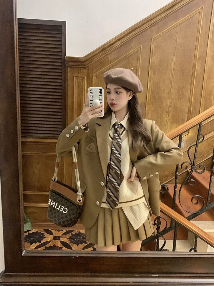 色:カーキプリーツスカート,カーキブレザー,アプリコットボトムコーヒーベスト,カーキのシャツとネクタイ