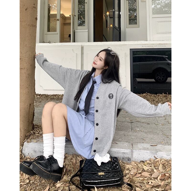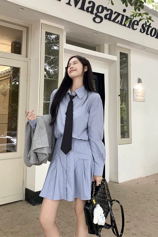 色:ストライプシャツワンピース+ネクタイ,グレーコート
