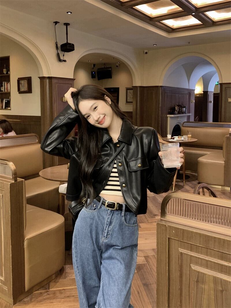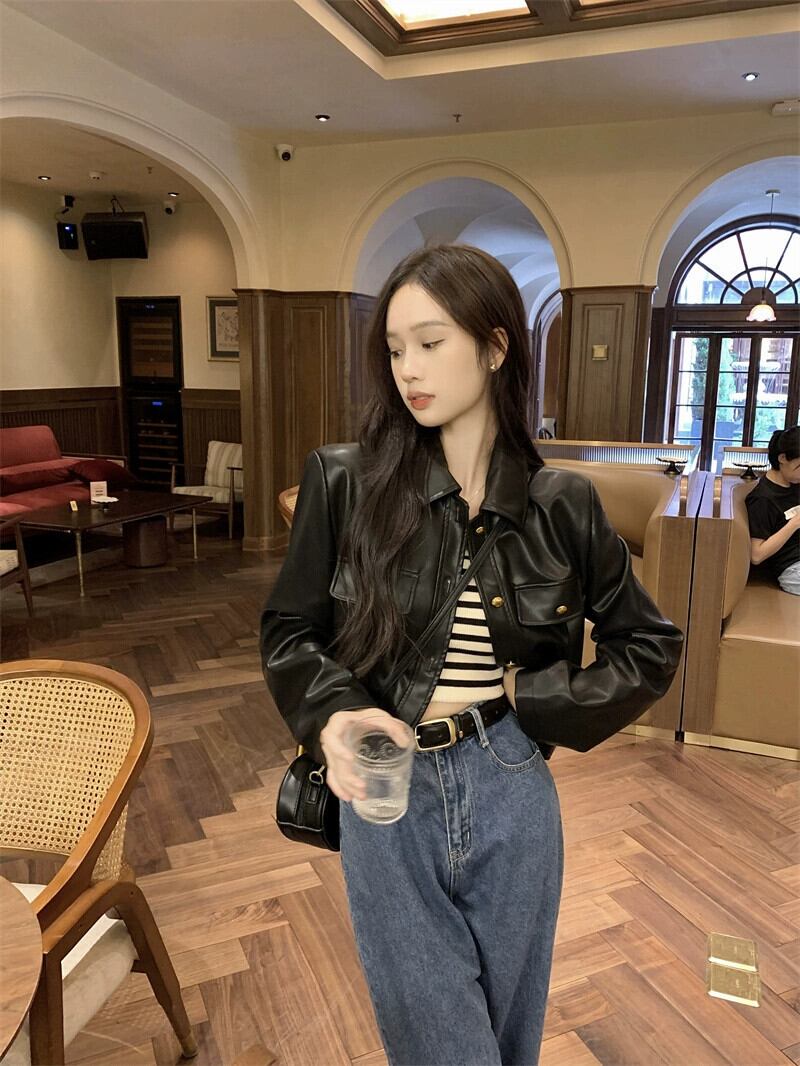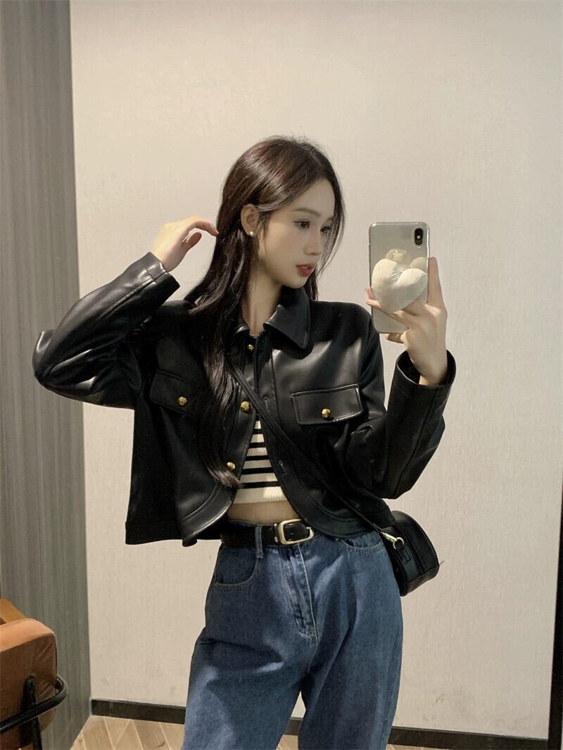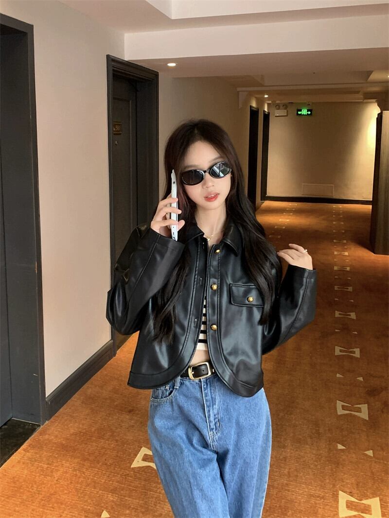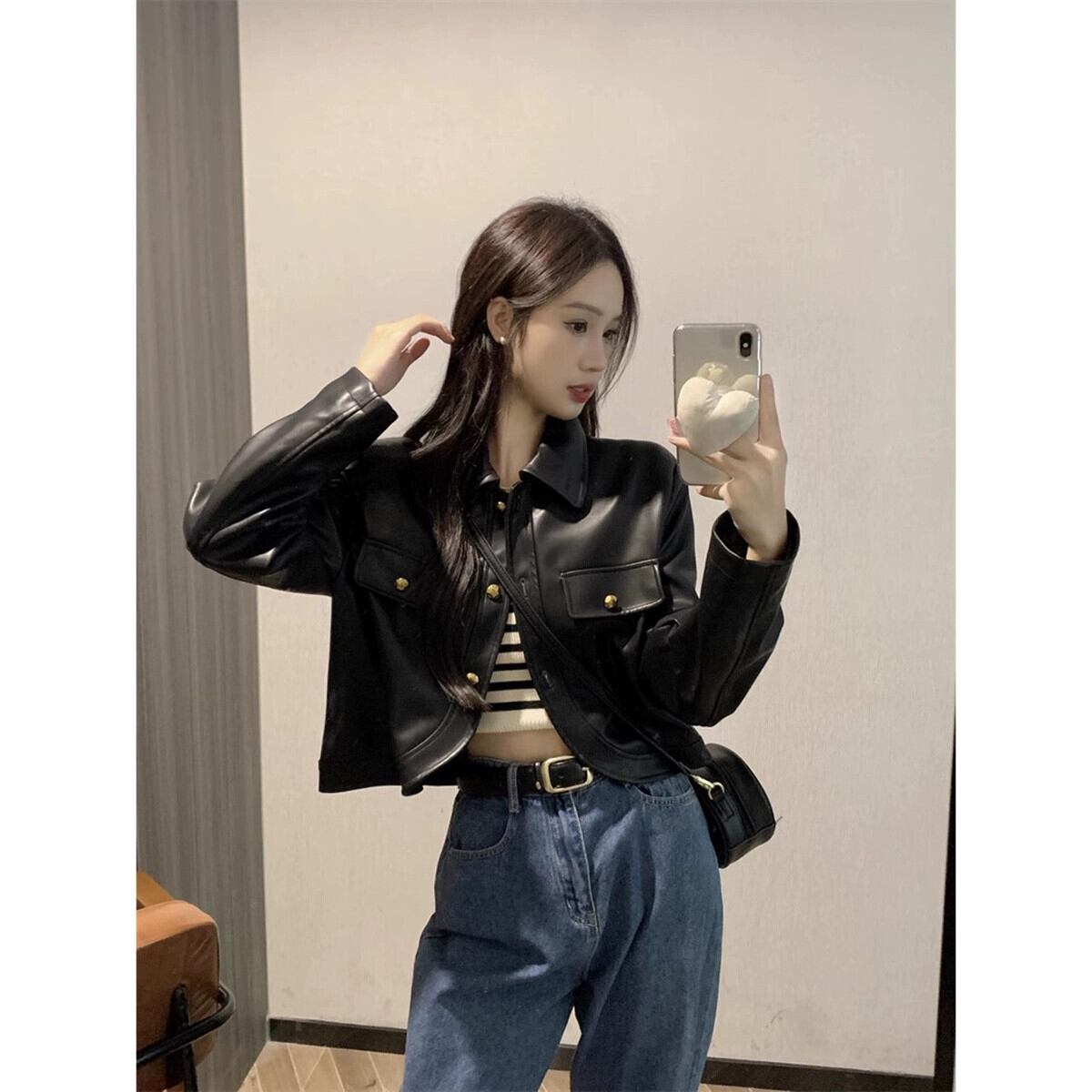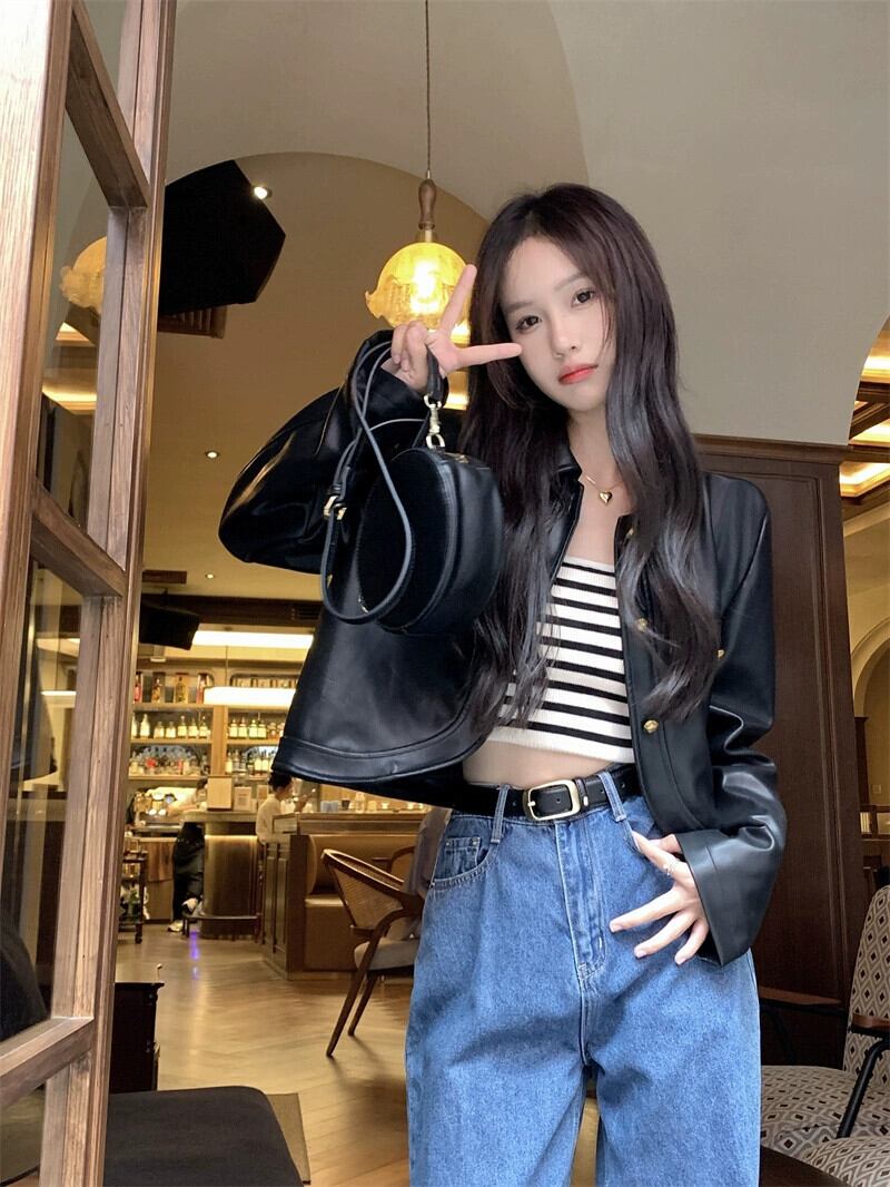 2023 初秋の新スタイルのハイエンドシックなメタルバックル PU レザーオートバイのジャケット黒長袖ジャケットの女性 ロング ブラック オータム 秋物 missk72712098853
