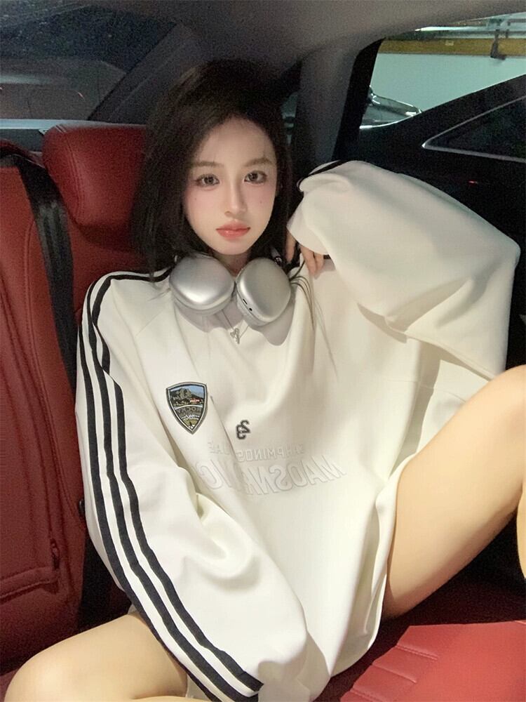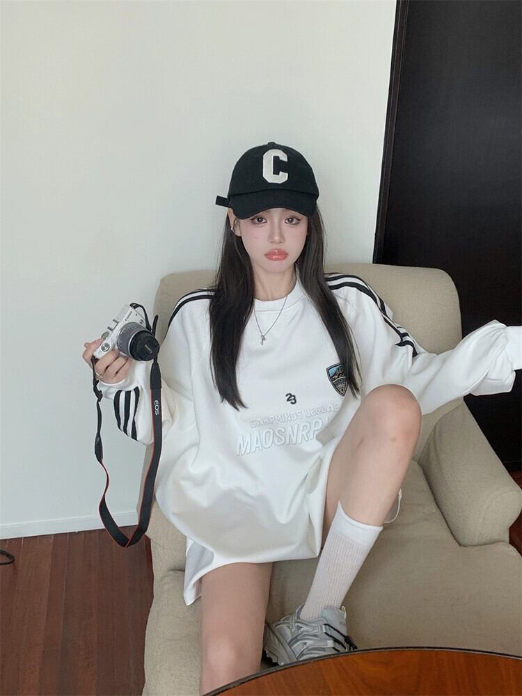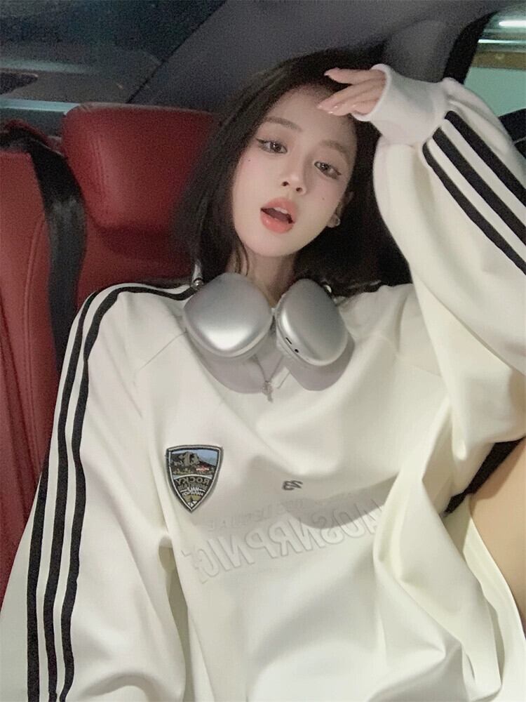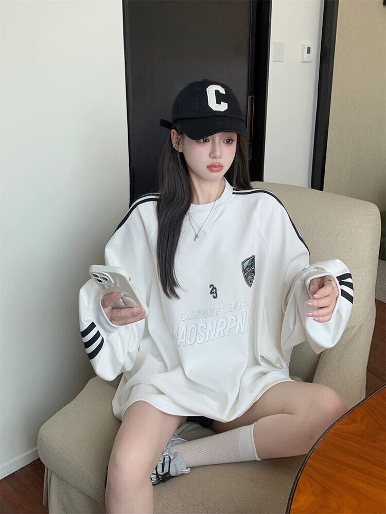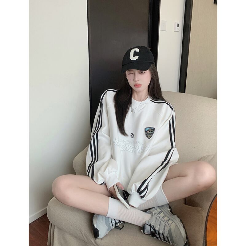 アメリカのコントラストカラー長袖スウェットシャツ女性秋 2023 新しいストライププリントルーズミッドレングス多目的スポーツトップ ロング オータム 秋物 missk19835983825